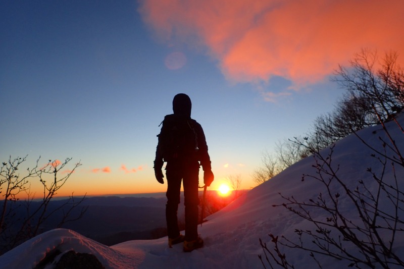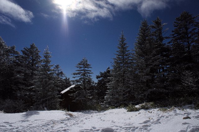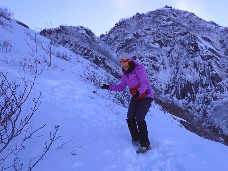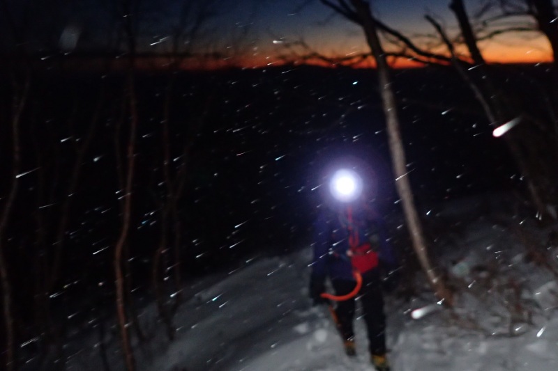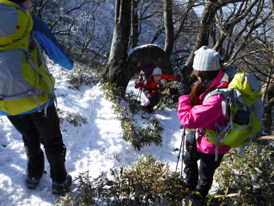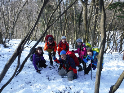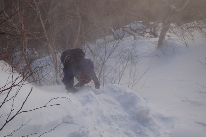 初日は駐車場では晴れていたものの、寒波襲来で強風の中の登高になりました。