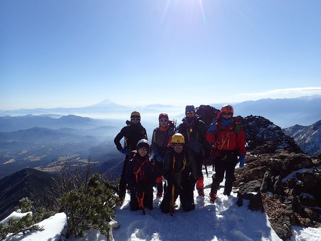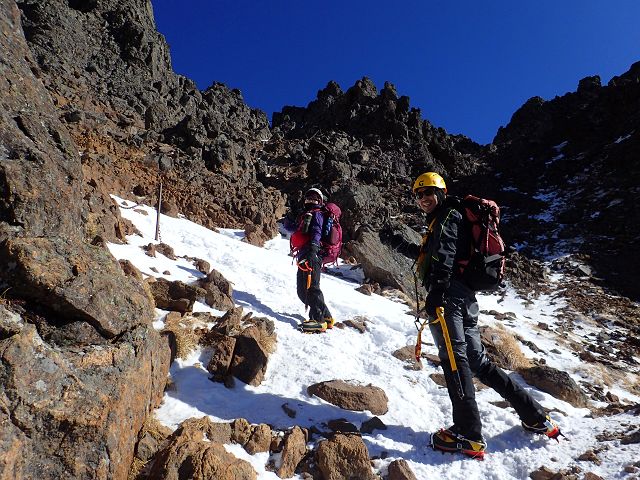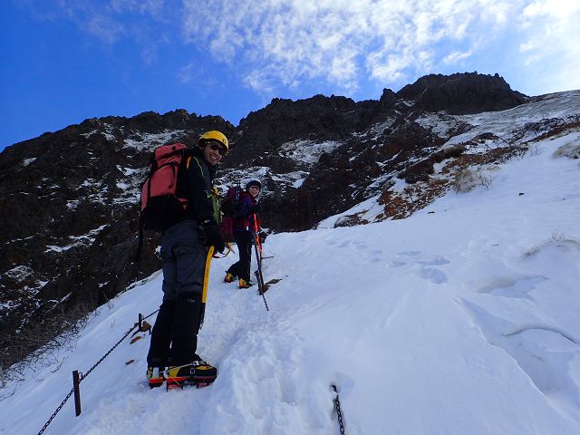 雪は思ったよりも少なかったですが、ミックス状態の斜面はいいアイゼン歩行の練習になったかな。