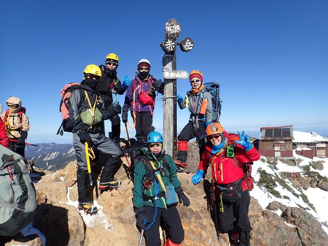 初アイゼンの新人さんを含むパーティーで日帰り赤岳はちょっと厳しいかなと思いましたが、気持ちのいい青空、キリっと冷えた冬の空気の中、楽しく歩けました。