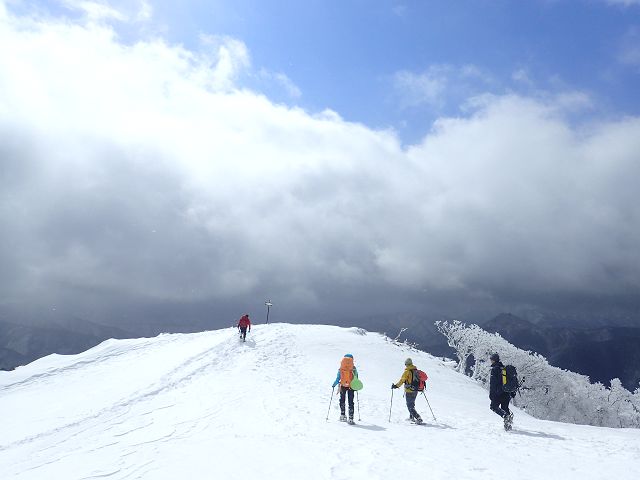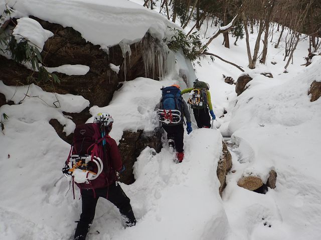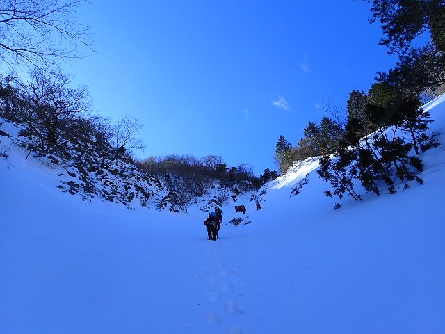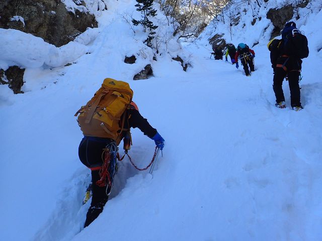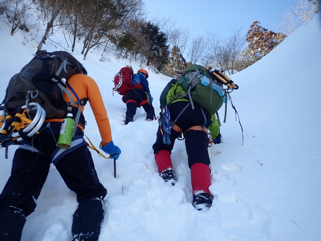 1枚目:凍った三ツ口大滝 2枚目:雪度埋まった谷をラッセル 3枚目:ダイレクトルンゼをラッセル(5分交代制) 4枚目:鳥居が半分以上埋まった鎌ヶ岳山頂 |