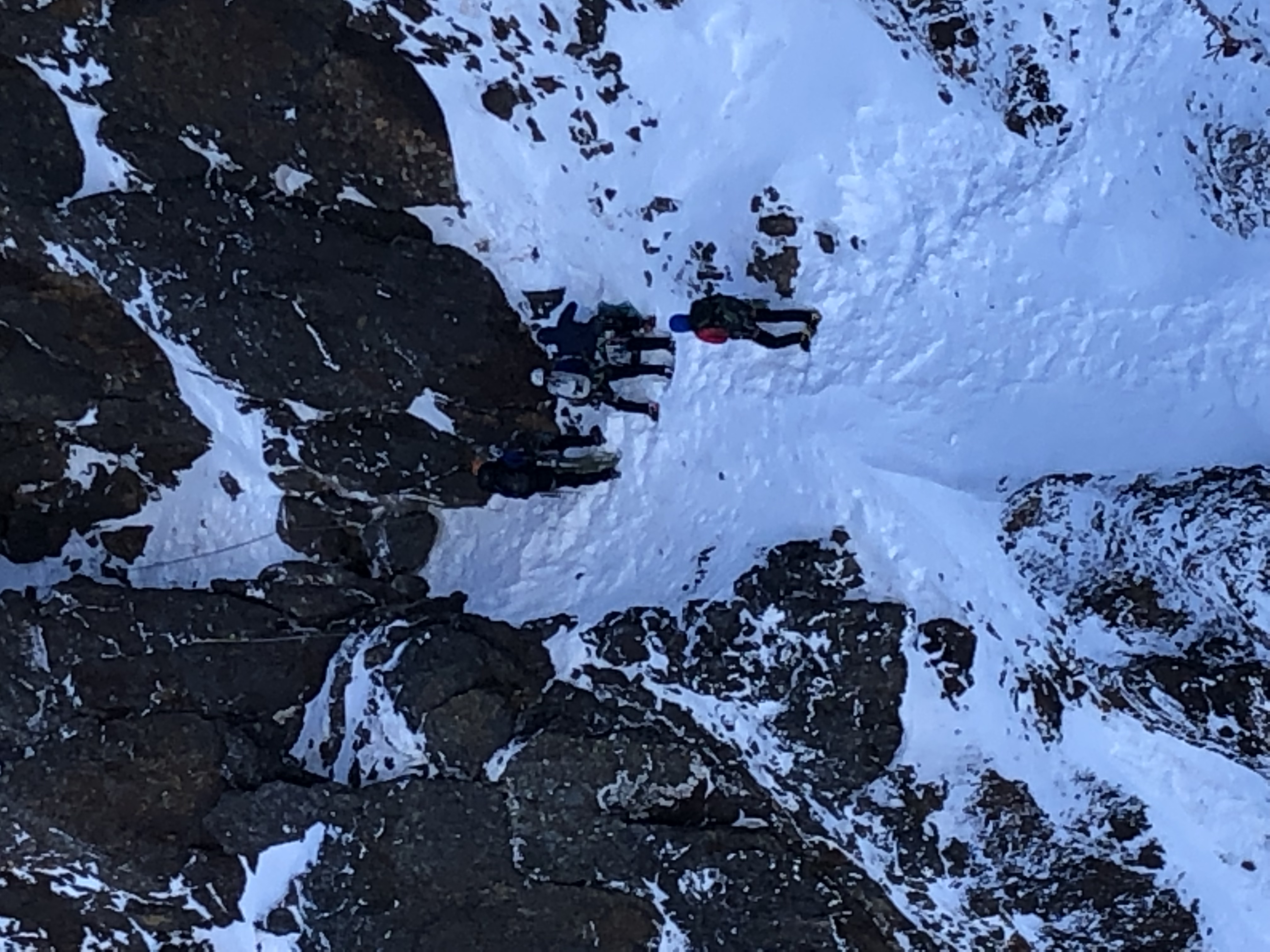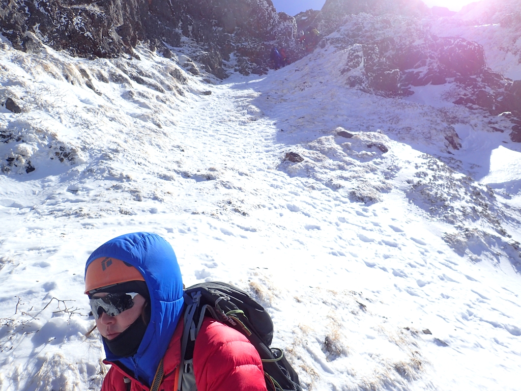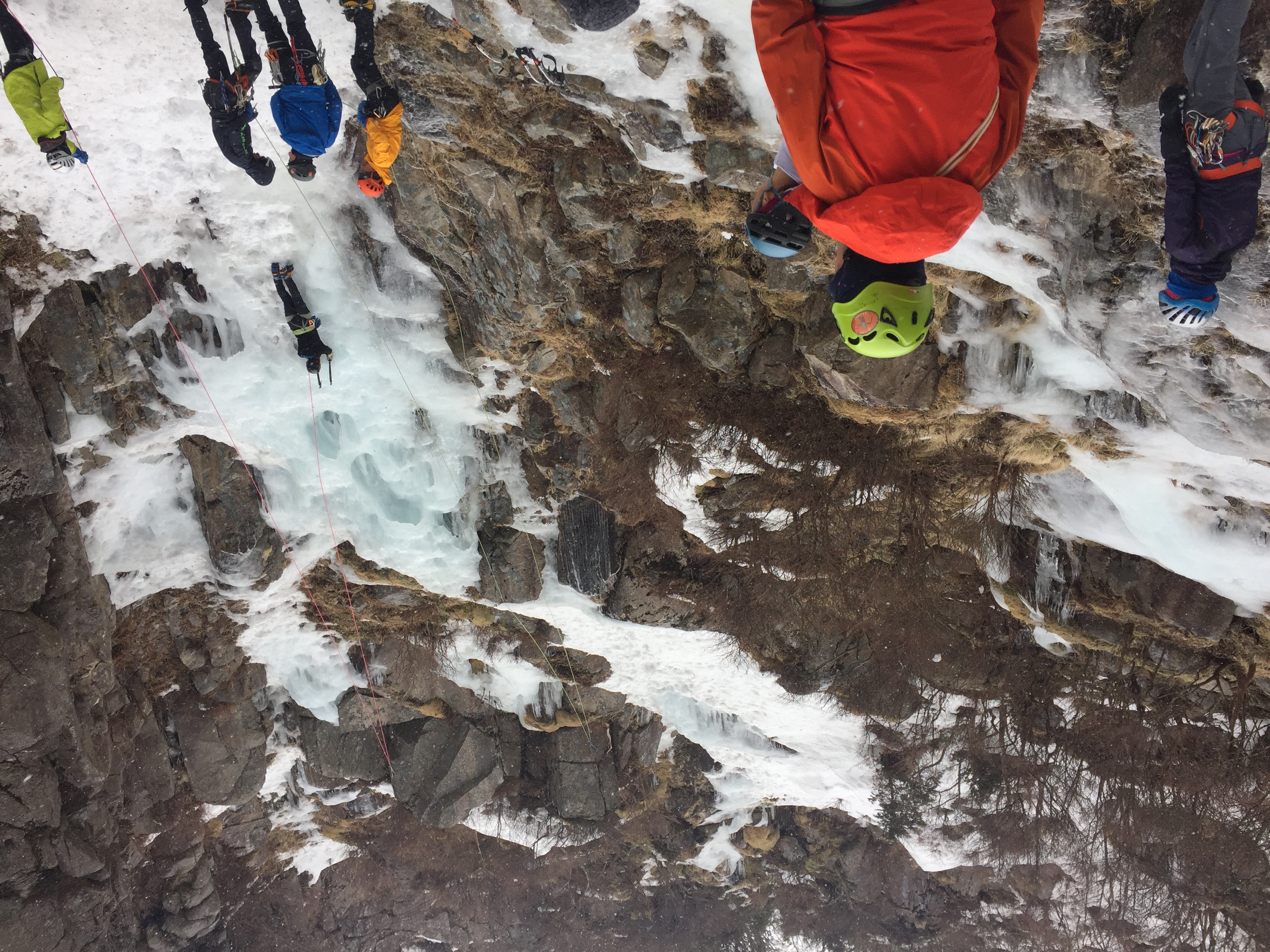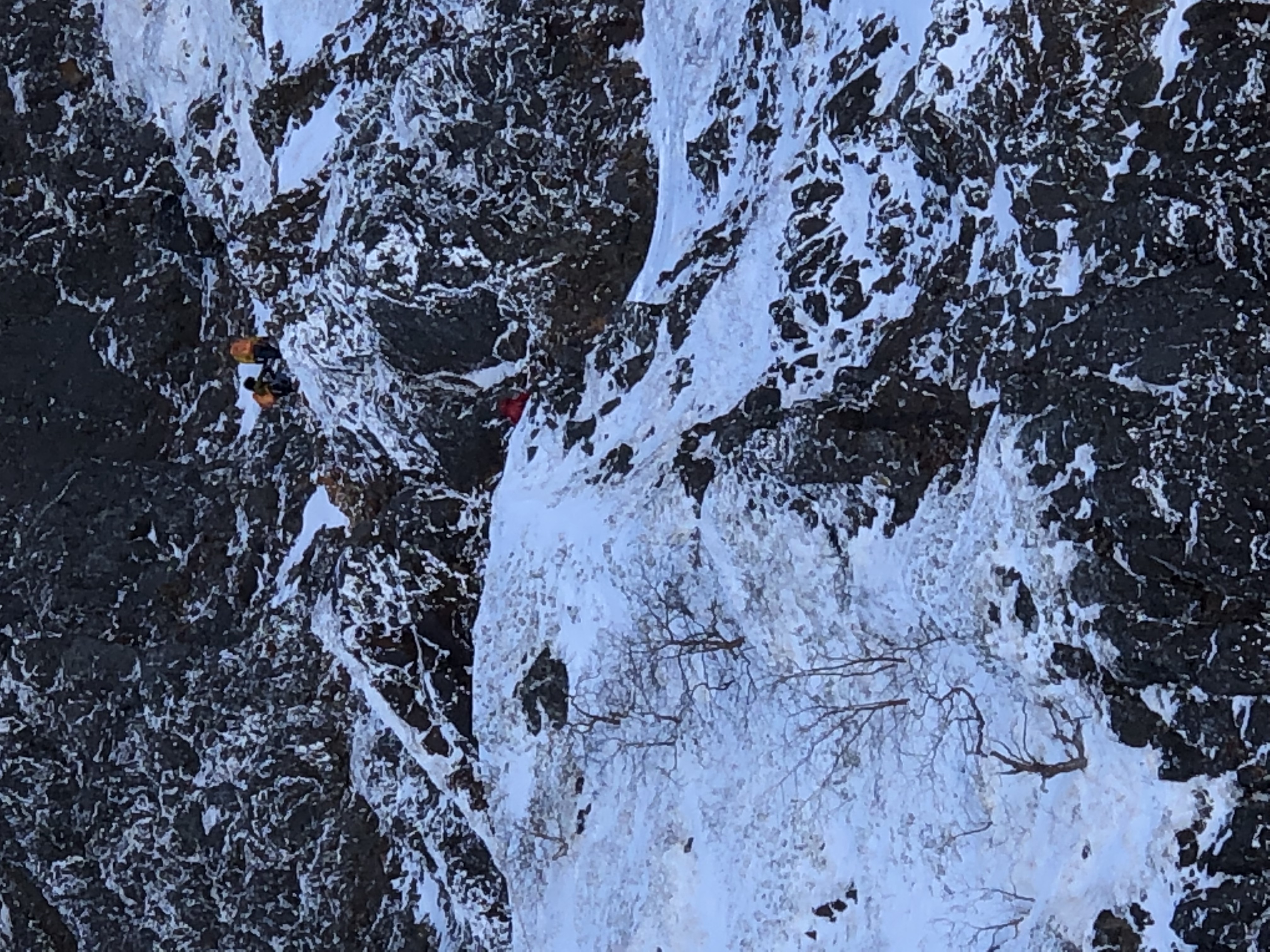 左側のルートを行くパーティ、かなりもろいらしく氷がどんどん落ちてくる。 その後どんどんパーティが増えて3ルンゼ大渋滞。 早めに着いていた私達は早く引かなきゃなぁって…何となくその圧に負け撤収〜笑 でもしっかり楽しんだので満足。