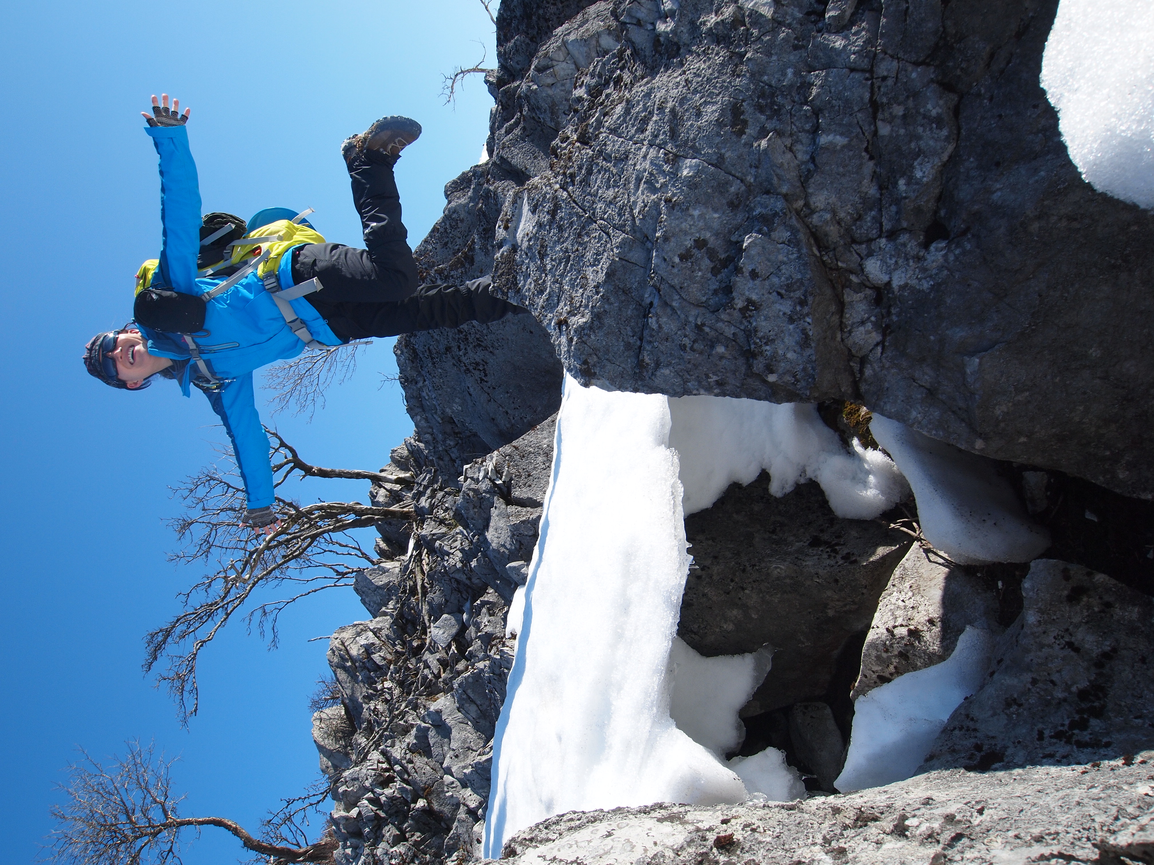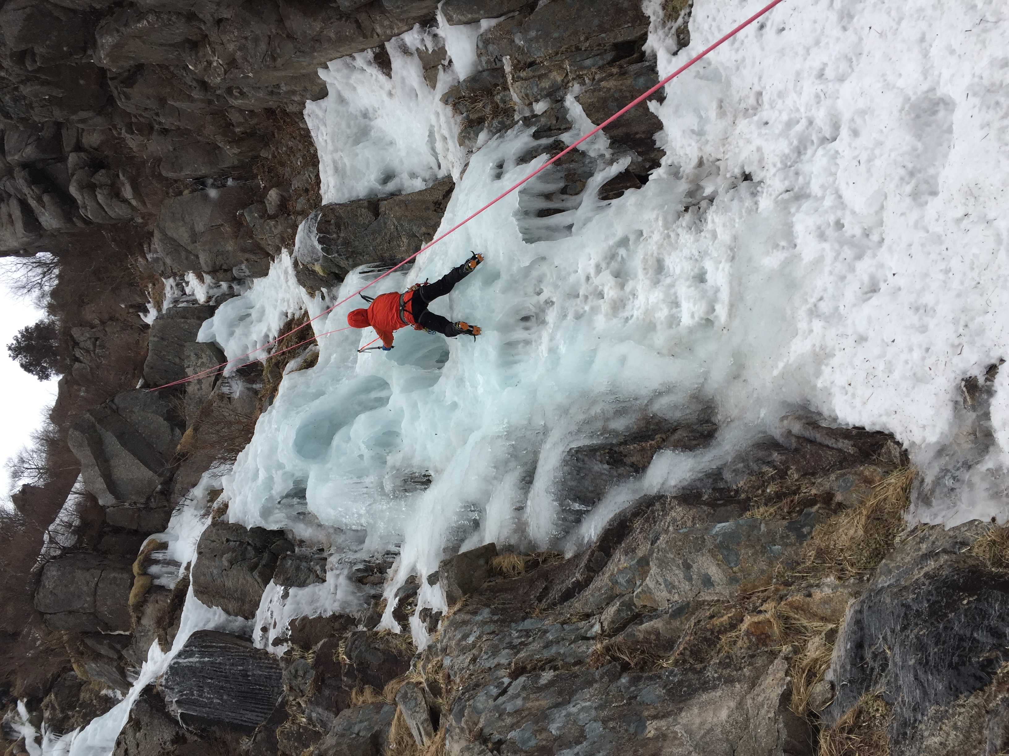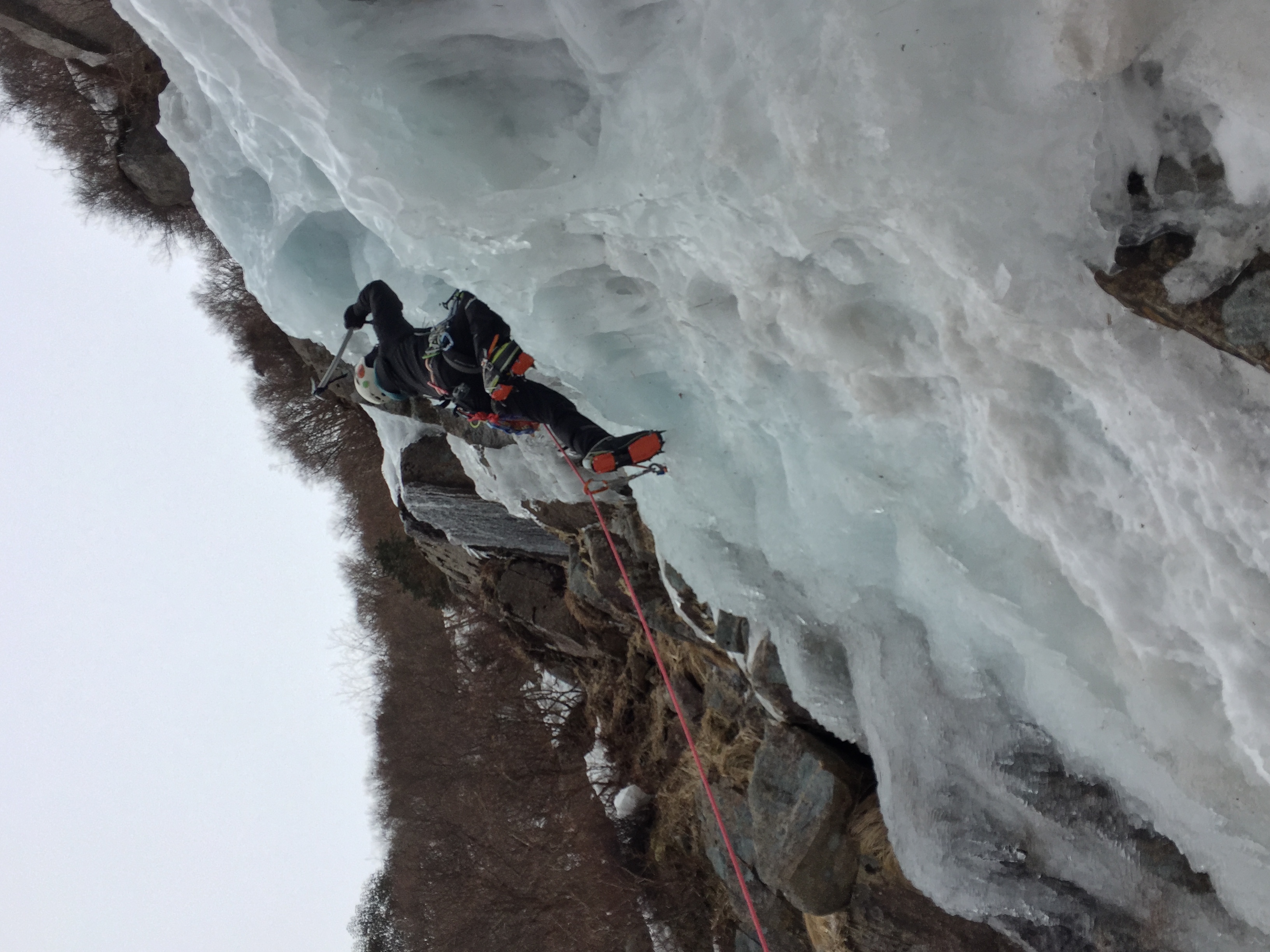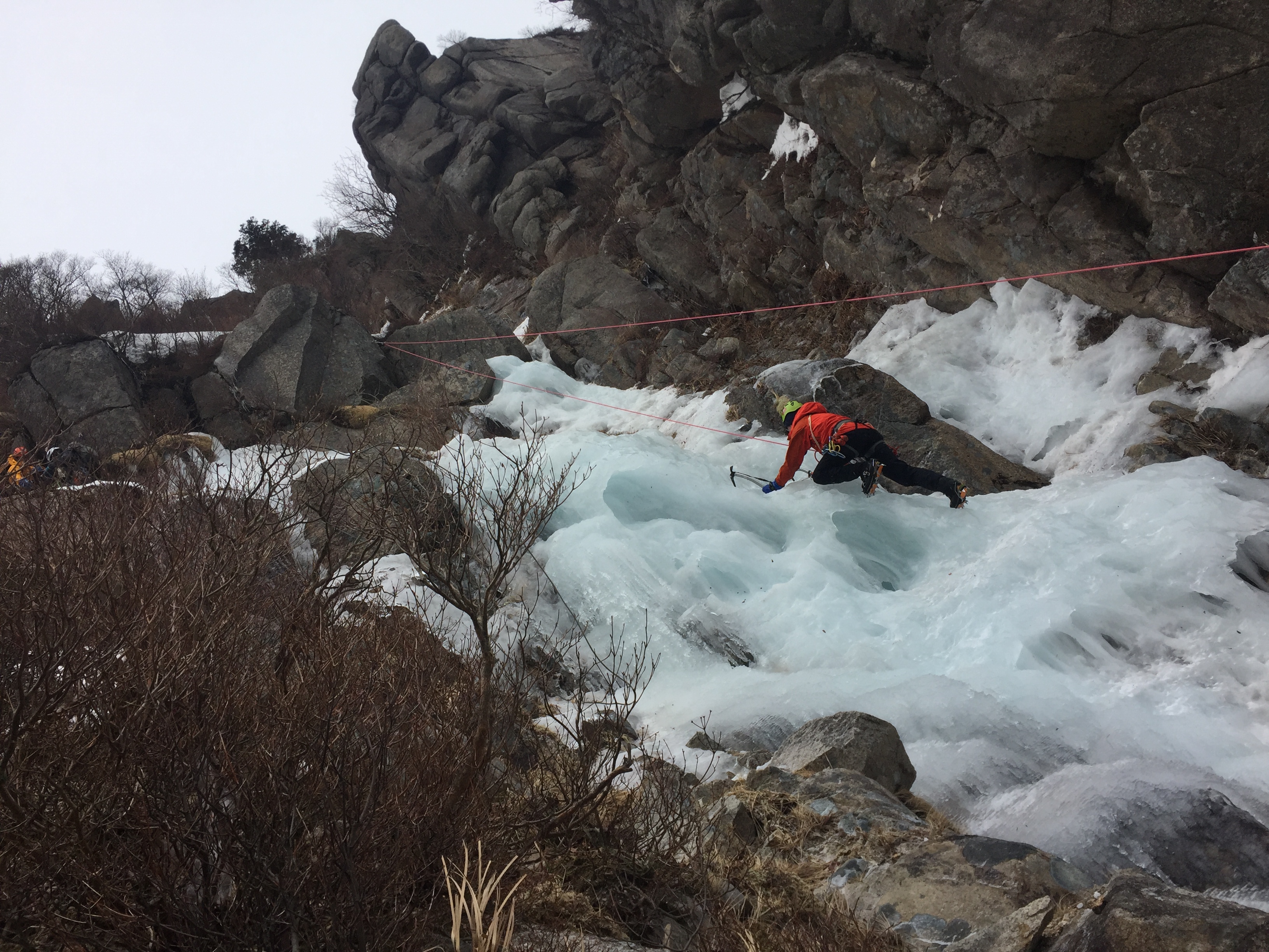 昨日は風もなく、寒くもなく、絶好のアイス日和でしたが、氷が、、、 ここ数日の陽気でかなり溶けてしまっていました。 3本あるルートのうち左のルートは氷の裏に水が流れており、かなり危ない状況。真ん中から上がって、右の終了点でトップロープの支点を構築。 それから各自4本程度登ってお昼に。 後から来た人が、『登らせて下さいってことになり、代わる代わる登りだす。そうこうしている間に風が出てきて、『もう帰ろか〜』 もう少し遊びたかったので、もう一回チャンスをうかがいたい。 |