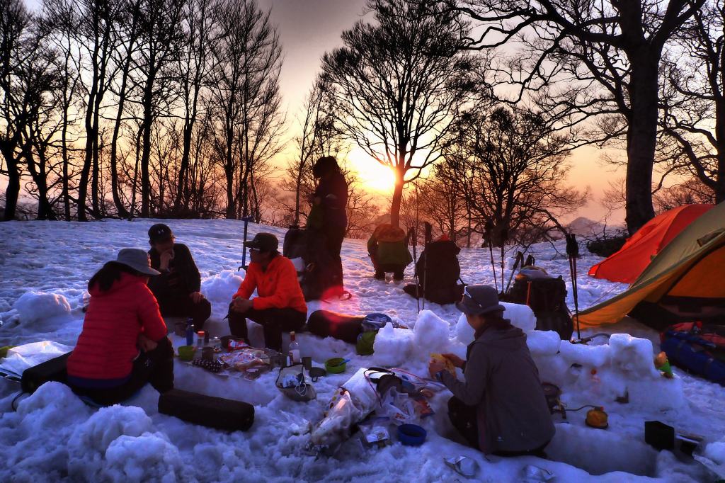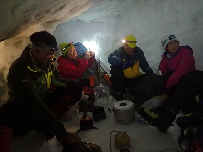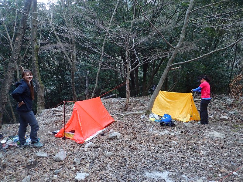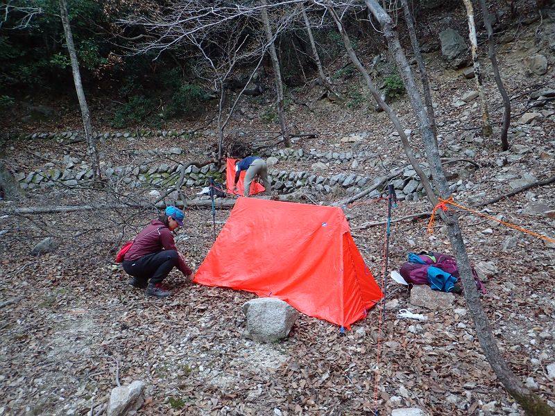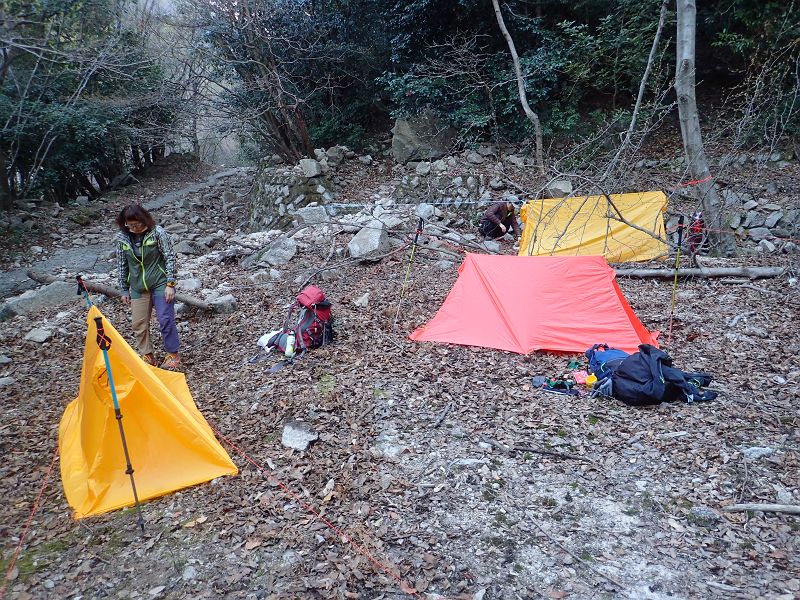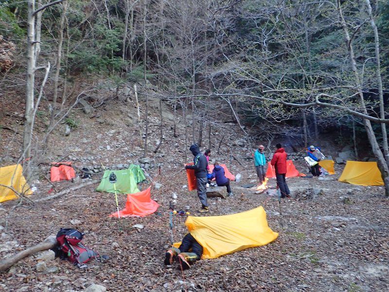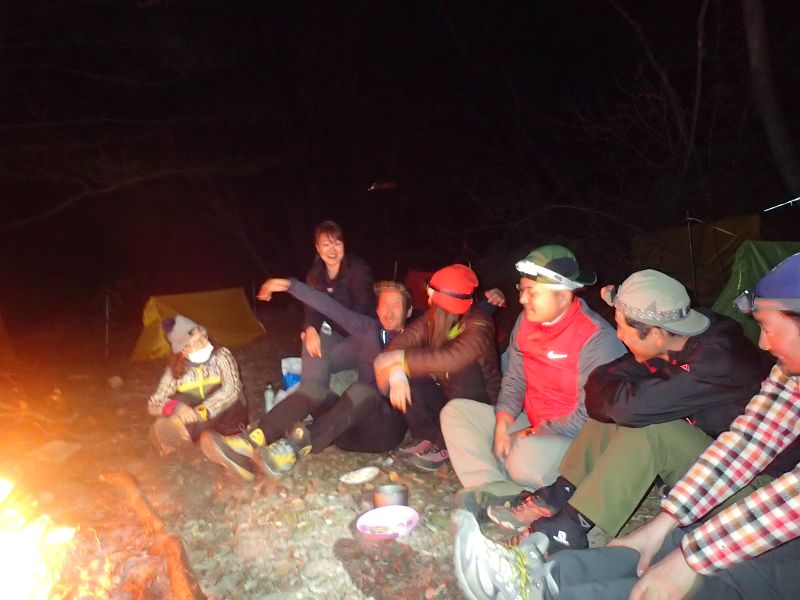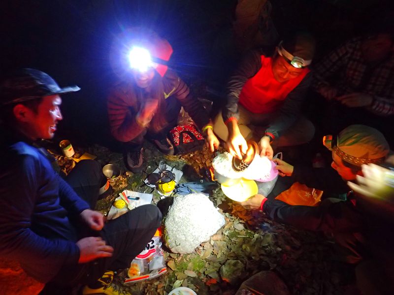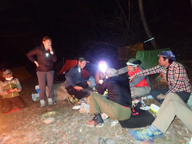 都合により後から合流させてもらう為、やっさんと二人でヘッデン歩き30分。到着したビバーク会場はすでに出来上がった人たちで盛り上がっていました(^^;)