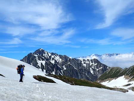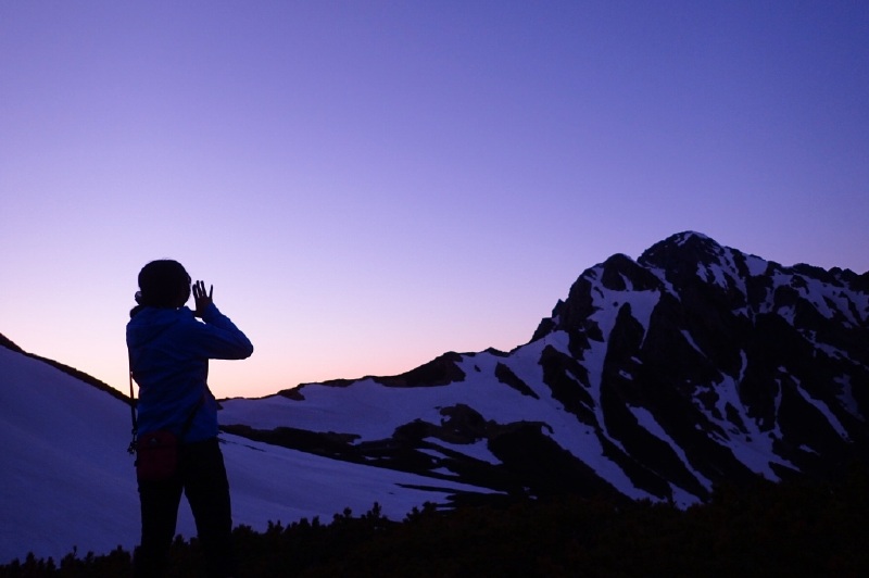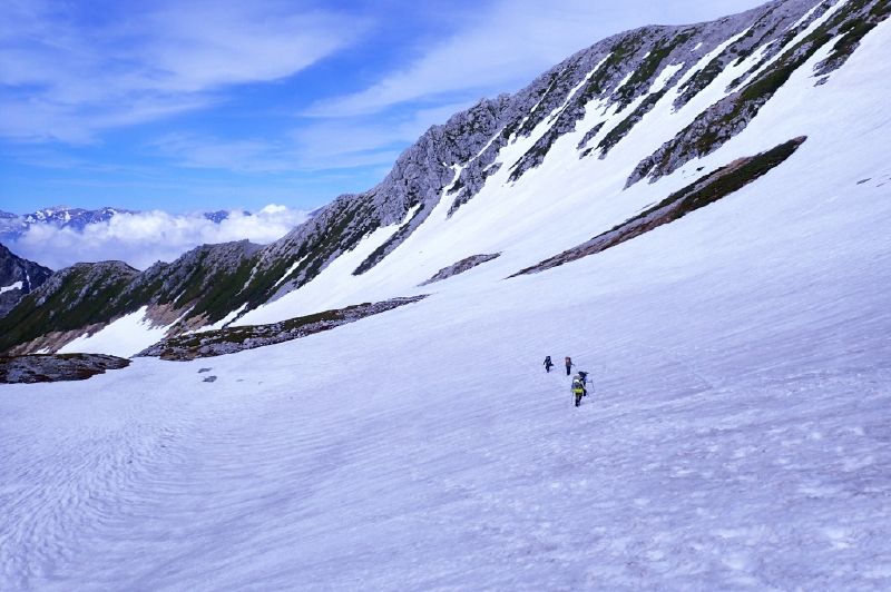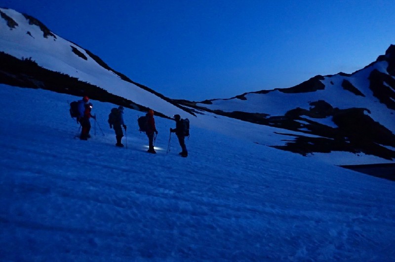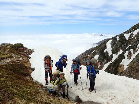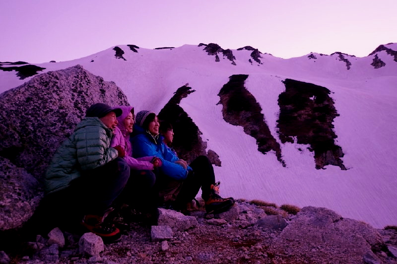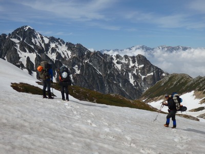 天気予報にドキドキ! 2日目の標高差1500mにドキドキ! スズハイ初、山泊山行にドキドキ! の3日間でしたが・・・ 良い天気、スケールの大きい雪渓、足の揃ったメンバー、料理上手の方々にすっかり興奮してしまいました。 特に、黎明の雪渓を下降するシーンを見てたら身震いするような感動を覚えました。 今回御一緒出来てとても嬉しかったです。