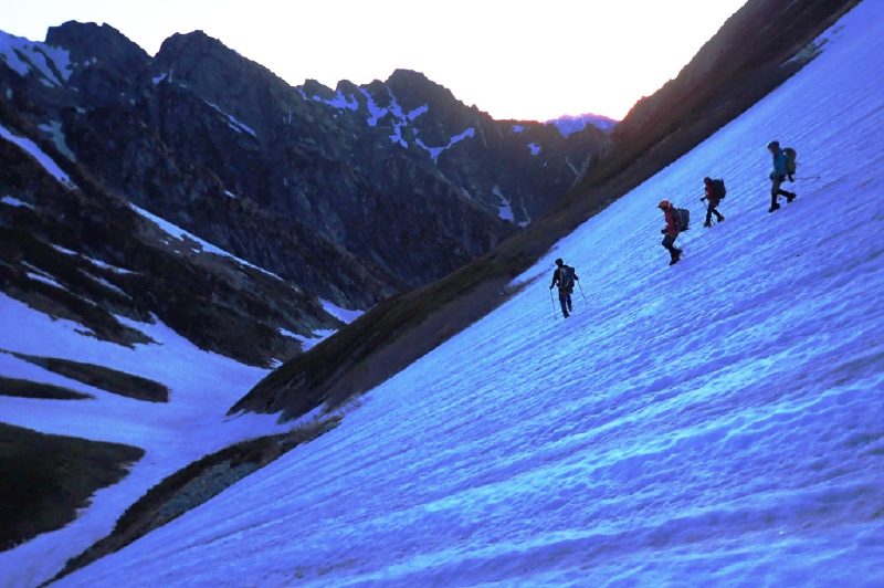 二日目、午後から雨模様という天気予報もあって、日の出前から 劔沢雪渓を下って長次郎谷へ。