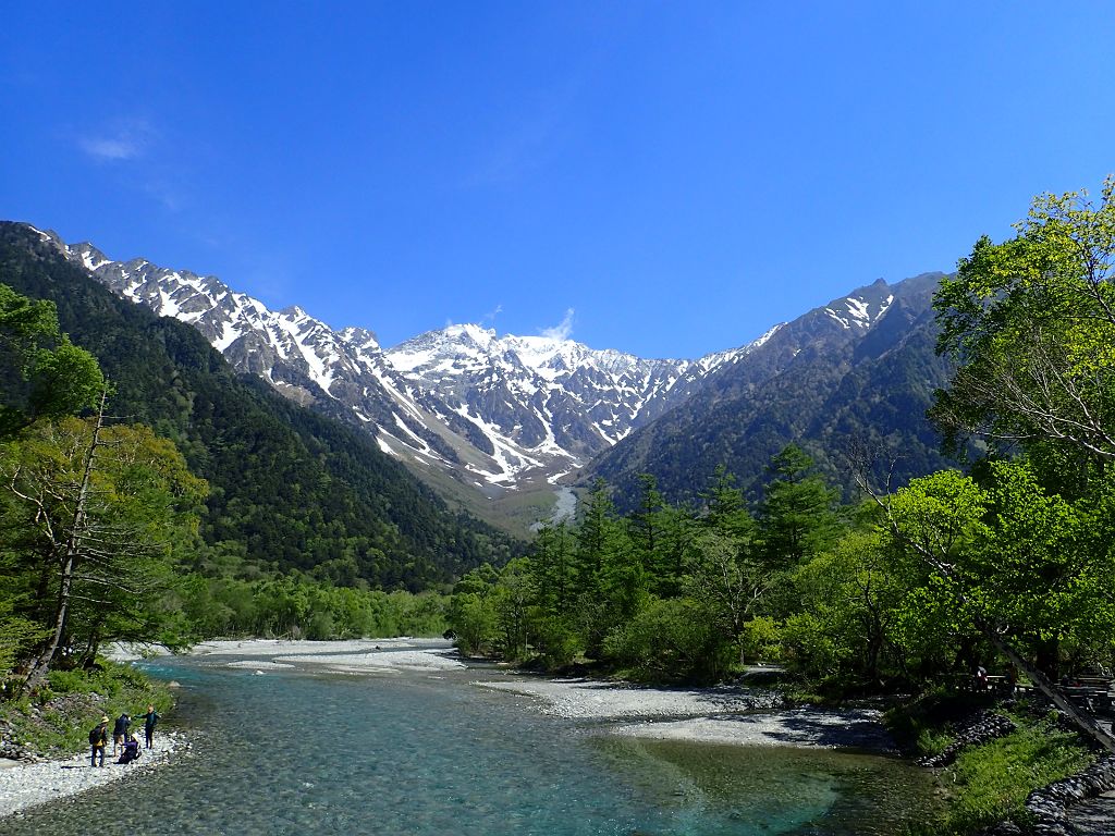 初日は快晴の下、ほんとに休日?ってほど人の少ない上高地から歩き始めます。徳沢にはニリンソウの大群落が。