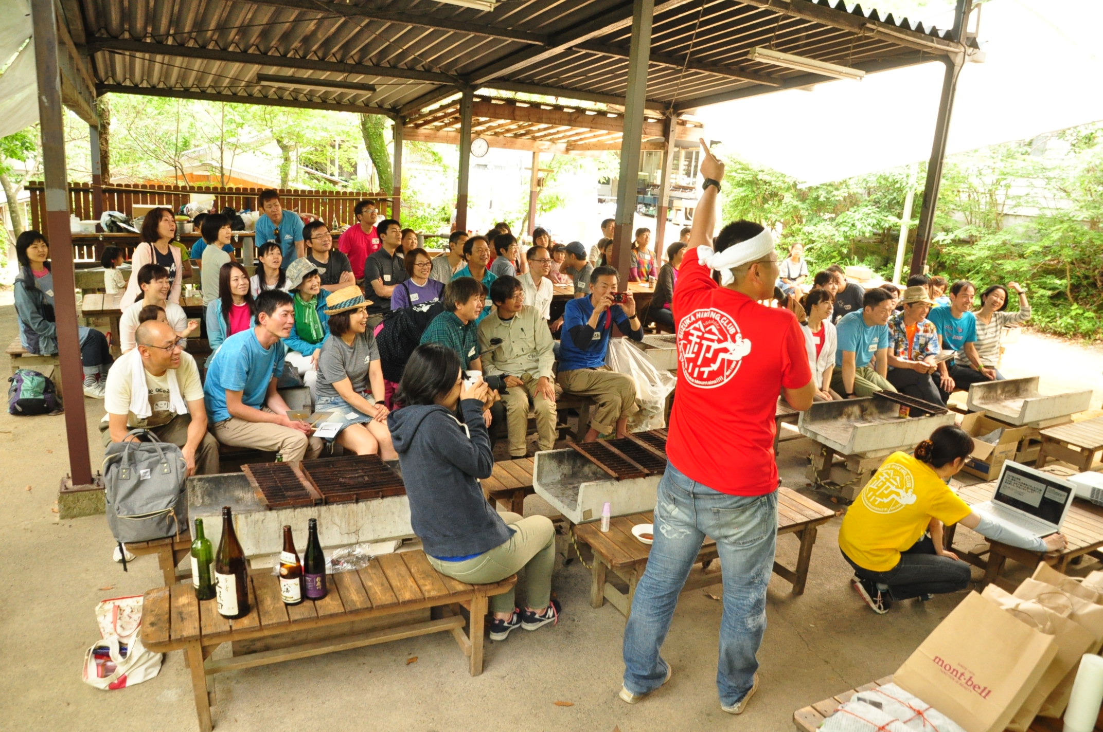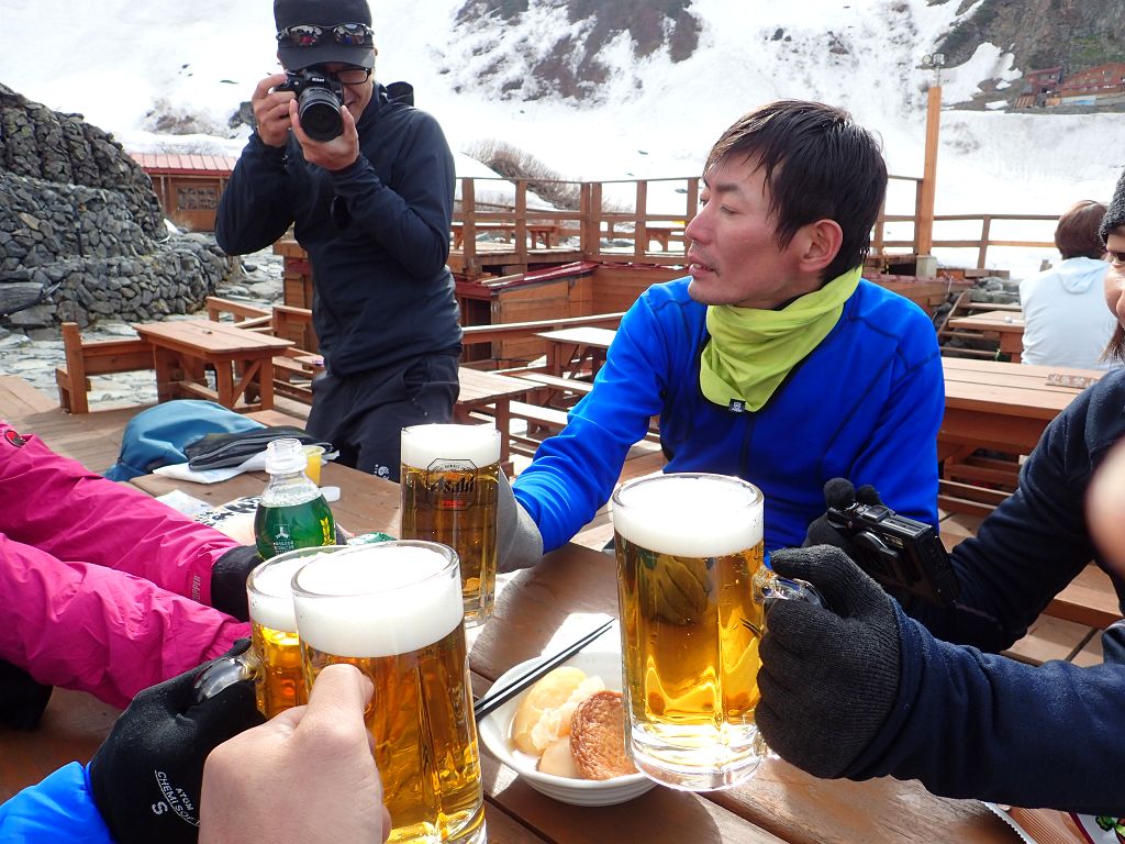 やっとの思いで涸沢ヒュッテに到着したら、お約束のテラスでビール&おでん。