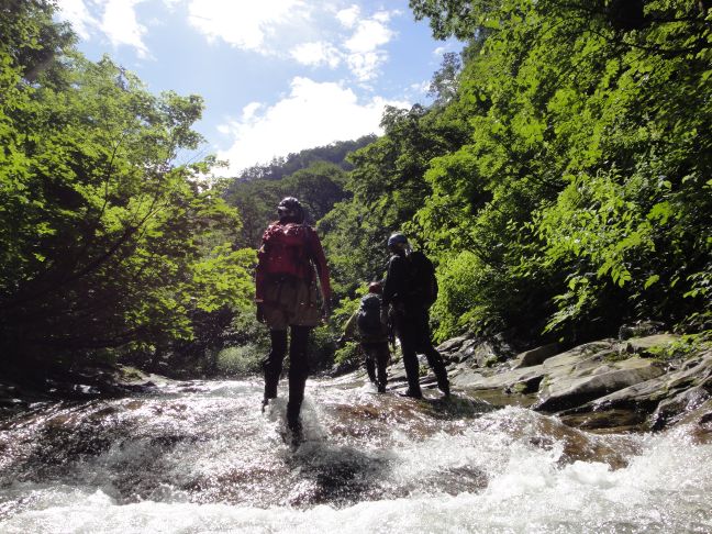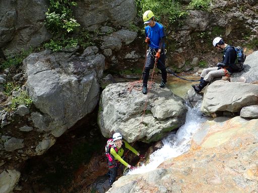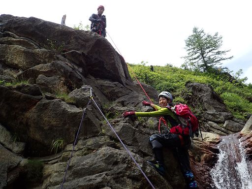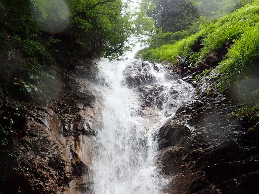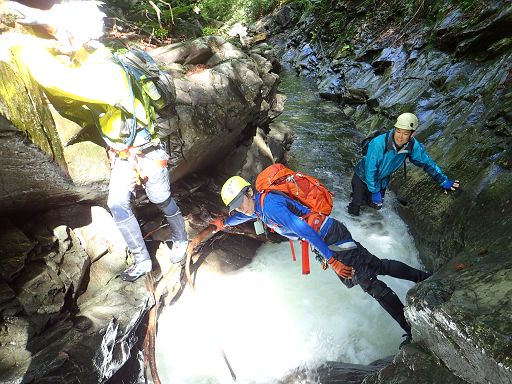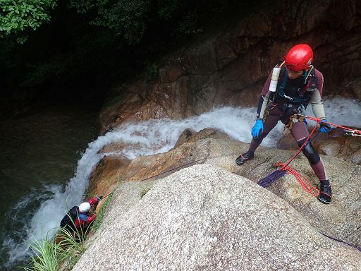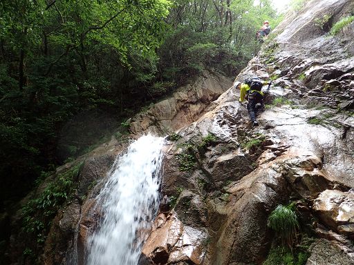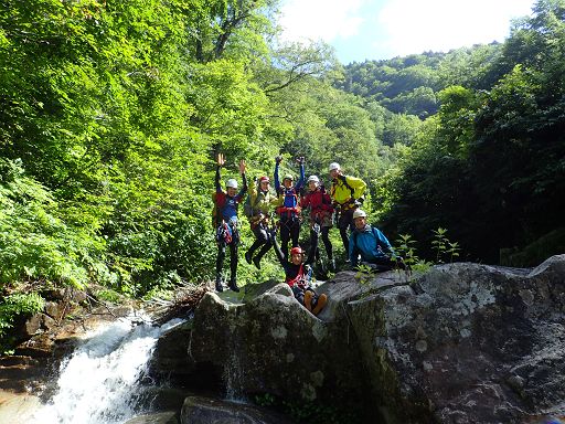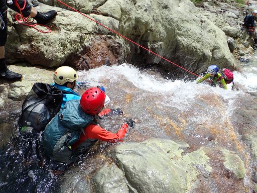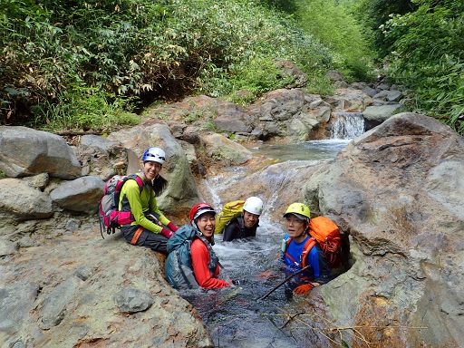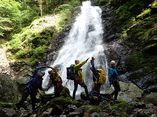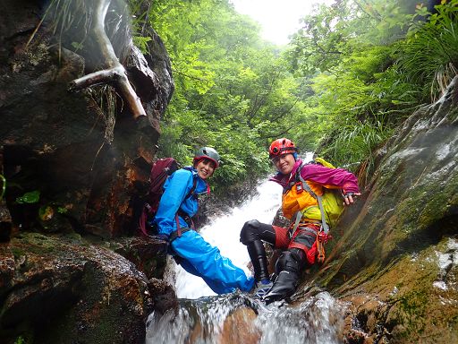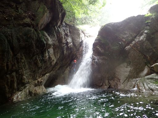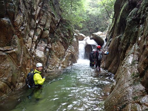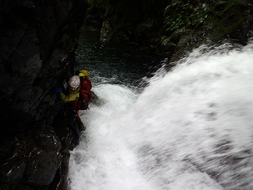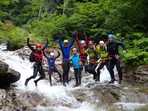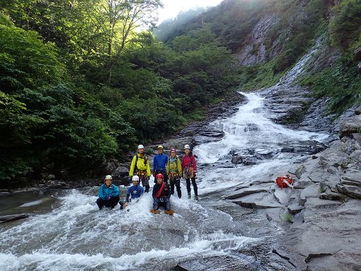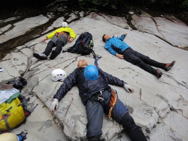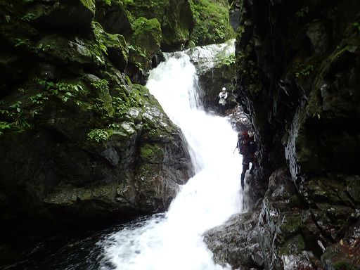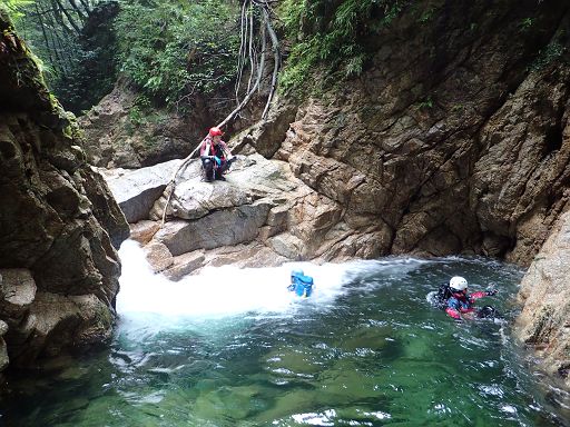 今回の沢は、初めての場所。しかも、泳ぎやダイブがあるところ。 不安もありましたが、いつかはやってみたいと思い急遽 参加させて 頂きました。 最近の雨により増水していた沢は、ゴルジュも迫力があり登るのも やっとでした。 不安の泳ぎは、水温は適度で流速もさほどなく 思っていたより泳ぎ易かったです。 問題はダイブです。高所恐怖症の私には高すぎました。 下から見上げるのと、上から見下げるのとでは大違い。足がすくみ ます。しかし、ここで辞めたら何のために来たのか分かりません。 時間は掛かりましたが、いざジャンプ。飛んだと思った瞬間、空中を楽しむ間も無く水の中。やはり楽しむ余裕はありませんでした^_^; これを躊躇なく飛ぶ、なおさん、たろーさん、サブローさん、itaさんは凄いです^_^ 今度は、今回の半分の時間で飛び始めたいです^_^; |