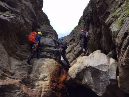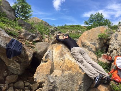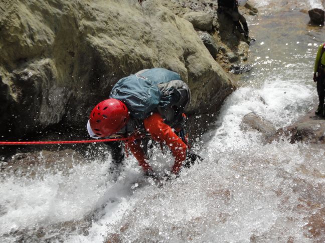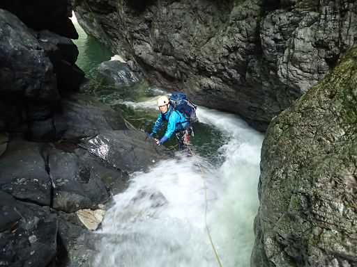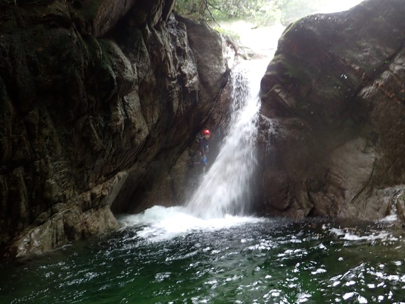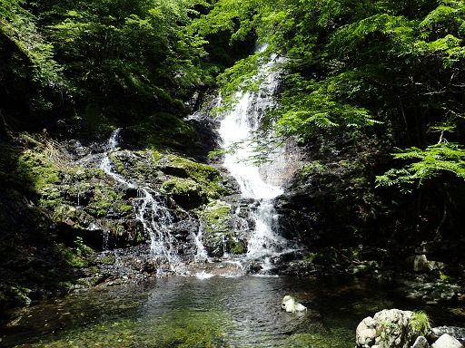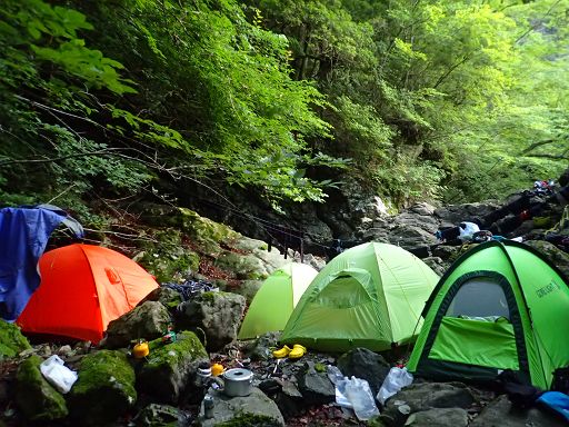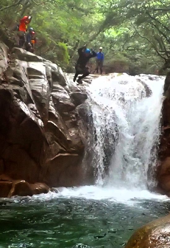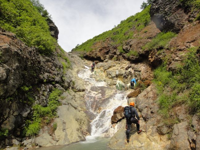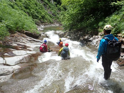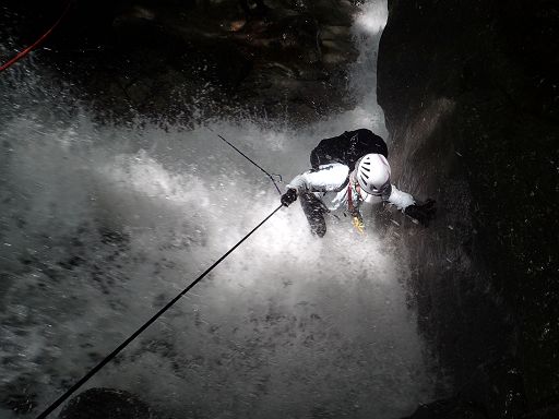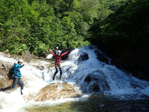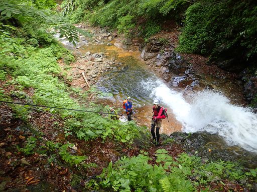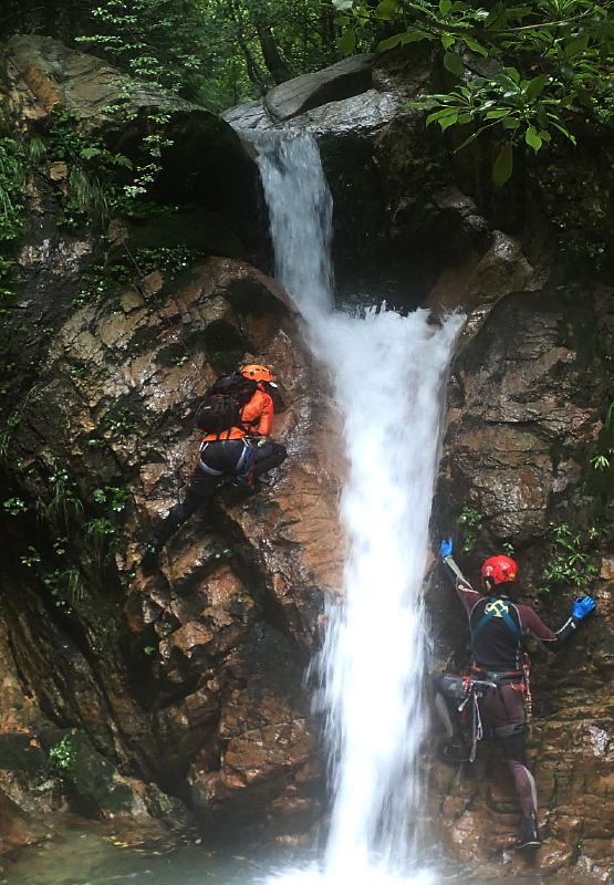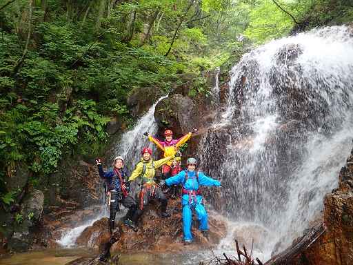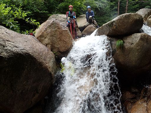 今回の沢は、初めての場所。しかも、泳ぎやダイブがあるところ。 不安もありましたが、いつかはやってみたいと思い急遽 参加させて 頂きました。 最近の雨により増水していた沢は、ゴルジュも迫力があり登るのも やっとでした。 不安の泳ぎは、水温は適度で流速もさほどなく 思っていたより泳ぎ易かったです。 問題はダイブです。高所恐怖症の私には高すぎました。 下から見上げるのと、上から見下げるのとでは大違い。足がすくみ ます。しかし、ここで辞めたら何のために来たのか分かりません。 時間は掛かりましたが、いざジャンプ。飛んだと思った瞬間、空中を楽しむ間も無く水の中。やはり楽しむ余裕はありませんでした^_^; これを躊躇なく飛ぶ、なおさん、たろーさん、サブローさん、itaさんは凄いです^_^ 今度は、今回の半分の時間で飛び始めたいです^_^; |