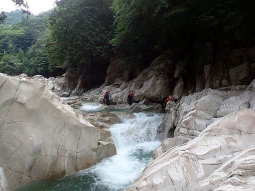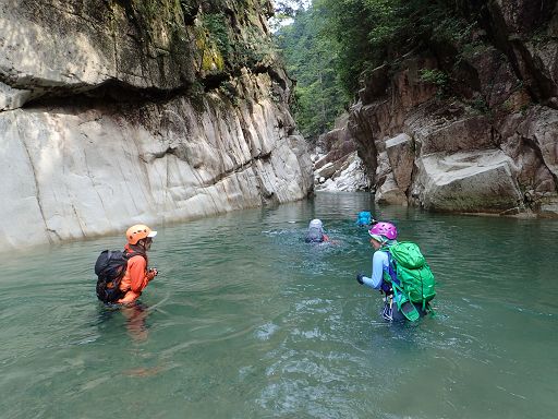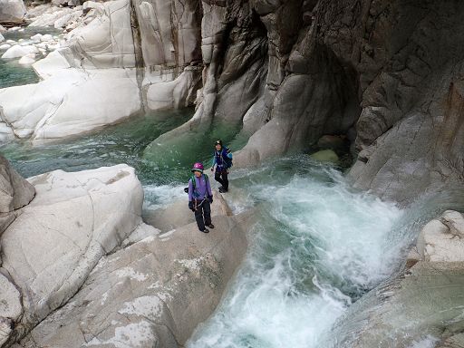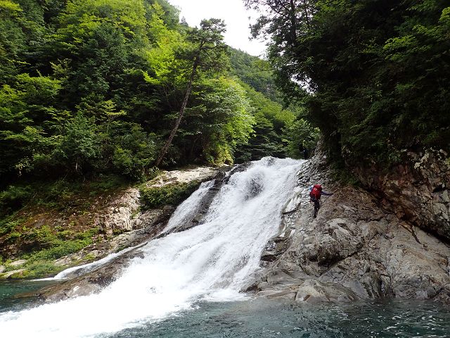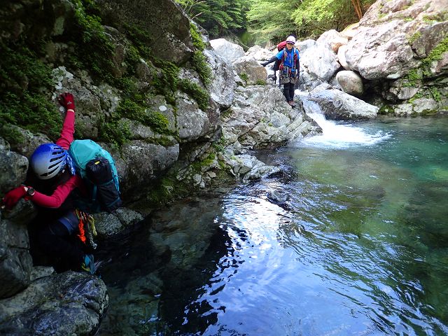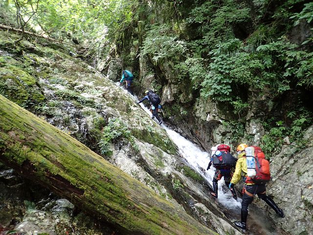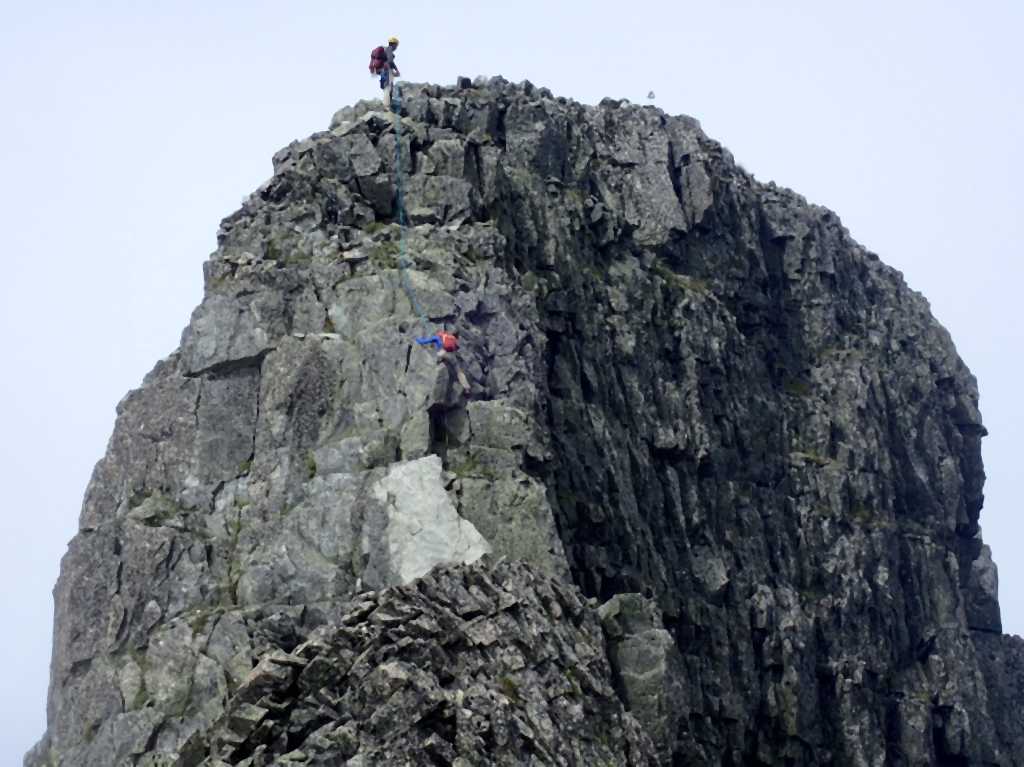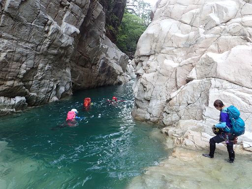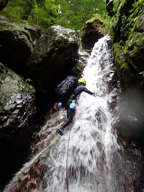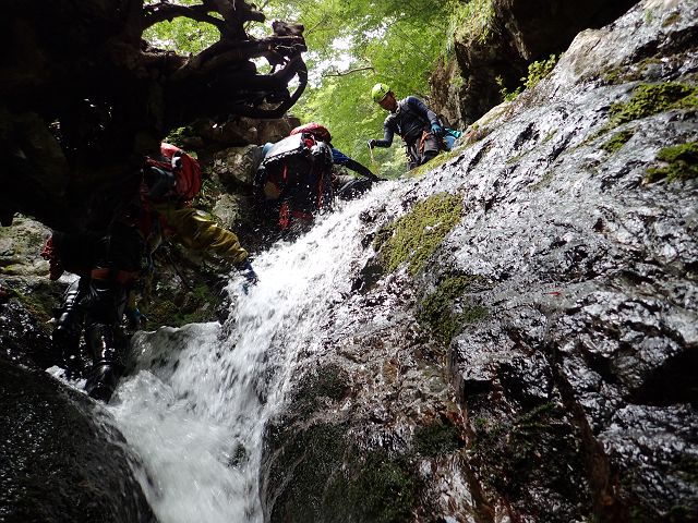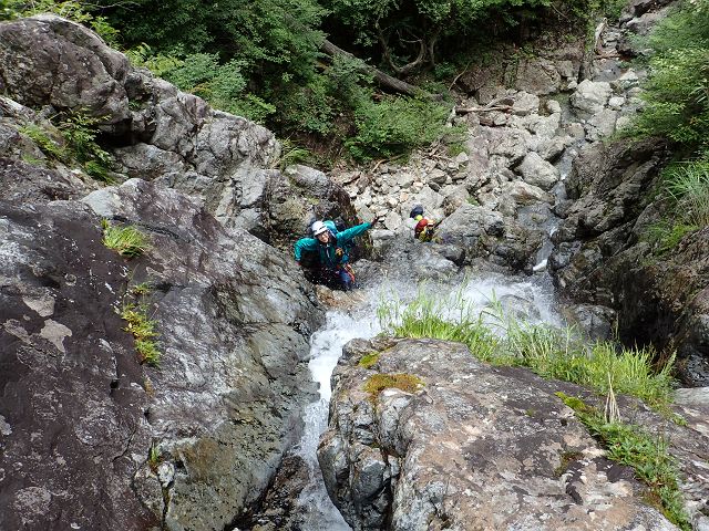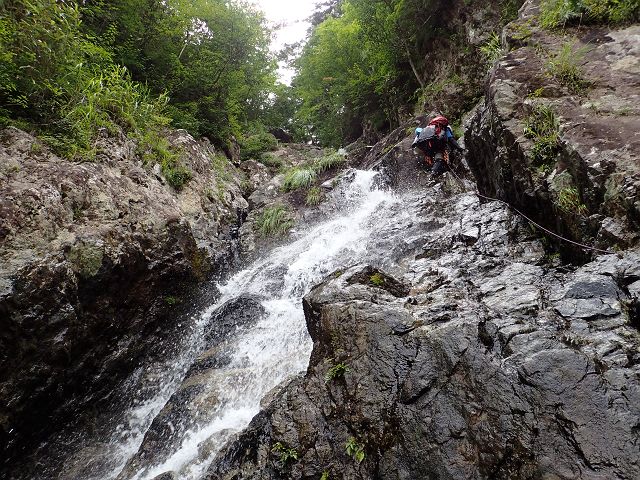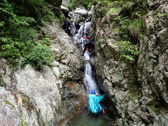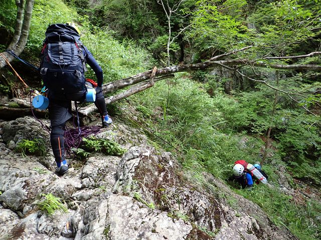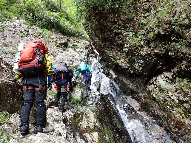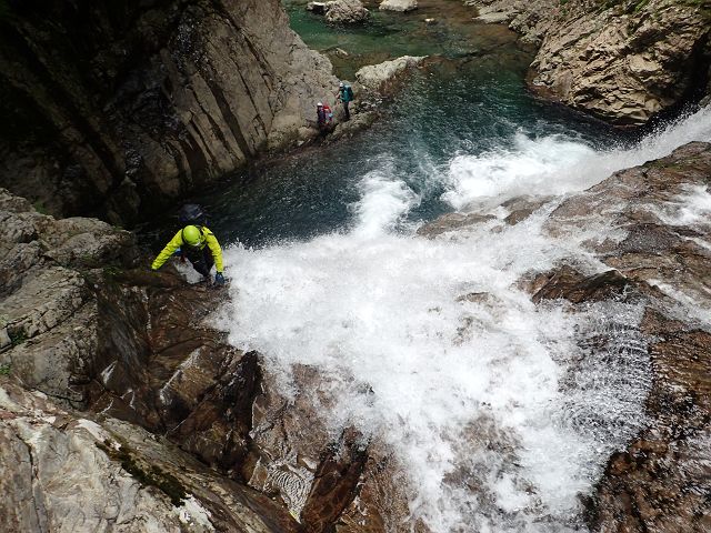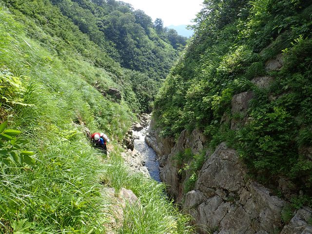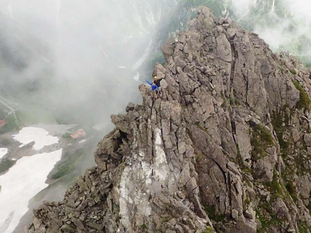 ジャンダルムは南から登ると結構タルい。 ブーブー言うメンバーの為、下りは北面よりクライムダウン。 2人うって変わって活き活きと。好きですね〜。 馬の背あっさり、穂高もあまり興味無さそうなので、前穂高より北尾根 に。 2峰懸垂ルートをクライミング。 御在所より簡単だけど、足元遥か下に涸沢、高度感を楽しみます。