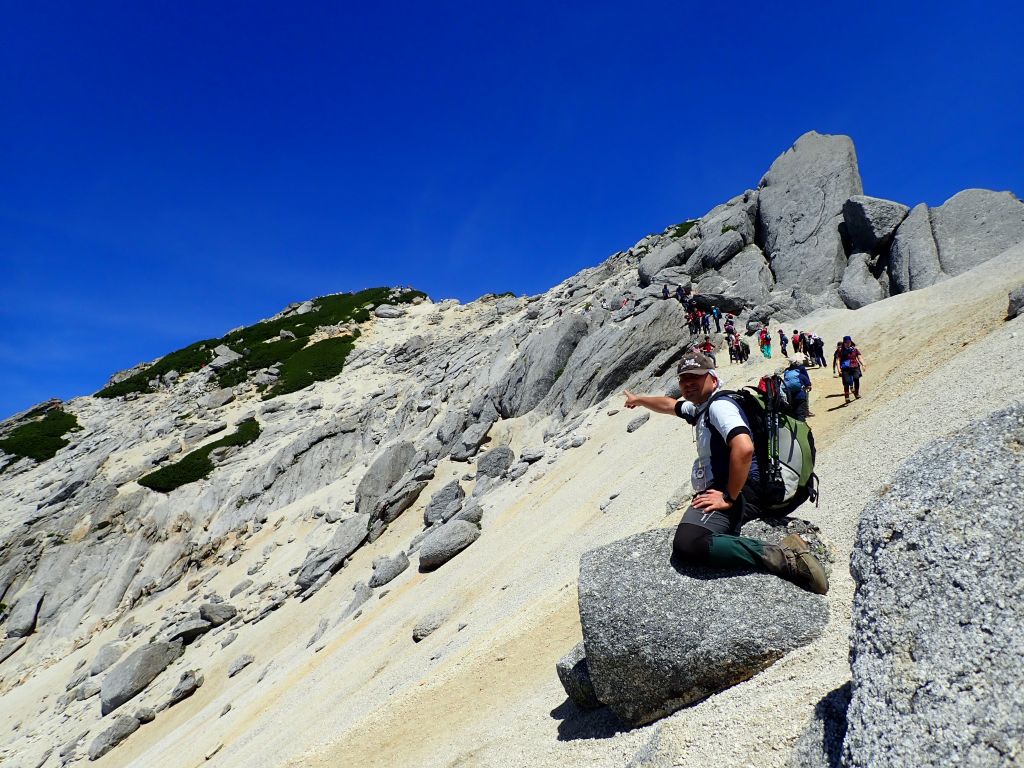 天狗のコルに順調に到着。 避難小屋を怖々と覗きます。 折角なので西穂側、天狗岳までピストン。 ayaさん、ハングの鎖場に大興奮! 稜線に登ると、とーさん加速。いち早くピークゲット!