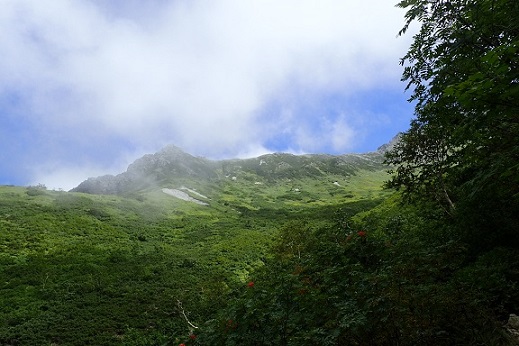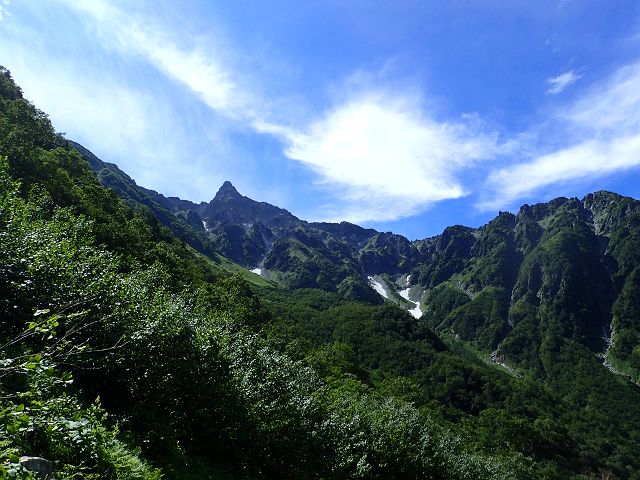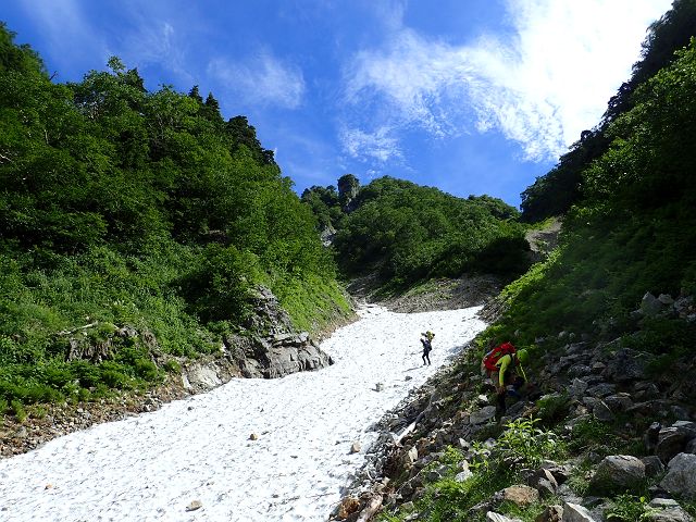雪渓の残る天上沢からはいつもと違う角度の槍が見えてテンションが上がります。