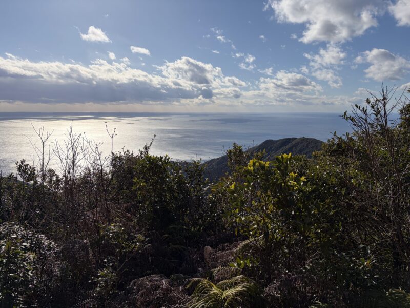 前姫越を経由して、姫越山に登頂!ピークからは、太平洋がピカピカ光って望めます。寒さ厳しい季節を忘れそうな穏やかさです。山頂から唐人殺し峠まで下って、芦浜へ降りる支尾根を下ります。つづらに付けられた歩きやすい道はよく整備されています。