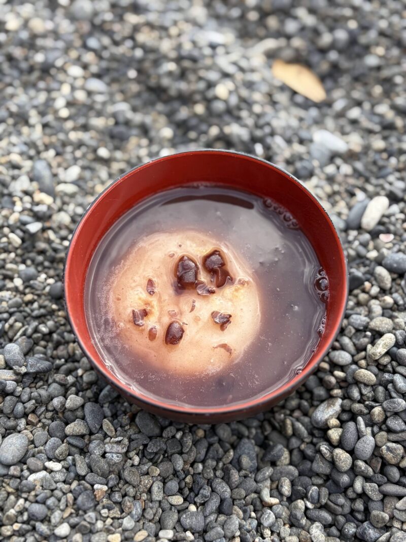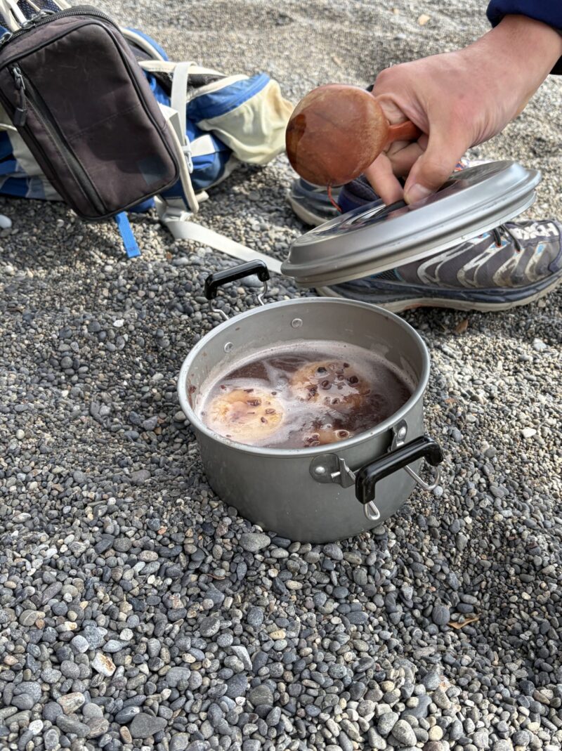 浜辺に到着して、風の当たりにくい岩陰でランチ・タイム♪食後は、お待ちかね「ぜんざいタイム」です。たろーさんが、用意してくれた餡子をなべで温めて焼いたお餅を投入!一口食べると餡子とお餅のコラボレーションが染みます。キラキラの海を眺めながらのぜんざい、雅(みやび)です。