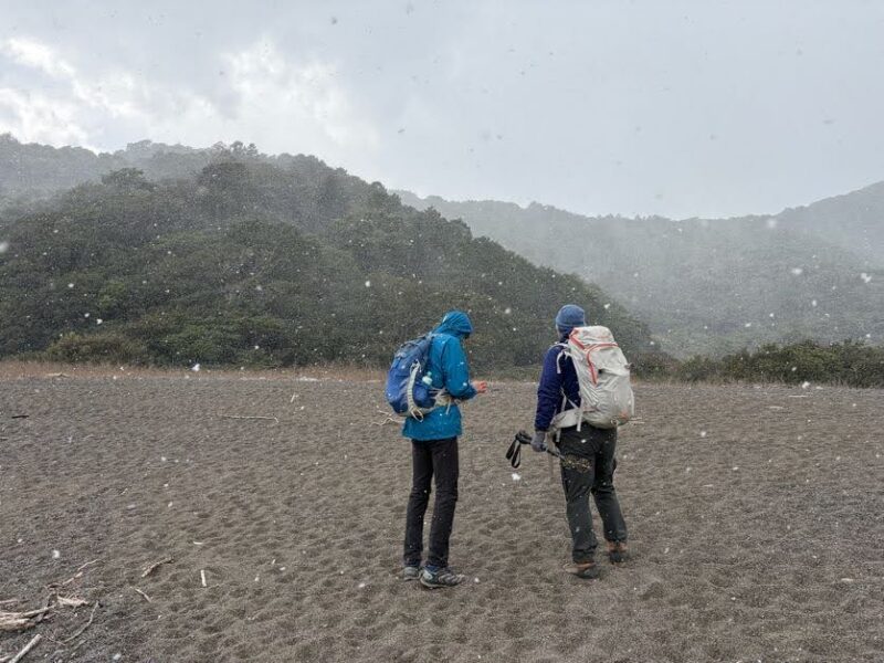しかし、おなかも膨れてご機嫌なメンバーに“まさかの事態”が!雪です!なんと雪が吹雪いてきました。まさか、芦浜で雪に降られるとは…カッパをきてフードをかぶって樹林帯へ逃げ込みます。
