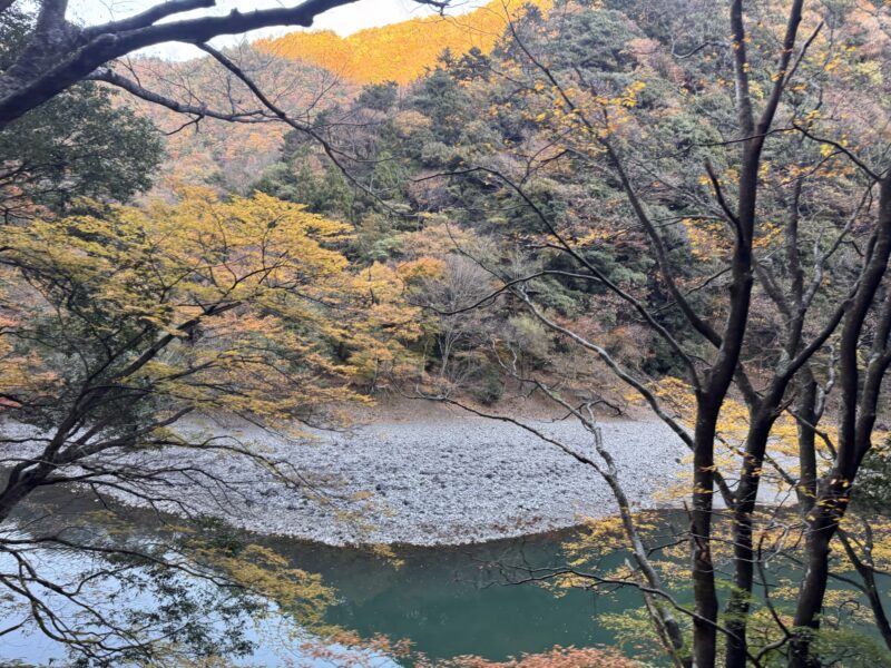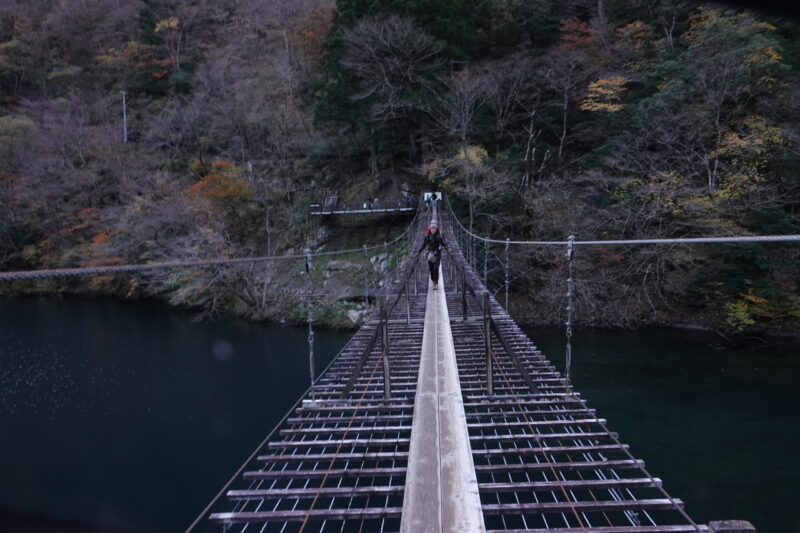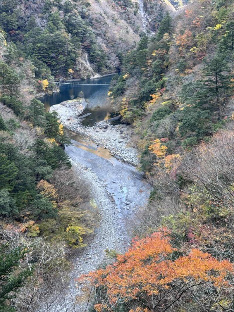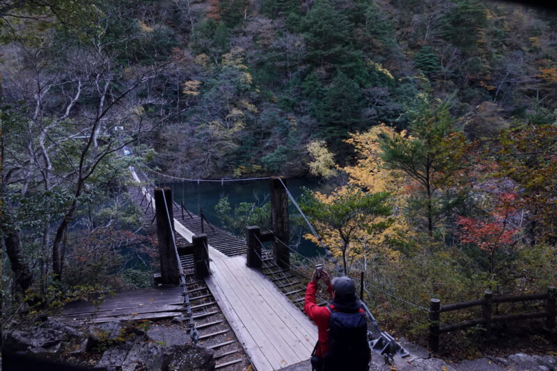 そして夢の吊り橋、あいにくまだ日がささない谷間なため、紅葉も鮮やかさには欠けますがそれなりに綺麗。