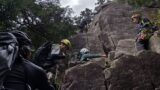 みなさん難無くクリアしていますが、下から見ていると登れる気が全くしませんので、こちらは、りーちゃんと1ルートを挑戦します。初見のリードでルートもよく分からず意外と苦戦し、泥まみれになりながらなんとかクリアします。
