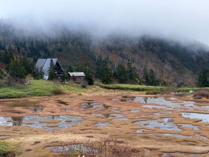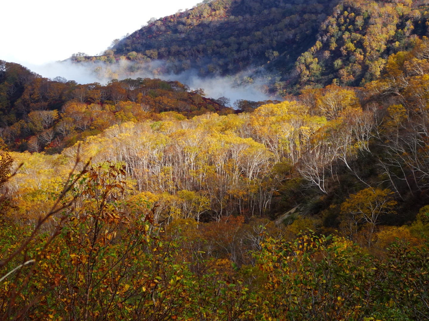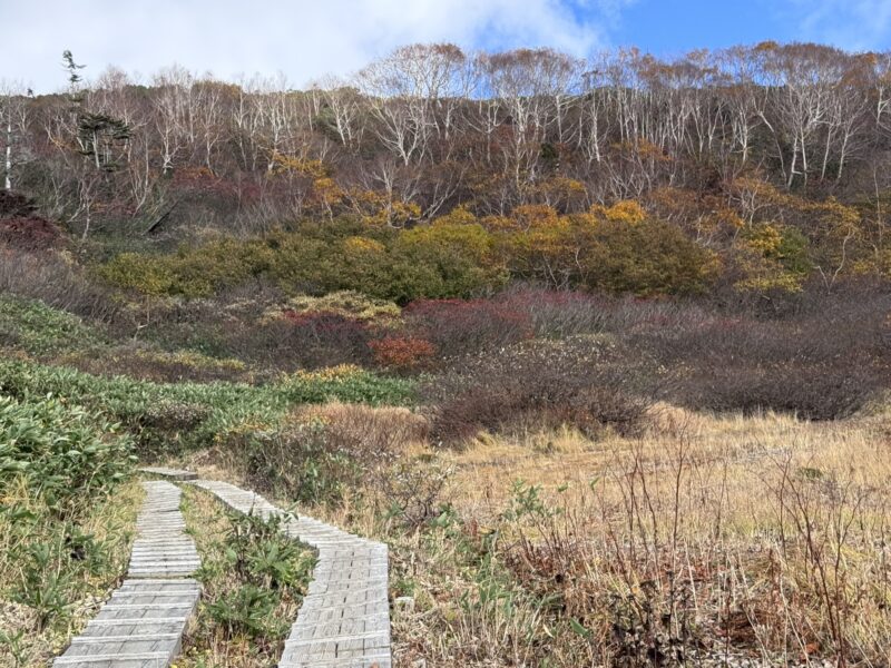 曇りがちの鈍色の空でしたが時折り青空ものぞき、目指す火打山の頂や活火山の焼山も姿を見せて、終わりかけの紅葉に彩られた高層湿原、天狗の庭の秋の風景はまさに絶景!