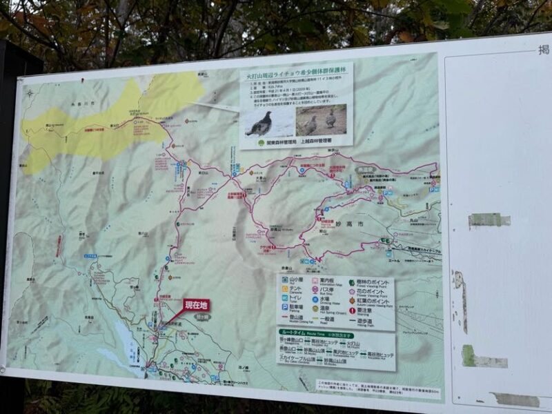 14:15火打山14:50→14:00高谷池ヒュッテ(泊)6:15→8:15黒沢橋→9:18笹ヶ峰駐車場登山口P