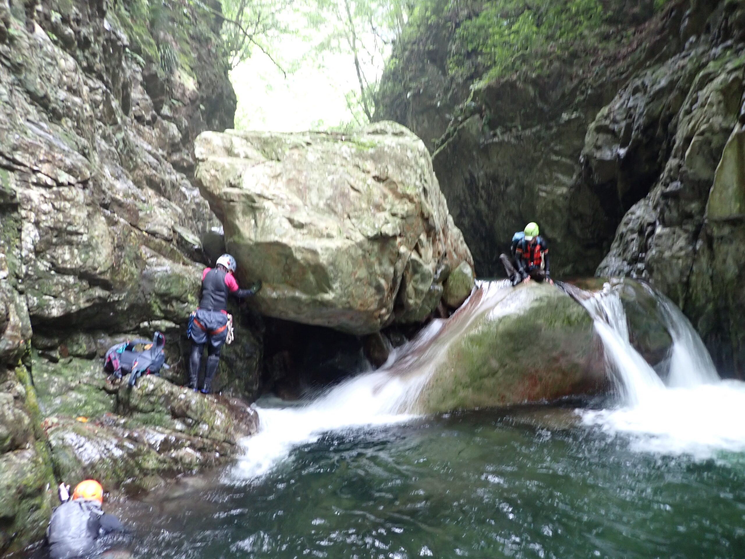 やがて核心のS字淵に到着。先行の3人パーティーが苦戦中なので、手前の足がたつ岩の上で様子を伺う。3人パーティーの男性が何度も挑戦しているが弾き返されているようなので、いさおさんと私の二人で近くまで行って、トライさせてもらう。