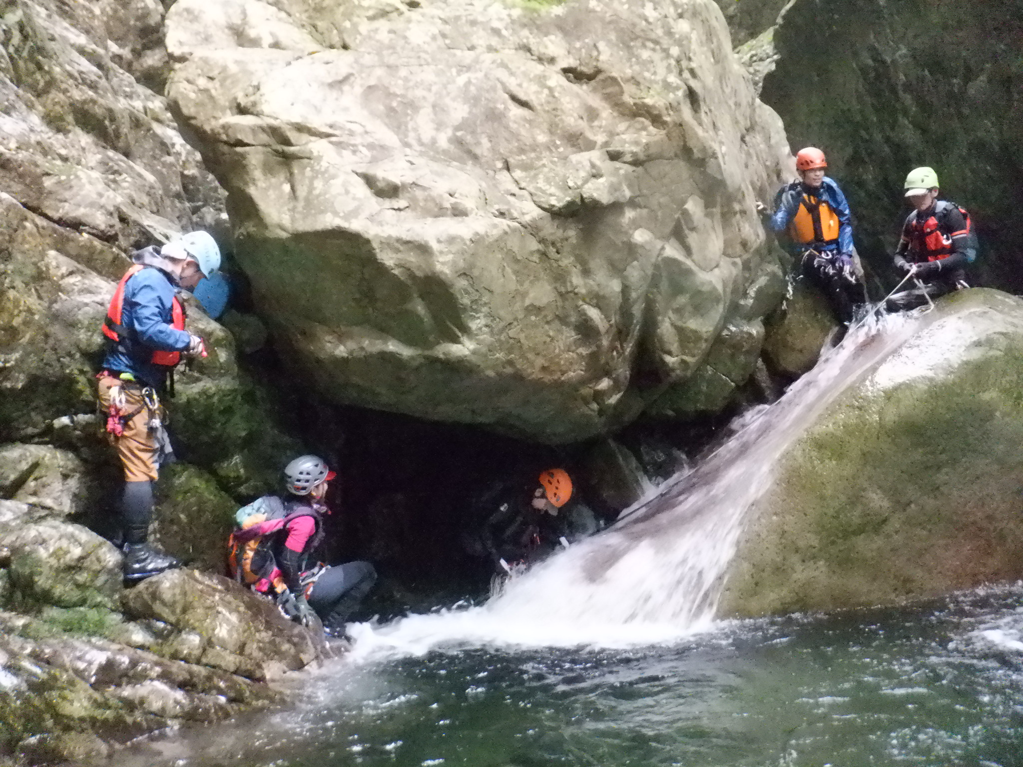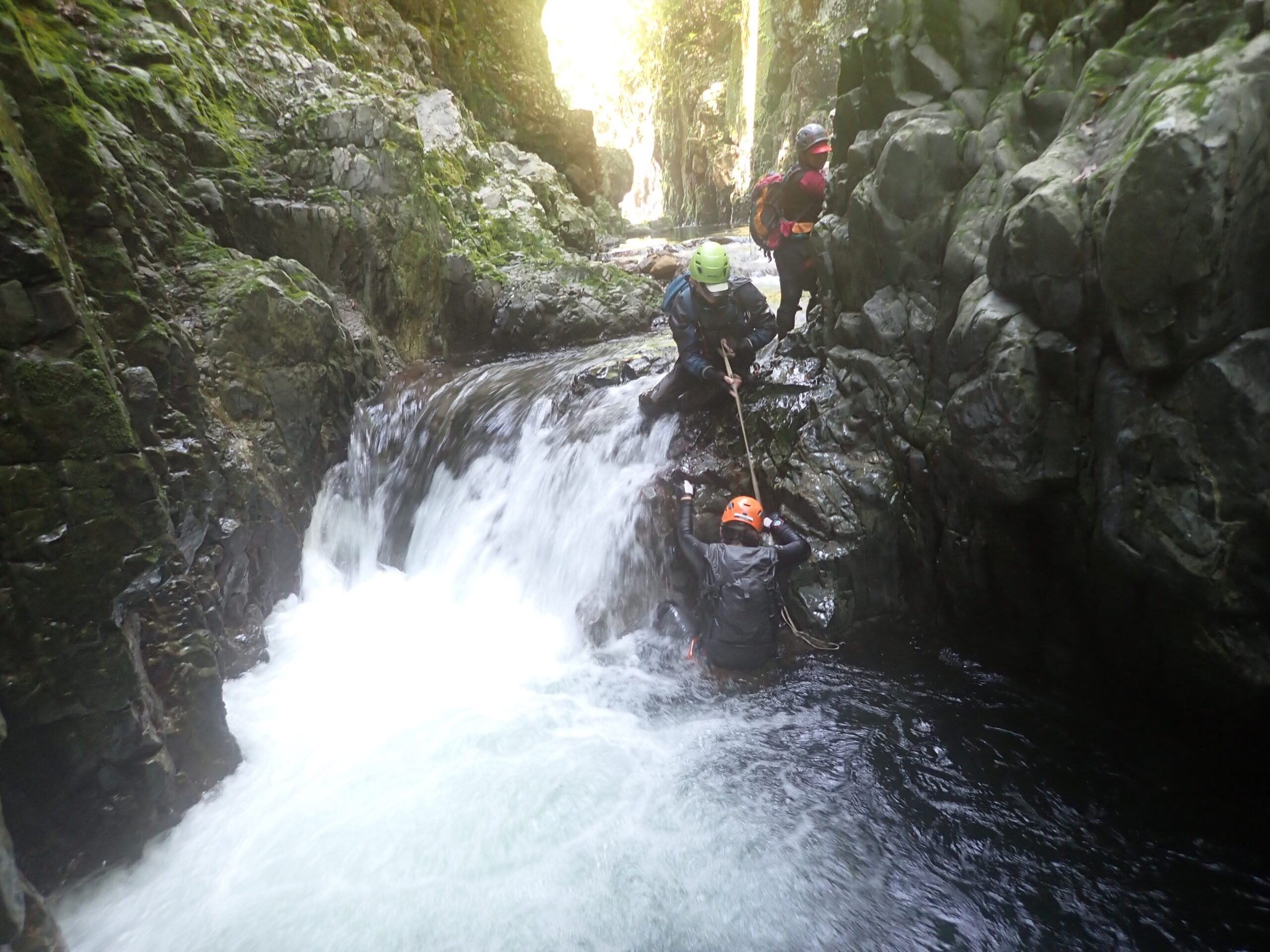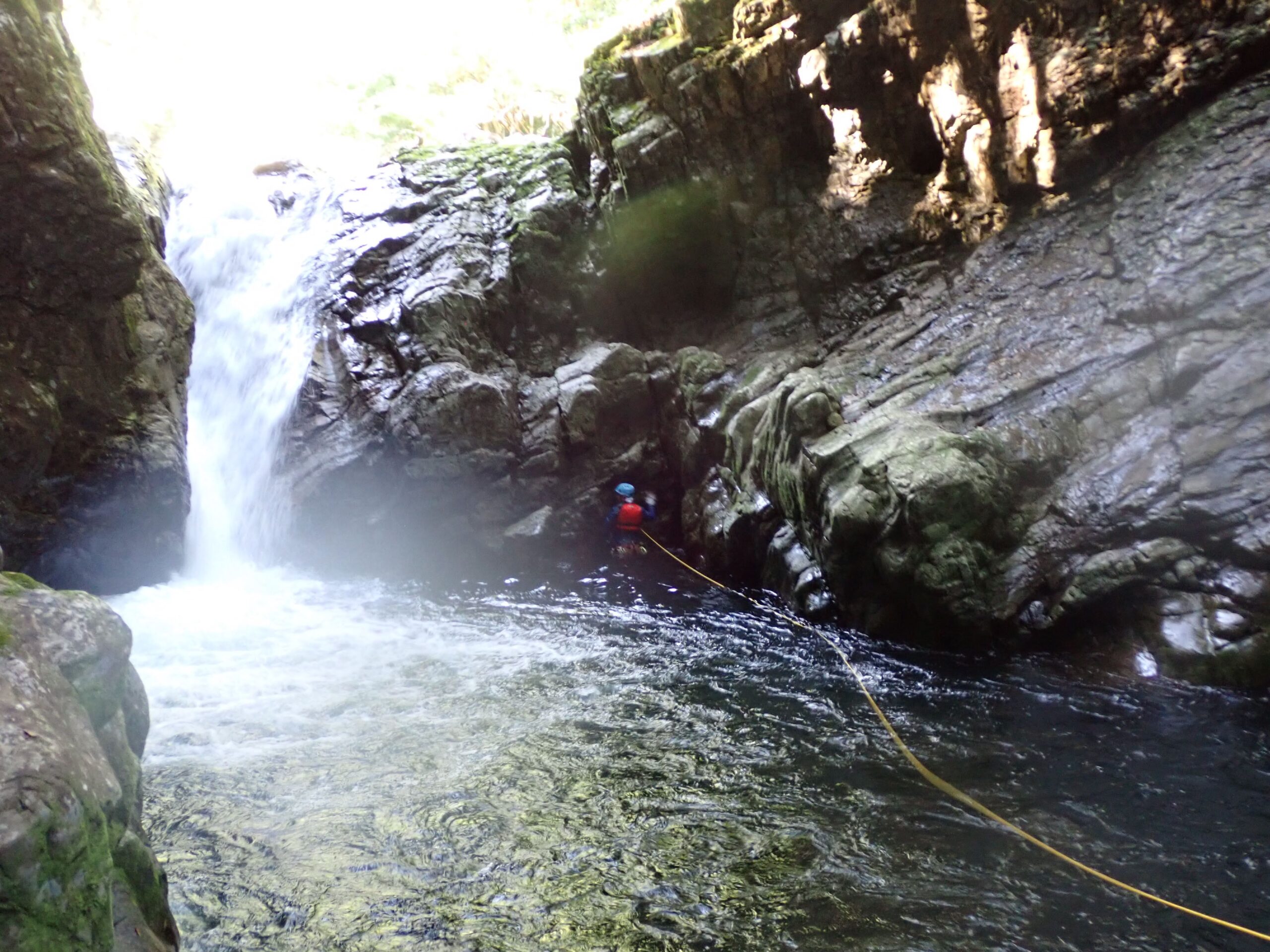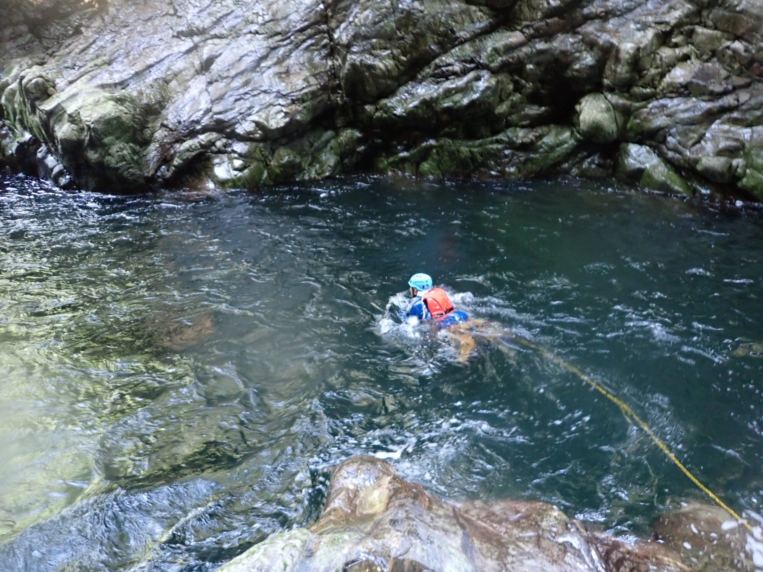 泳ぎすぎで腕がパンプしてきた頃に最後の難関、一ノ滝だ。手前の小滝を巻くのが際どいトラバースになっていて結構苦労したけれど、何とか右岸の岩棚に降り立った。一ノ滝を超えるには対岸に泳ぎ渡らなければいけない。もう寒くてお腹いっぱいだったけど、意を決して釜に飛び込む。もろに流れに逆らっての泳ぎだったが、何とかたどり着き、微妙な岩登りで安定した岩棚に立つ事が出来た。後はみんなにロープを引っ張ってもらって無事一ノ滝を超えた。