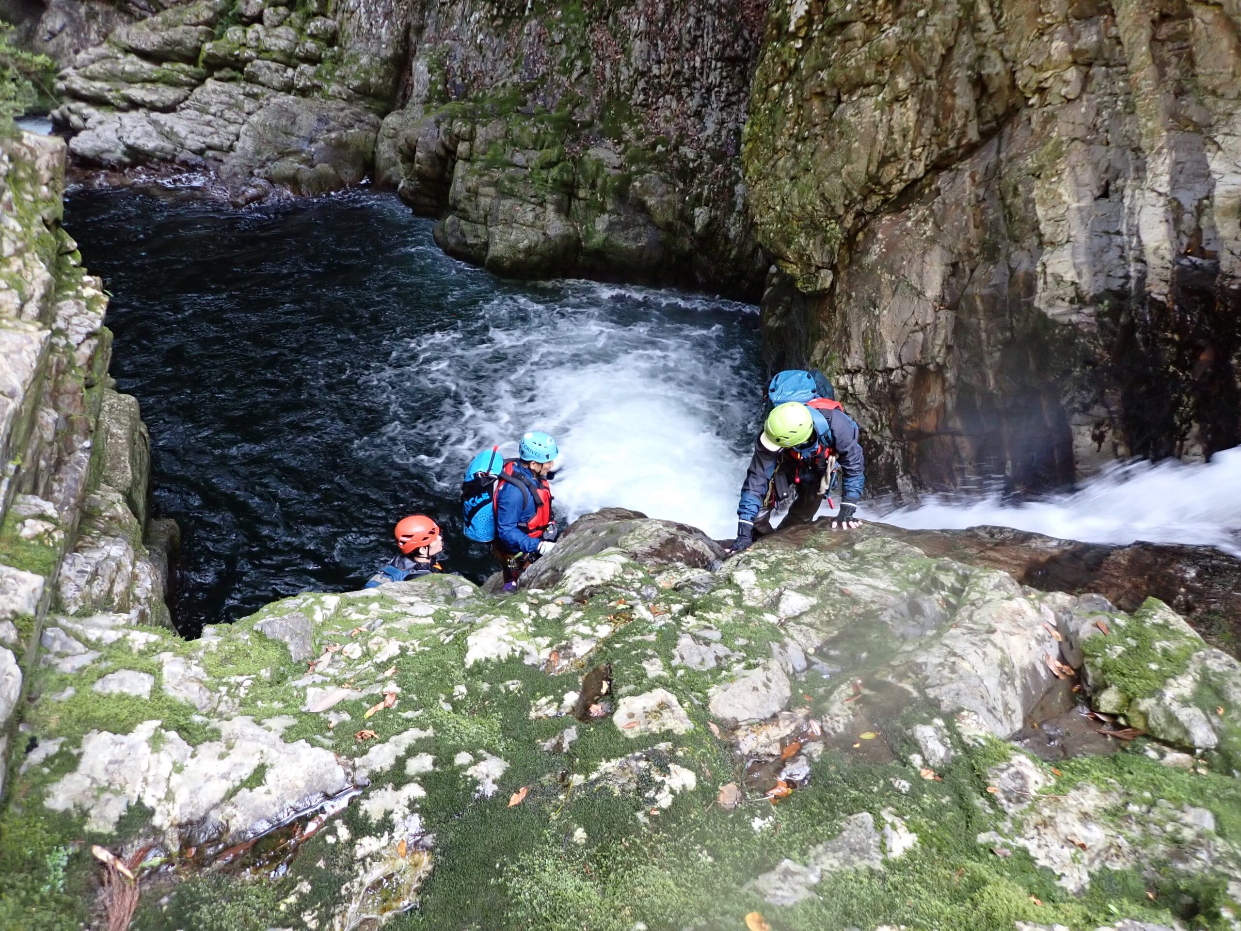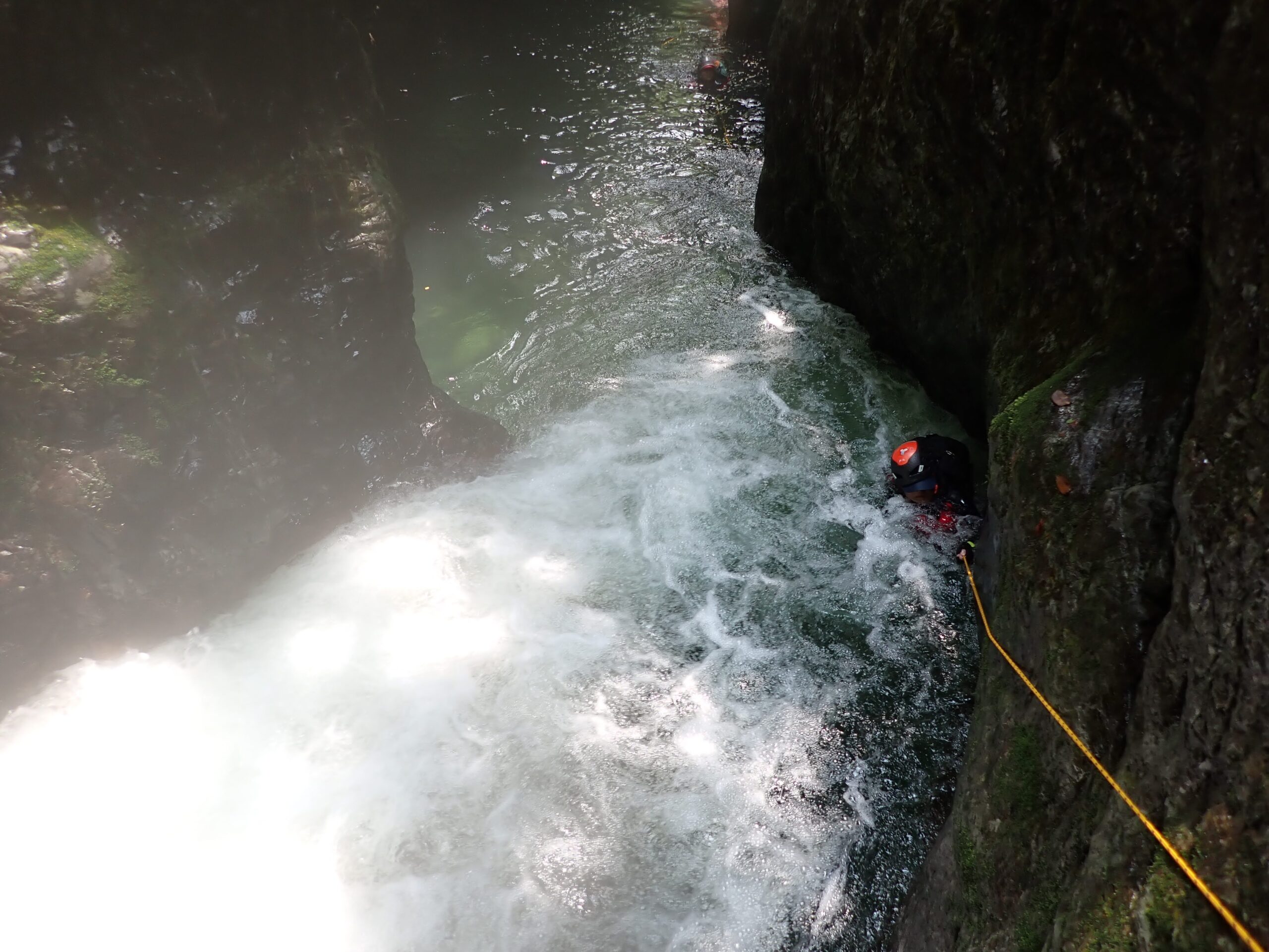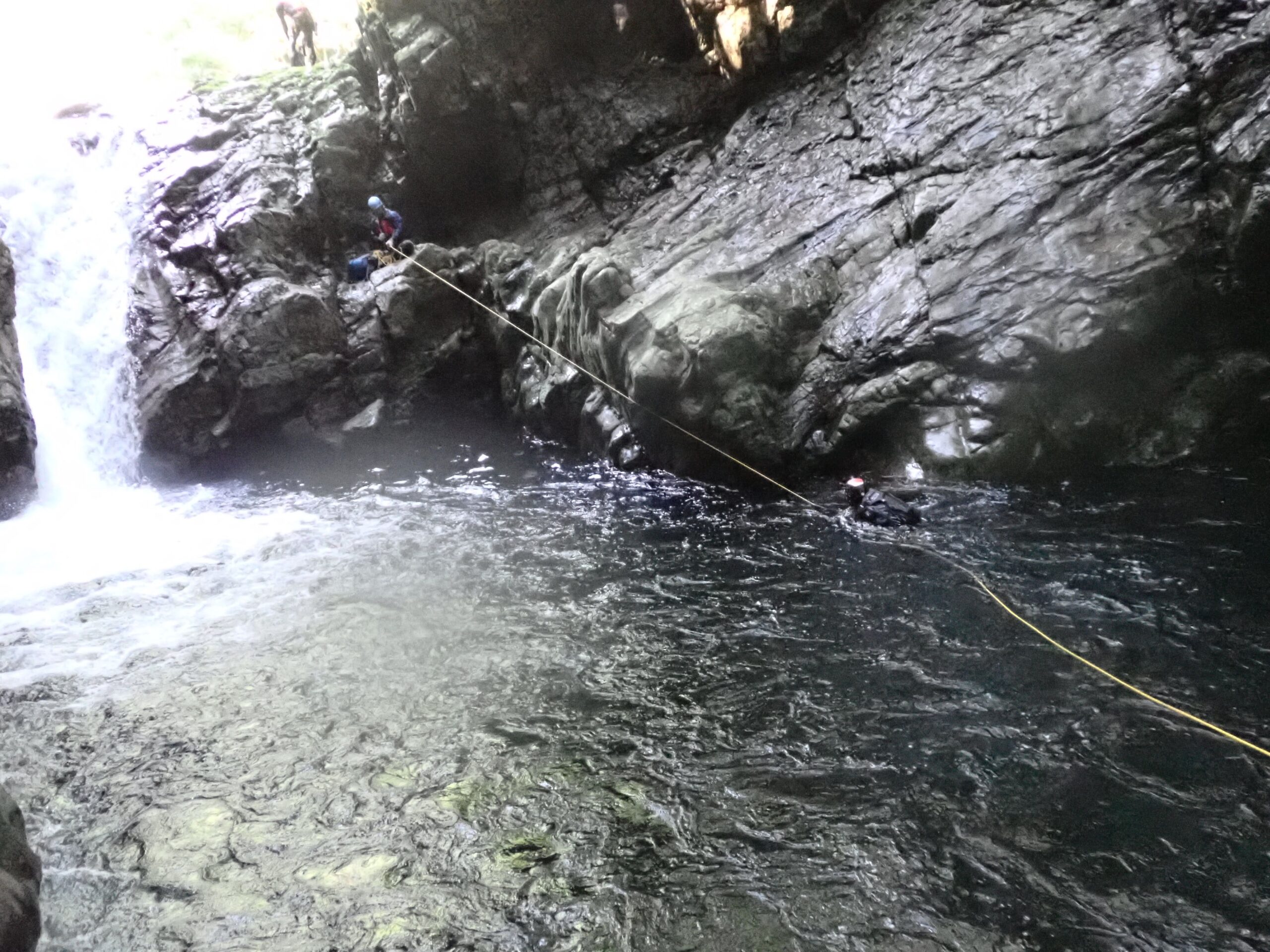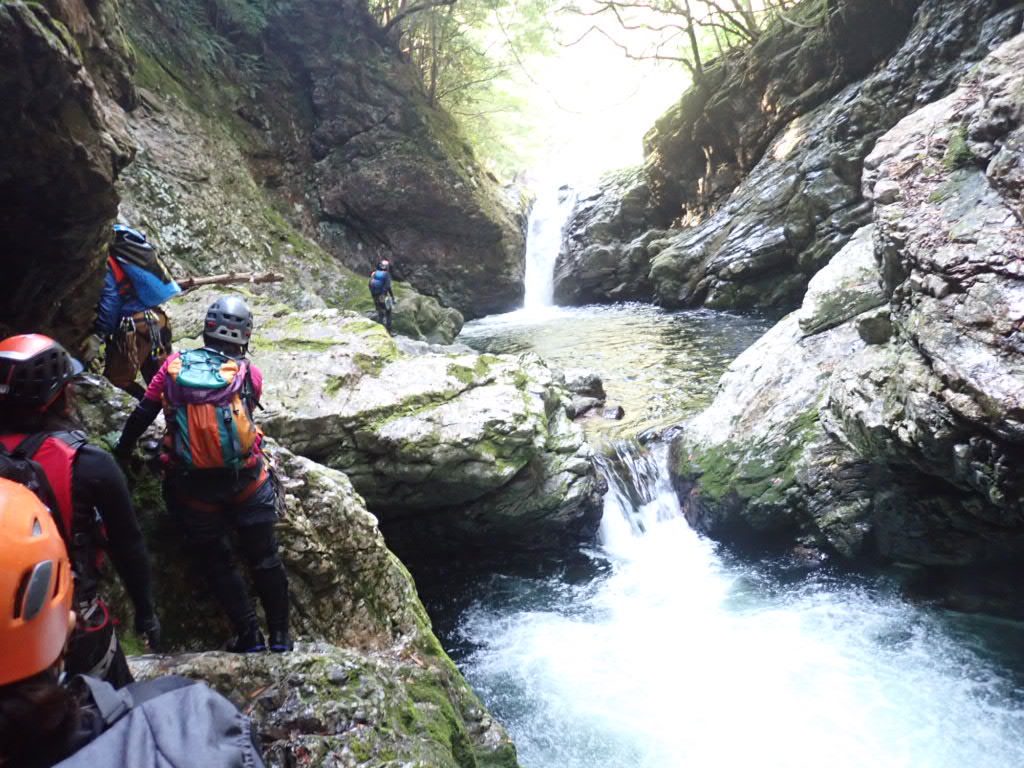 泳ぎすぎで腕がパンプしてきた頃に最後の難関、一ノ滝だ。手前の小滝を巻くのが際どいトラバースになっていて結構苦労したけれど、何とか右岸の岩棚に降り立った。一ノ滝を超えるには対岸に泳ぎ渡らなければいけない。もう寒くてお腹いっぱいだったけど、意を決して釜に飛び込む。もろに流れに逆らっての泳ぎだったが、何とかたどり着き、微妙な岩登りで安定した岩棚に立つ事が出来た。後はみんなにロープを引っ張ってもらって無事一ノ滝を超えた。