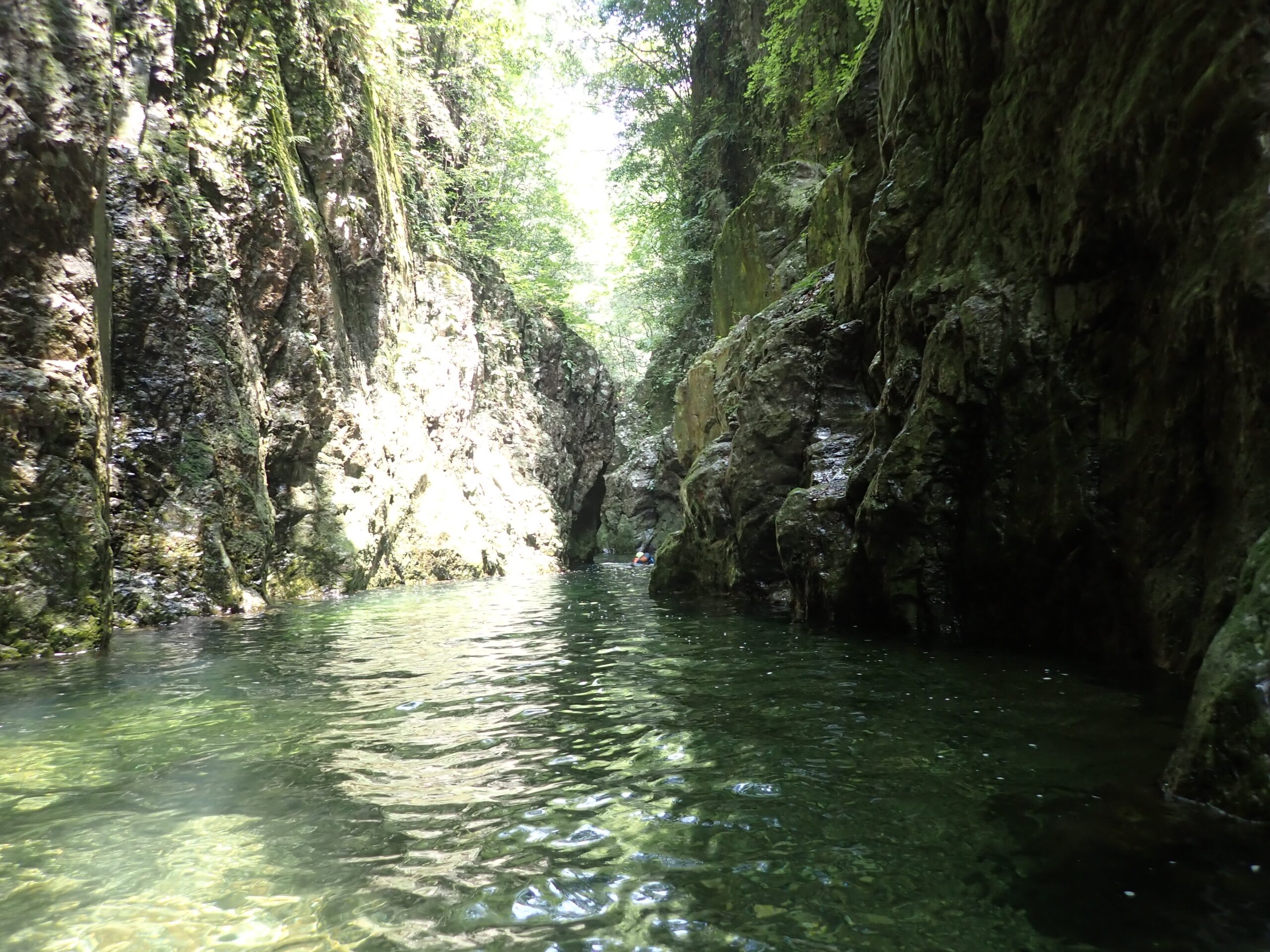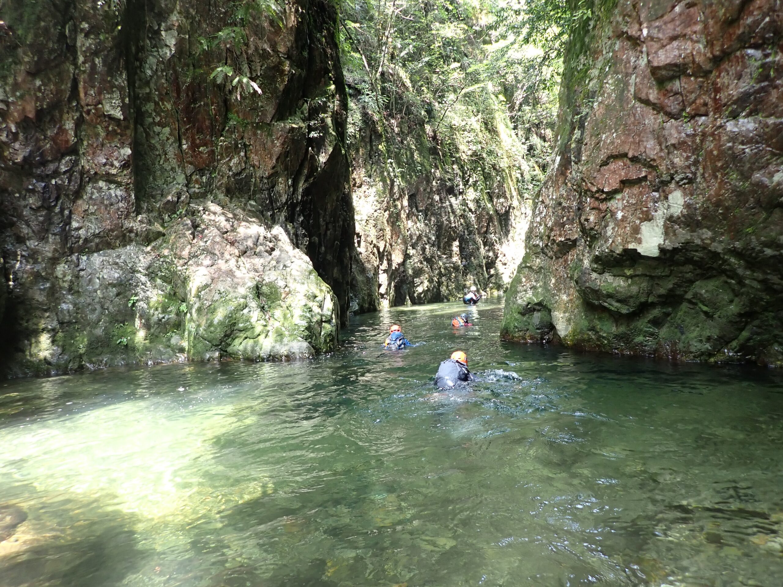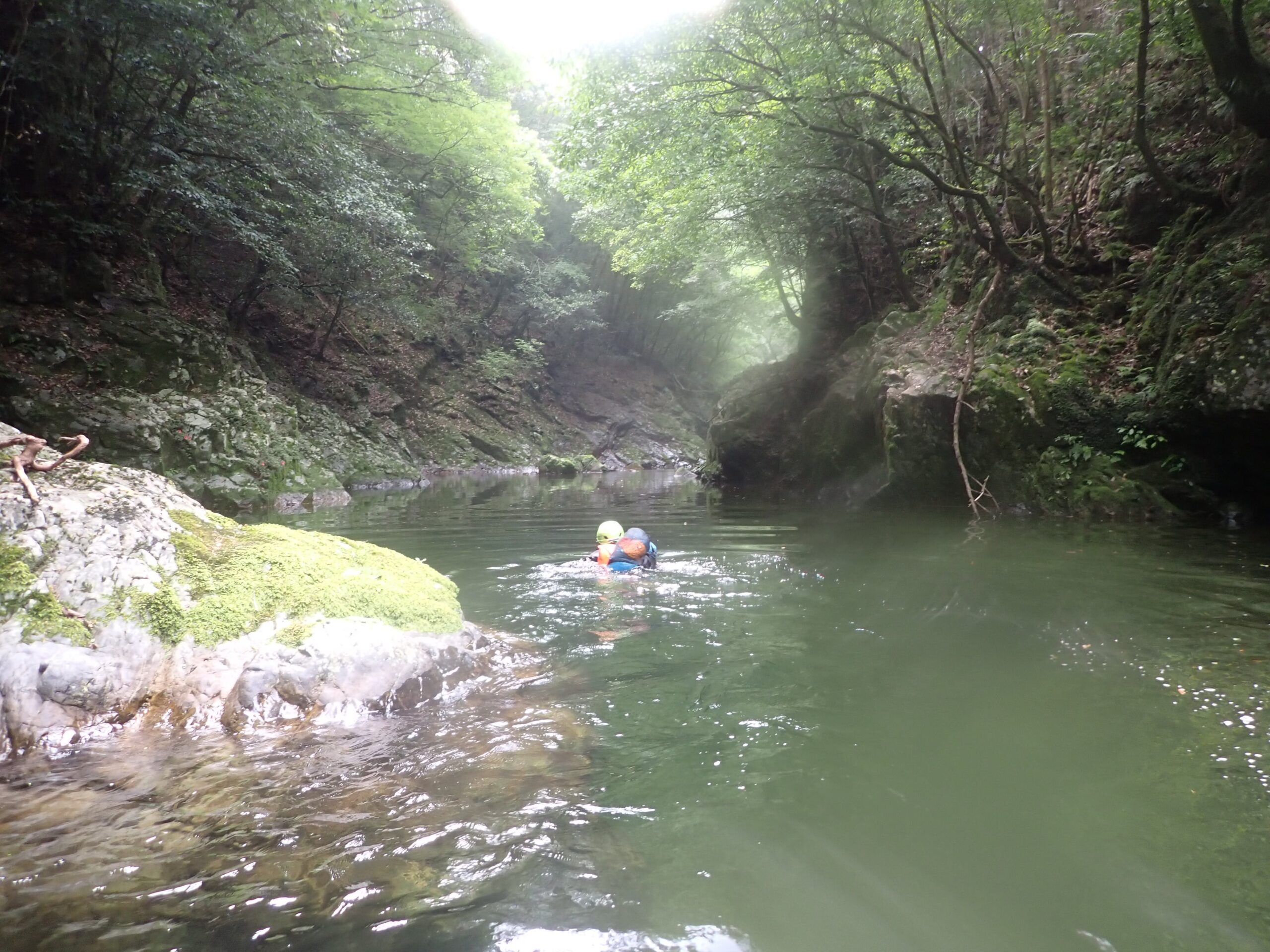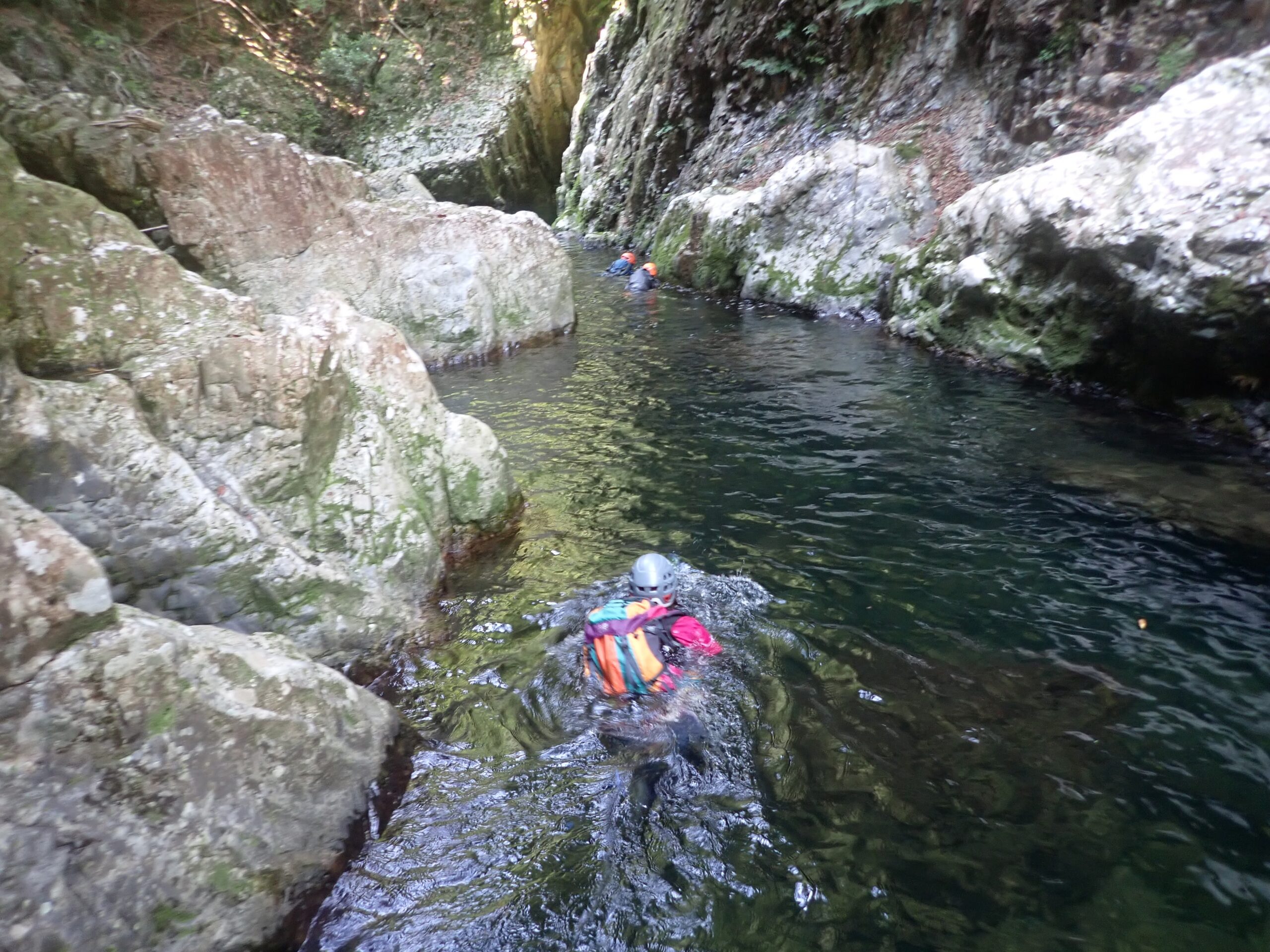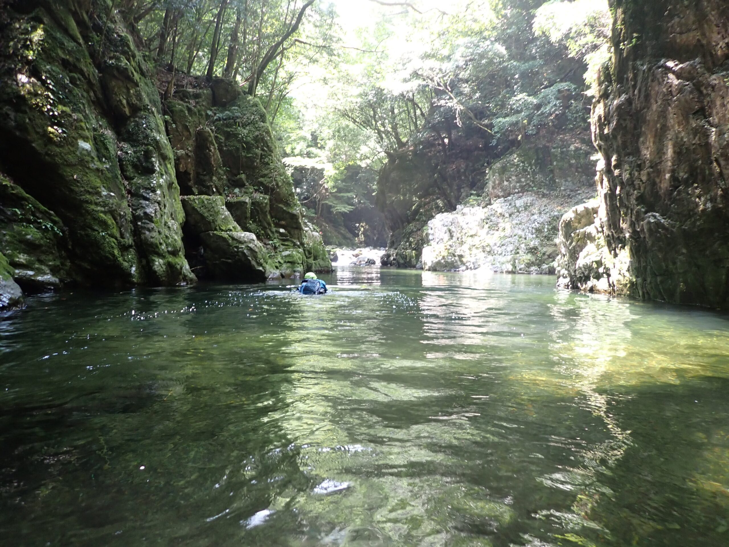 沢は最初に小難しい小滝があったが、その後はずーっと泳ぎの連続。上流に集落があり、比較的下流域にあるため、水質はキラキラの清流という訳ではなかったけれど(少し泡立っている?)、瀞場が連続する特異な渓相はすばらしく、この沢の良さが損なわれる事は無い。歩くより泳ぐ距離の方が長い(と感じる)ので、時々現れる河原で日向ぼっこしながら進んでいく。