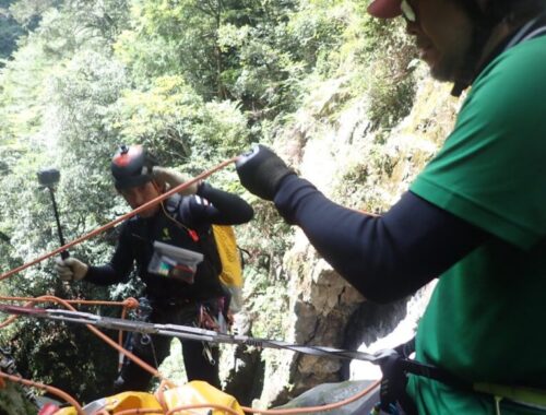 入渓場所も滑りそうなのでスリングなどで自己確保してから懸垂下降で降りました。そこからいよいよ空中懸垂!まずリーダーのてつやさんが下りて、その後順番に下りていくのですが、私はトランシーバーで連絡係。順番が後の方だったので、みんなが下りていく様子を見守っていました。