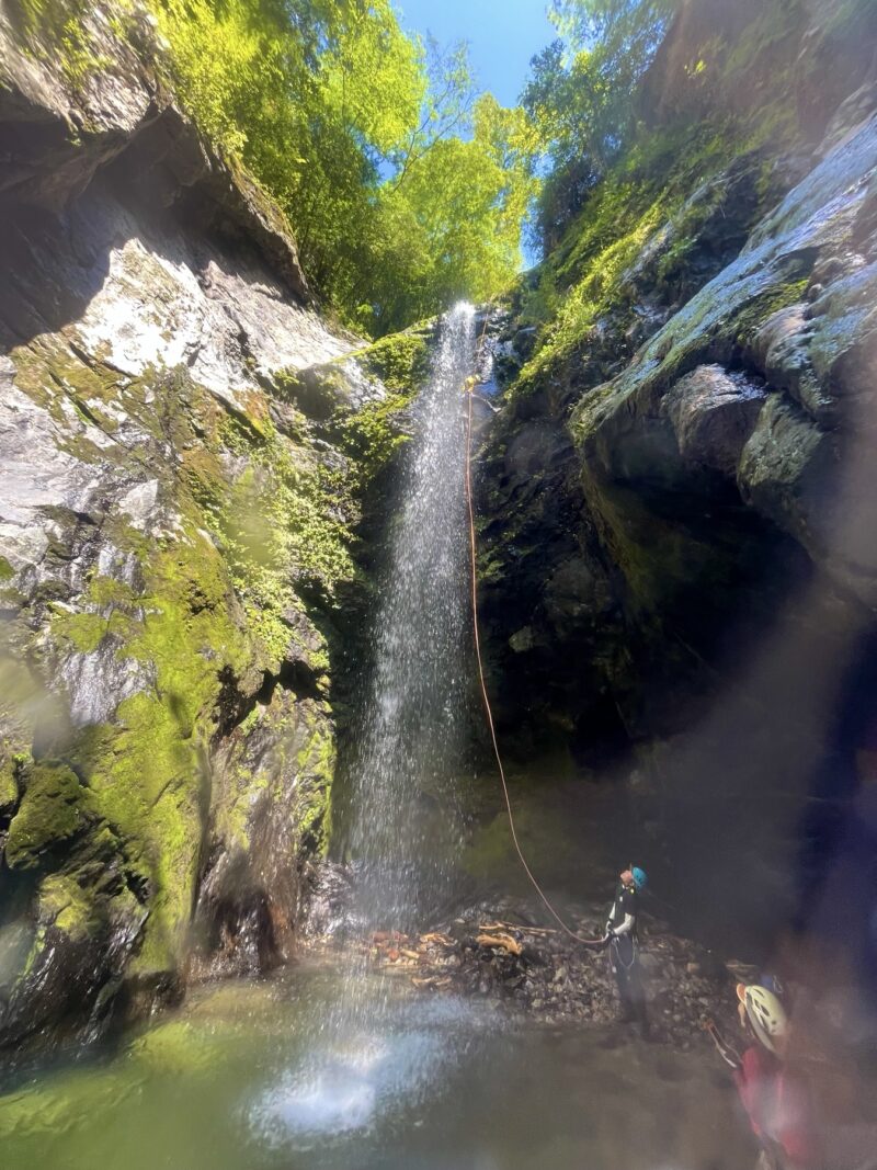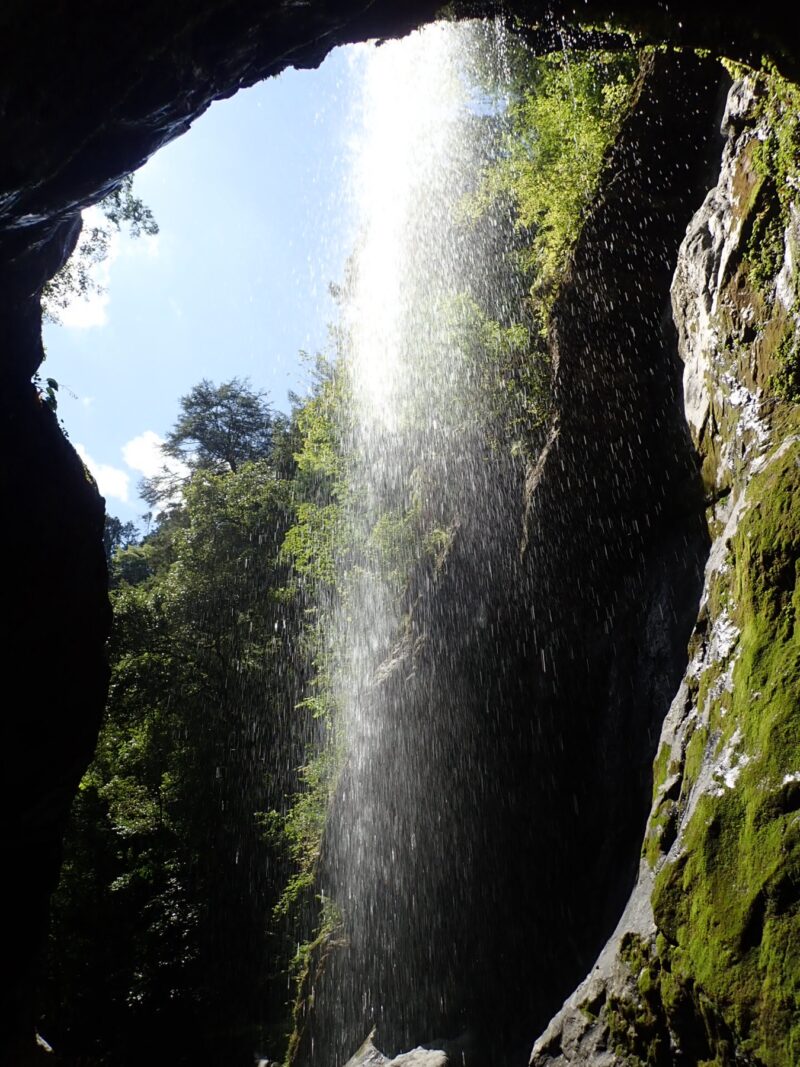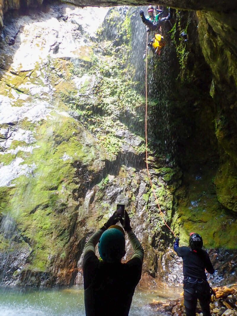 無事降りて、みんなが叫んでいた訳を聞いたら、叫んでいたのは降りている人ではなくリーダーのてつやさんが下から雰囲気出すためにブラボーとかヒューヒューとか、ヤジを飛ばしていたそうです。みんなが居る滝の裏側を見学したり写真撮っていたら、最後尾のユウさんがあっという間に降りてきました。すごい速さでした(・・;)