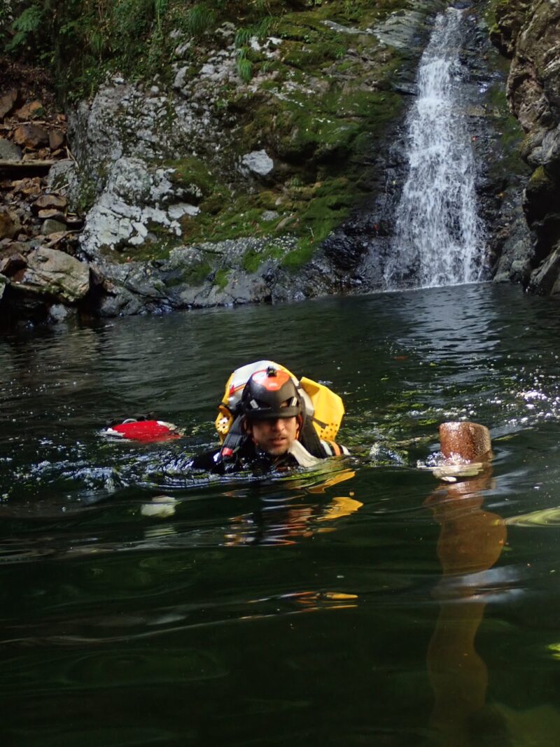 『キャニオニングには特有の知識、技術、装備が必要です。それら無しに渓谷に入ると命に関わる状況となる可能性があります。沢や岩などのロープワーク経験のみでは決して立ち入らないで下さい。』