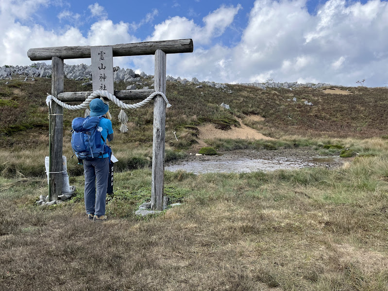 しばらく頂上付近を下山道にむけて歩きますが、ここは藤原岳のような石灰岩が雨水や地下水で浸食されて落とし穴のようにくぼんだいわゆる「ドリーネ」で、そこに水がたまった池もあり、「お虎が池」も存在しますが、今年の酷暑と水不足で池はほぼ干上がっており、沼みたいになっていました。