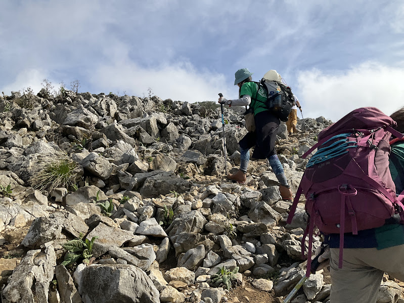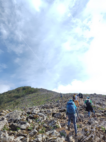 とても特徴的な風景ですが。。。歩きにくいですわねぇ。そしてとても開けているので道もわかりにくければ、風もかなり強く帽子が飛ばされそうになるので、帽子が飛ばされないためのストラップが必須でした。今回の風は、冷たくも、ぬるくもなかったので非常に激登りには有益なものとなりました。女性陣は寒かったかも。。。