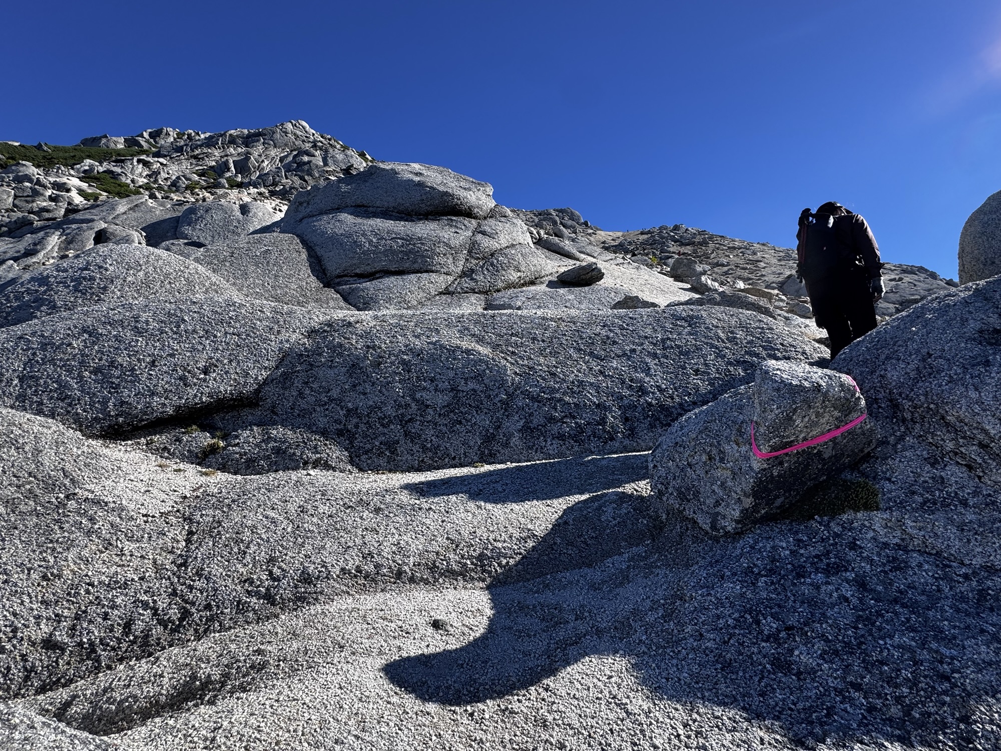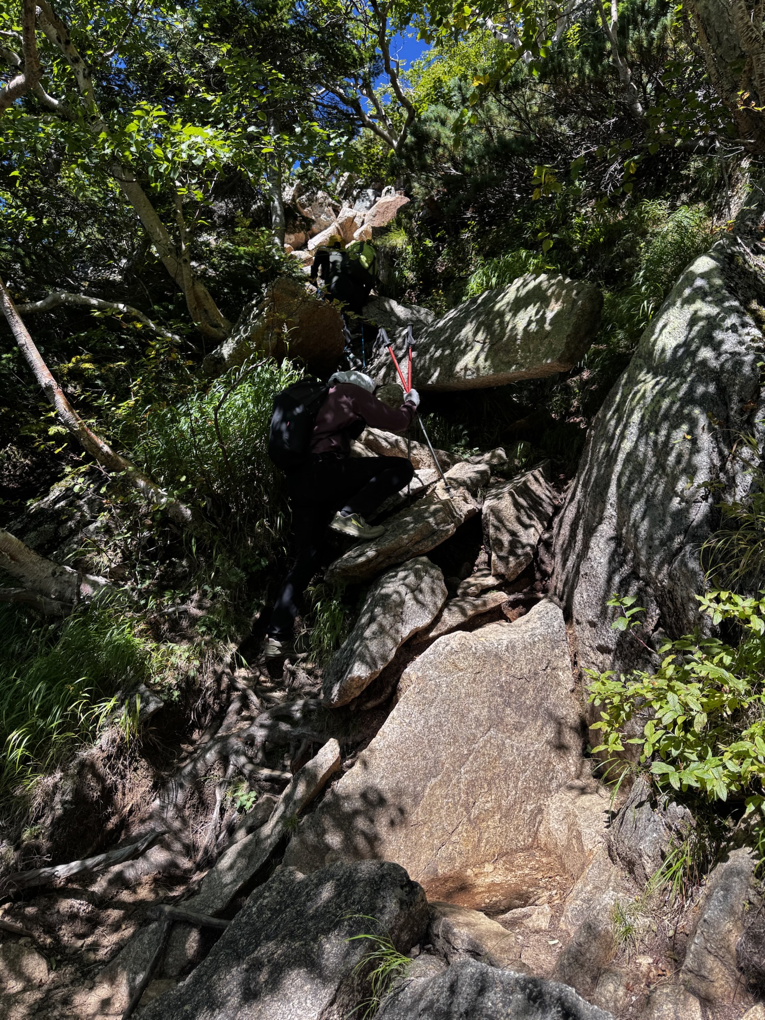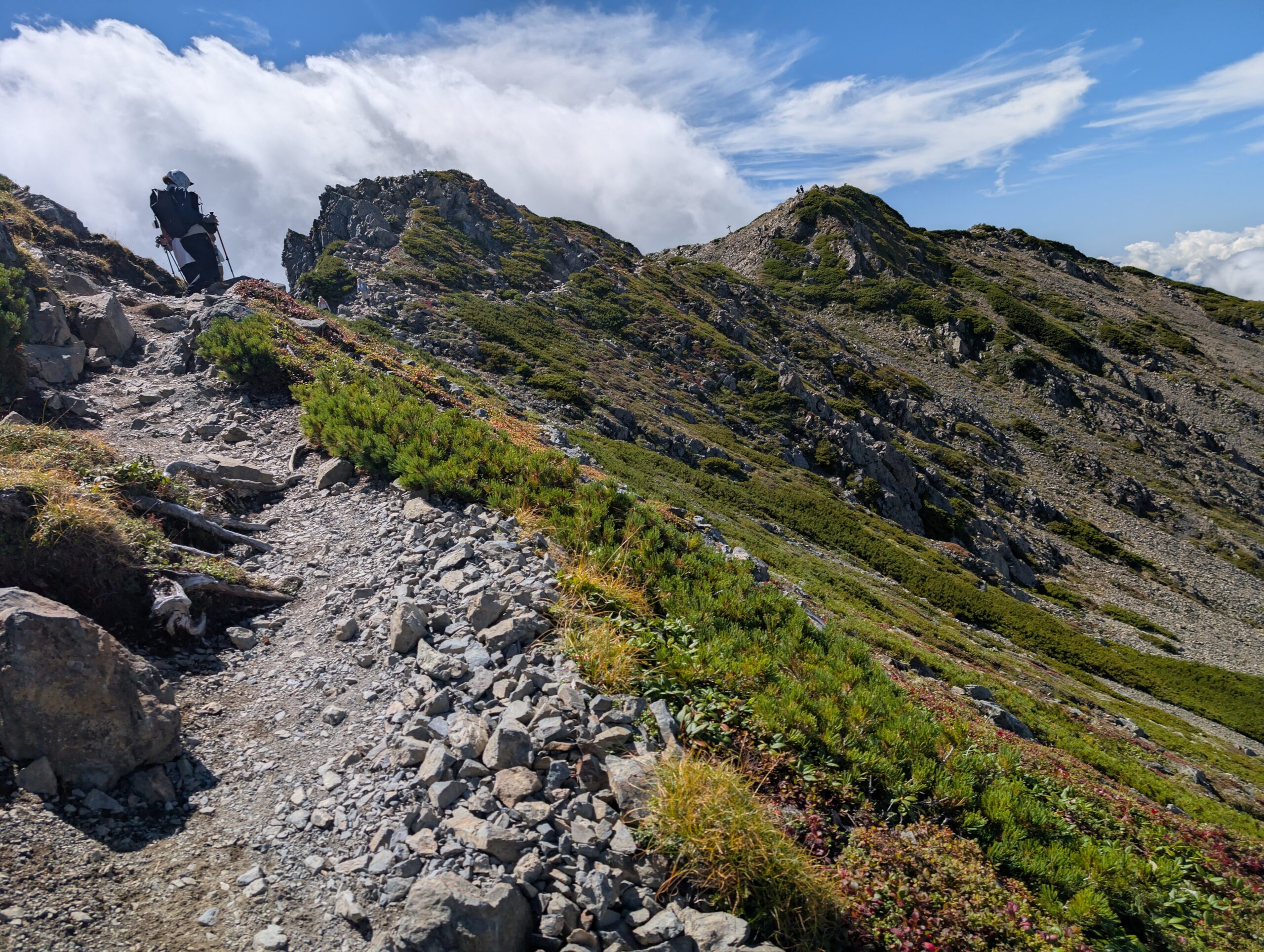たしか仙水小屋手前に危険個所あったような、とルートメモを想起しましたが、それにしても先行が全然進まず落石の危険もあったのでおかしいと思って見まわしたら右に安全な巻道があったのでした。