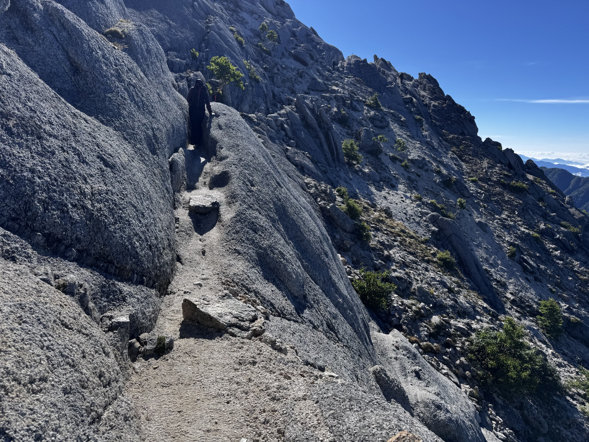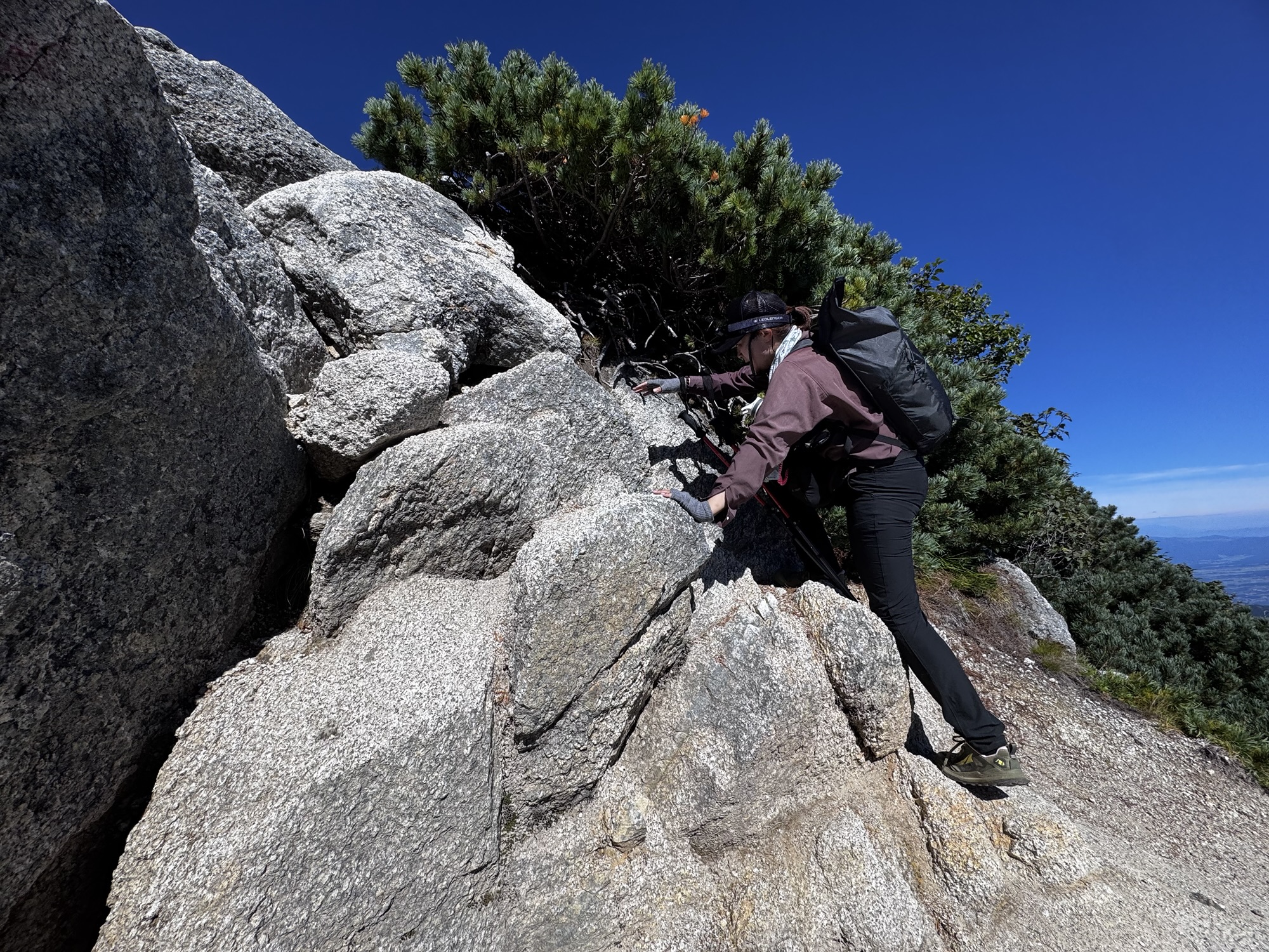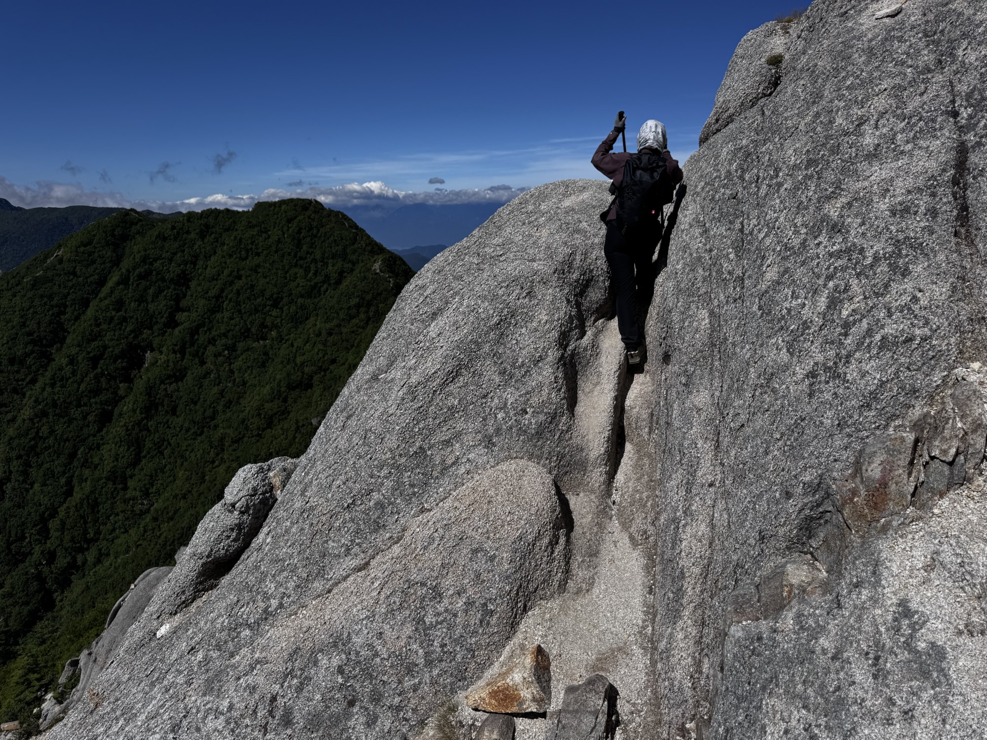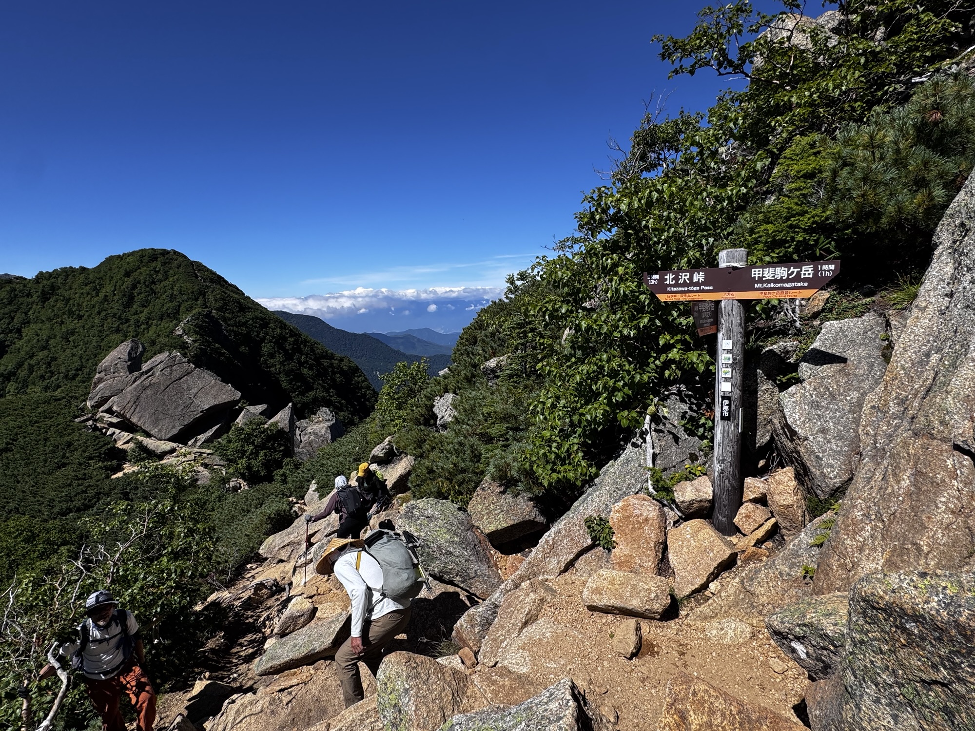 仙水峠からは急な登りで前衛「駒津峰」へ。そこから急降下、アップダウンの続く剣呑な道程になります。いつしか岩質が変わり、頂上への直登コース、摩利支天への分岐を分けてホームの鈴鹿のような花崗岩質のざれた斜面を登っていきます。