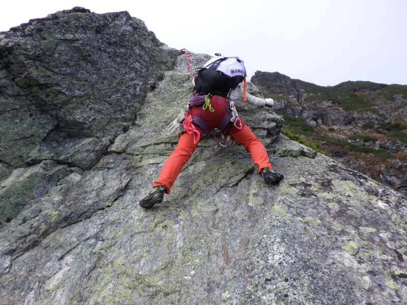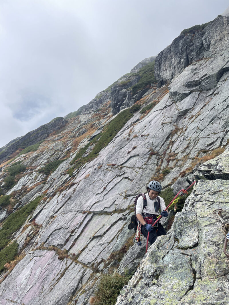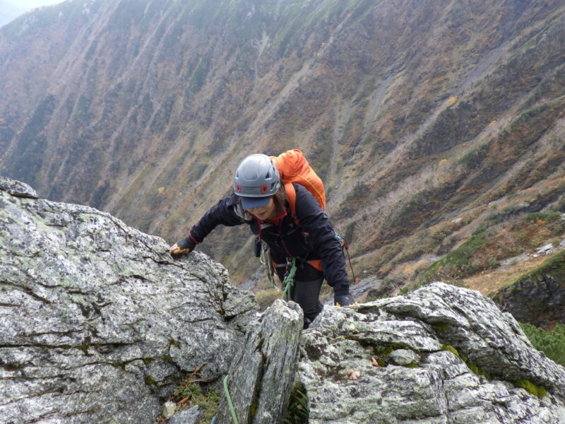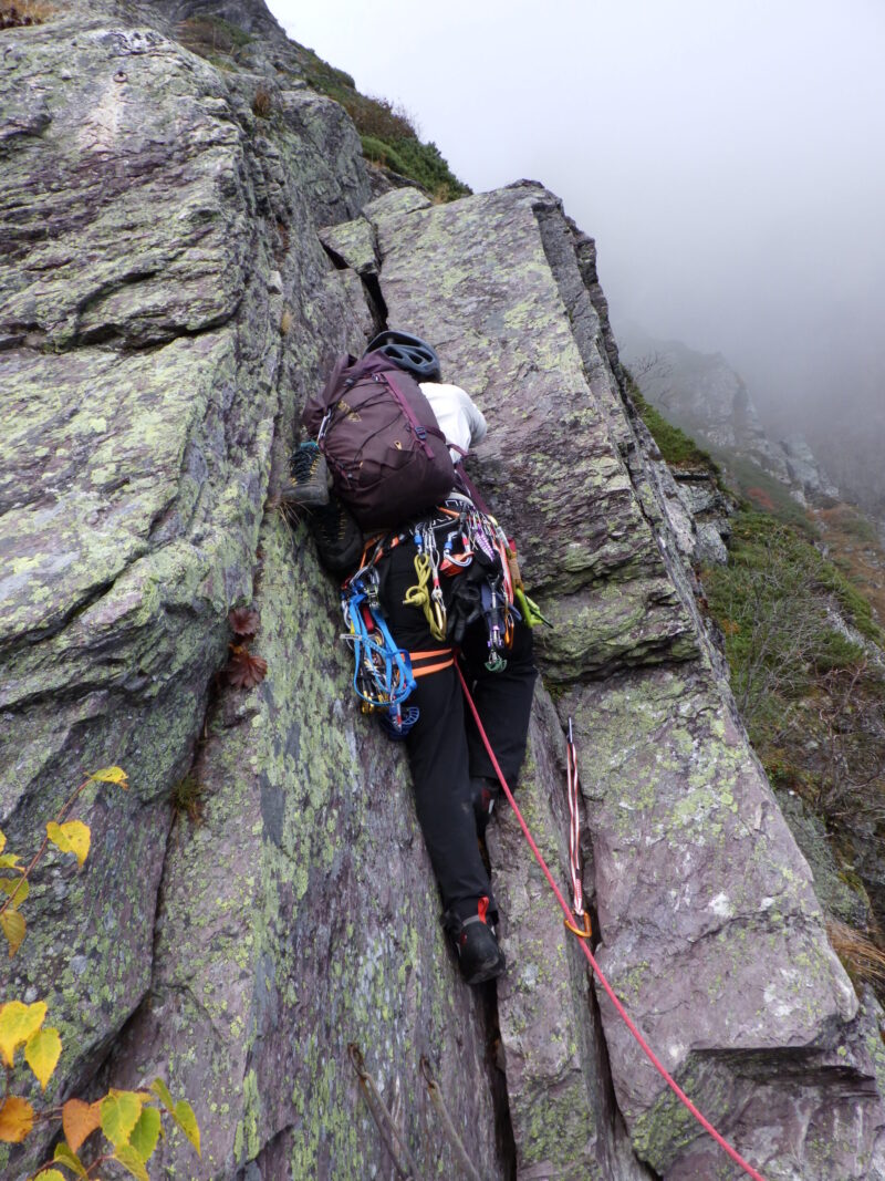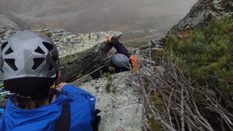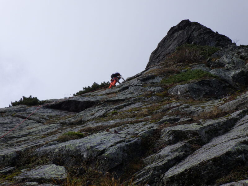 Bガリー大滝が終わると再び登山パート。多少のヤブ漕ぎと道迷いを挟みながら、C沢をトラバースしヒドゥンスラブへ取り付きます。残念ながらヒドゥンスラブはヌレヌレ。バットレス上部も濡れているのでは… と不安がよぎります。