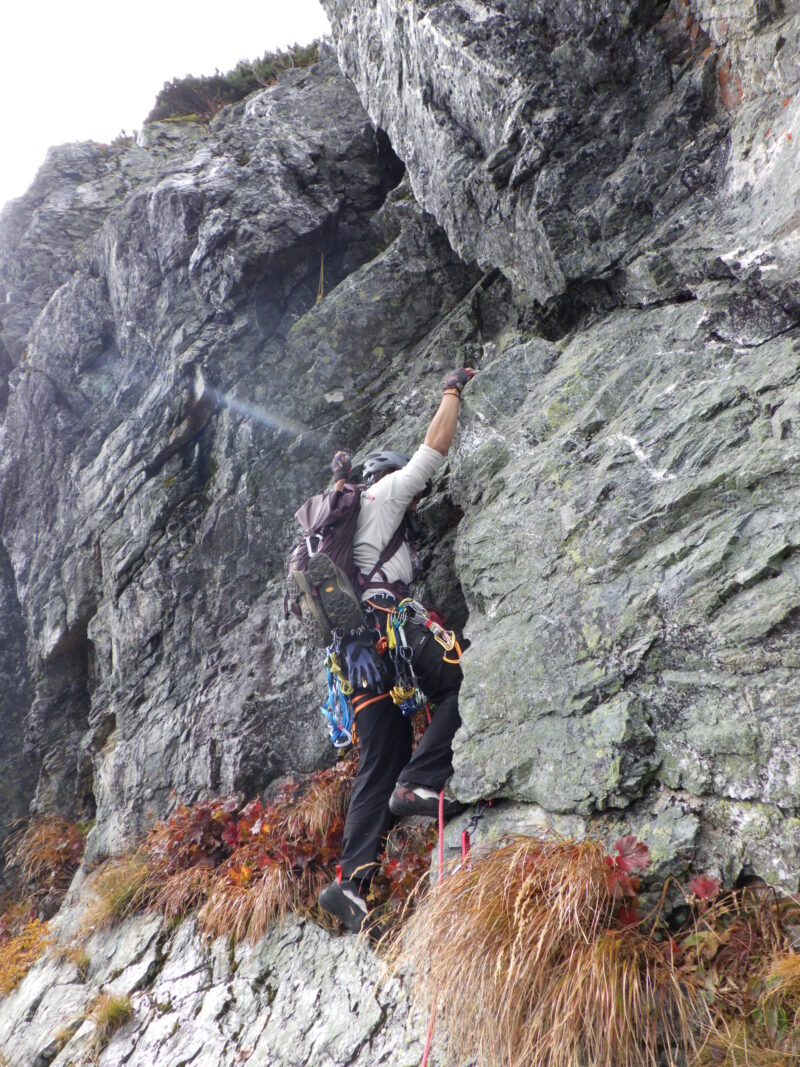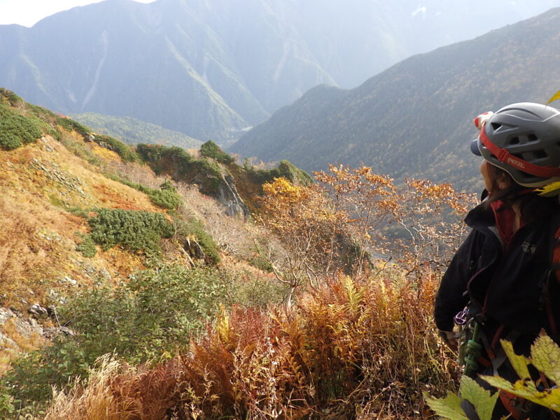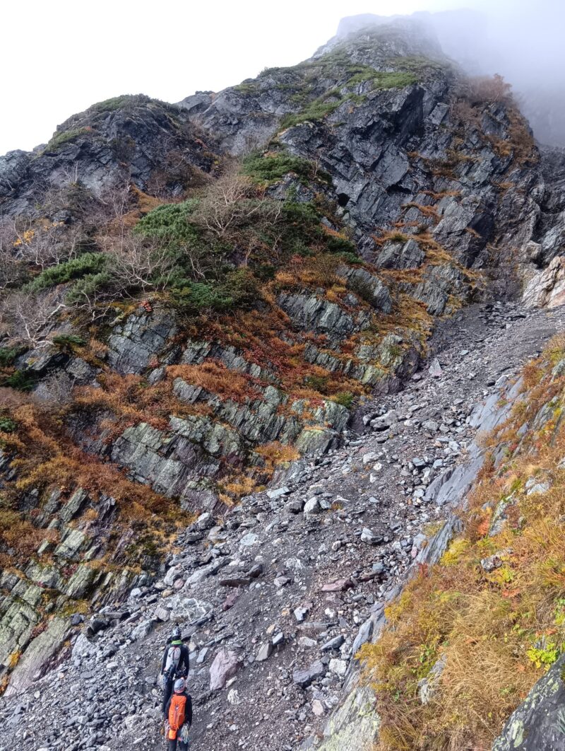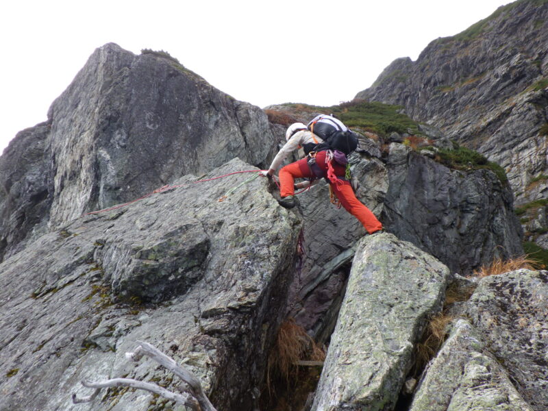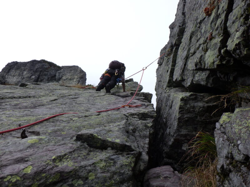 Bガリー大滝が終わると再び登山パート。多少のヤブ漕ぎと道迷いを挟みながら、C沢をトラバースしヒドゥンスラブへ取り付きます。残念ながらヒドゥンスラブはヌレヌレ。バットレス上部も濡れているのでは… と不安がよぎります。