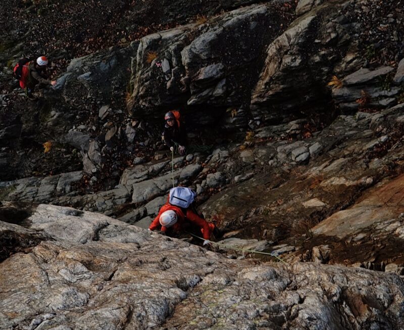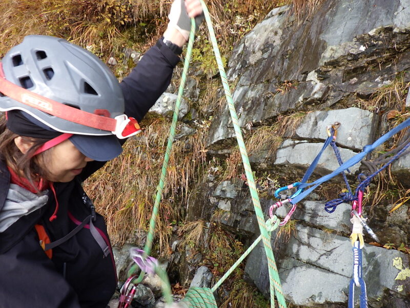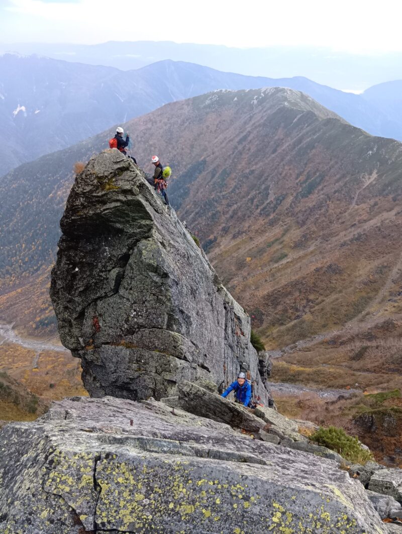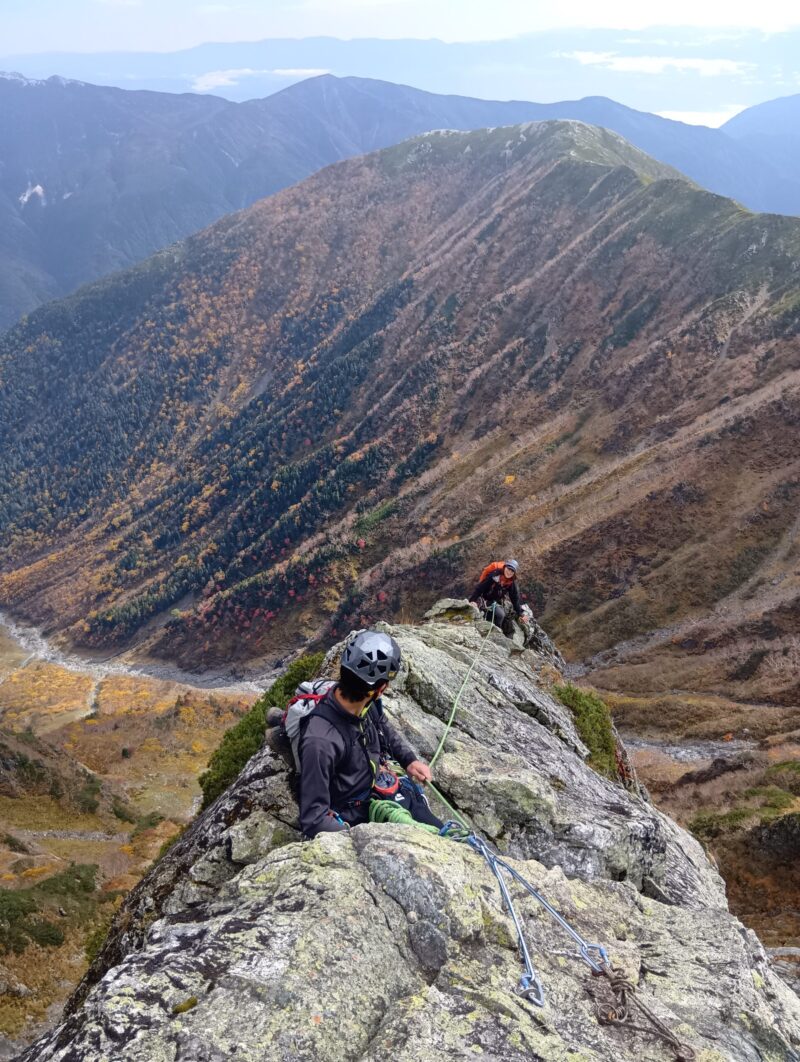 その後はマッチ箱の上から懸垂下降。実はワタクシ、これが初めての懸垂一番槍で緊張。どこに降りればいいかもよく分からなかったため、バックアップを取りながら登り返しも想定して下降しました。幸い適切な場所に降りれたようで一安心。皆さんも続々降りてきます。