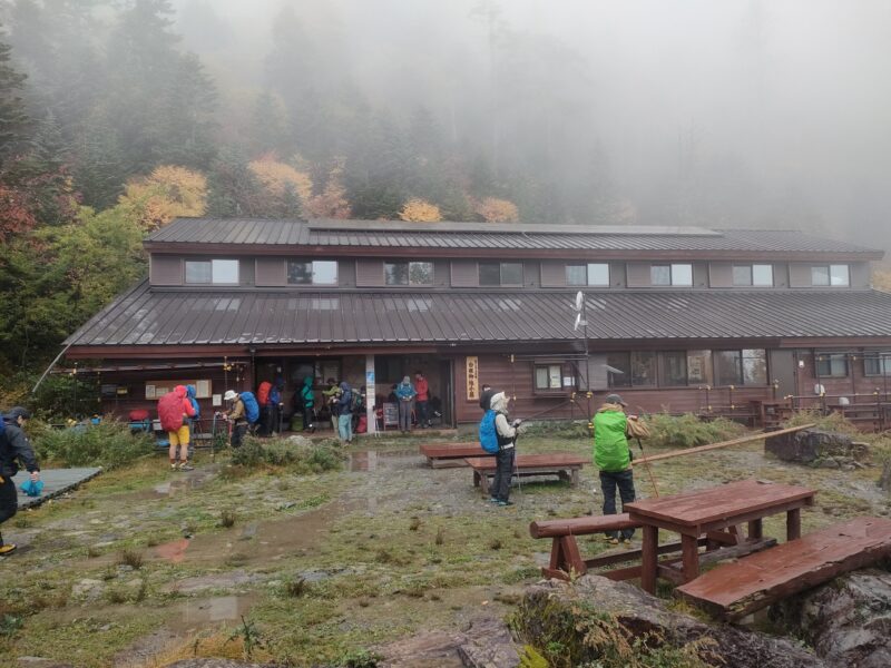 はい、めっちゃ雨です。広河原でも既にシトシト降っており、白根御池小屋までの道でとうとう本降りに。久々にレインを着て歩きます。