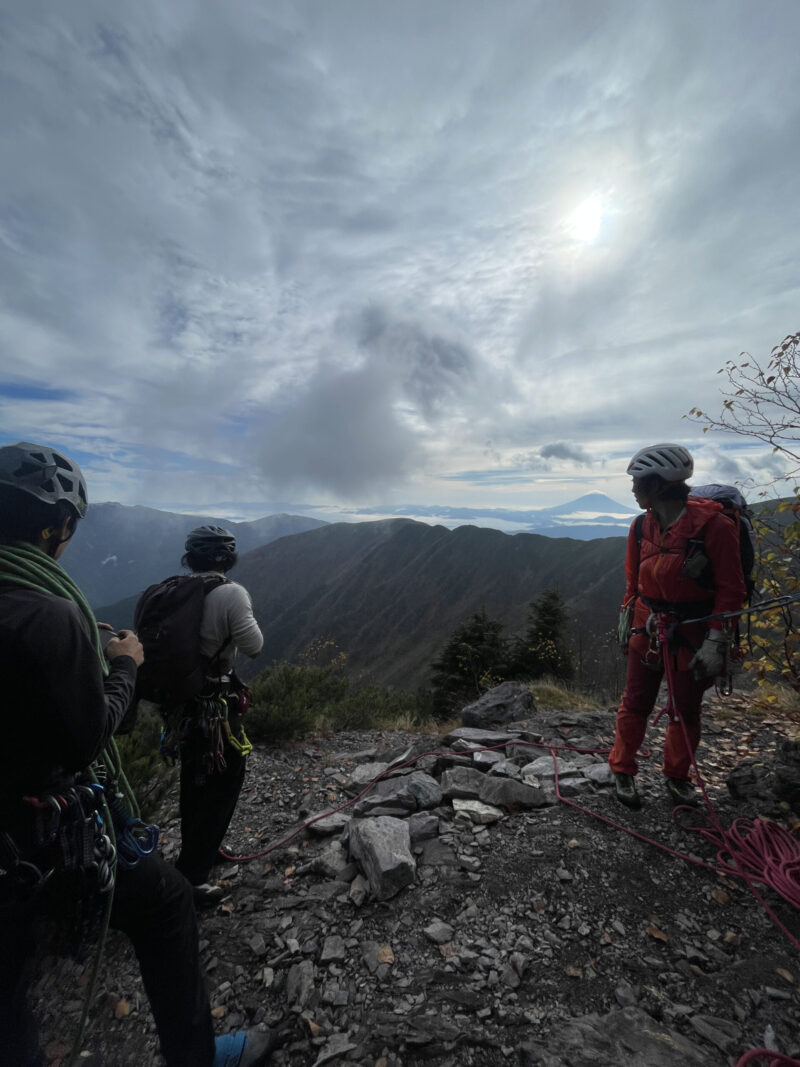 スラブを抜けると、下調べで100回は見たであろうクラックを発見。ここまで来ると岩は乾いていて一安心。帽子を被った富士山が出発を見送ってくれます。