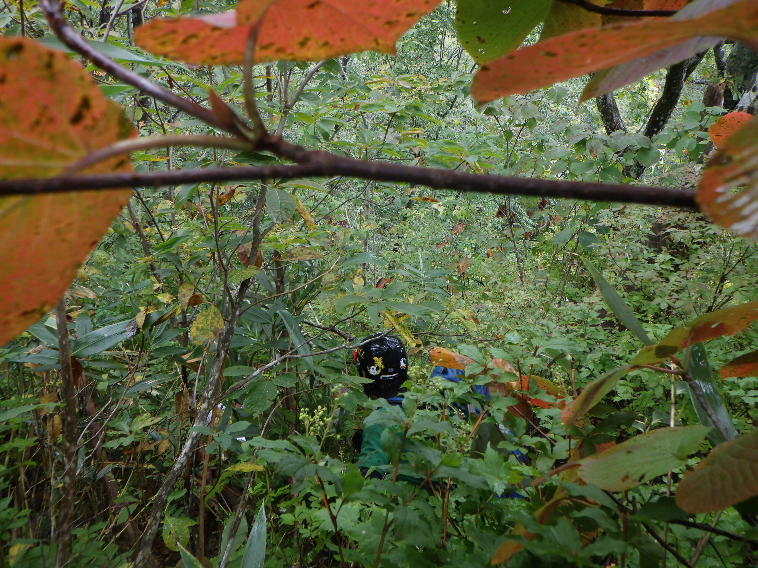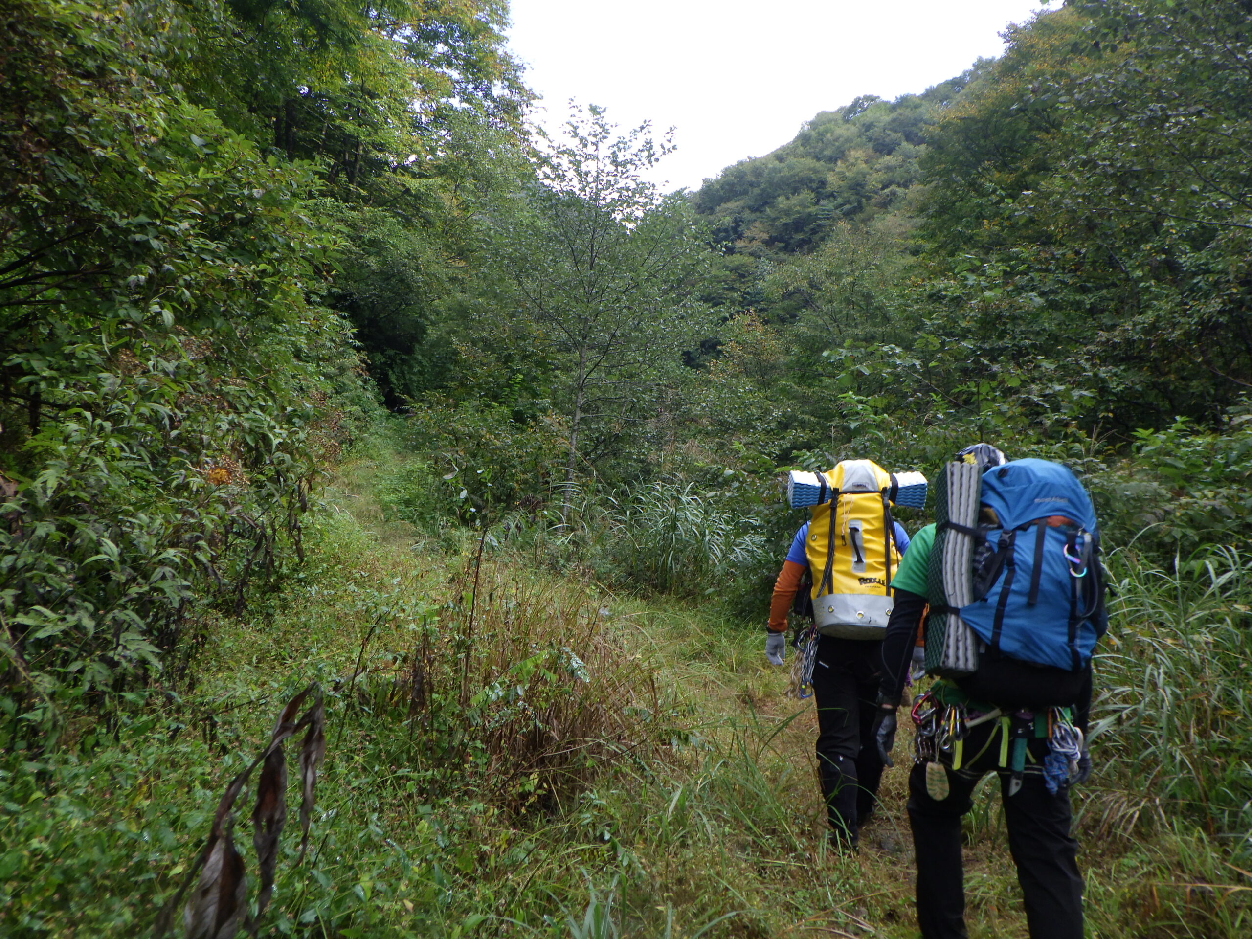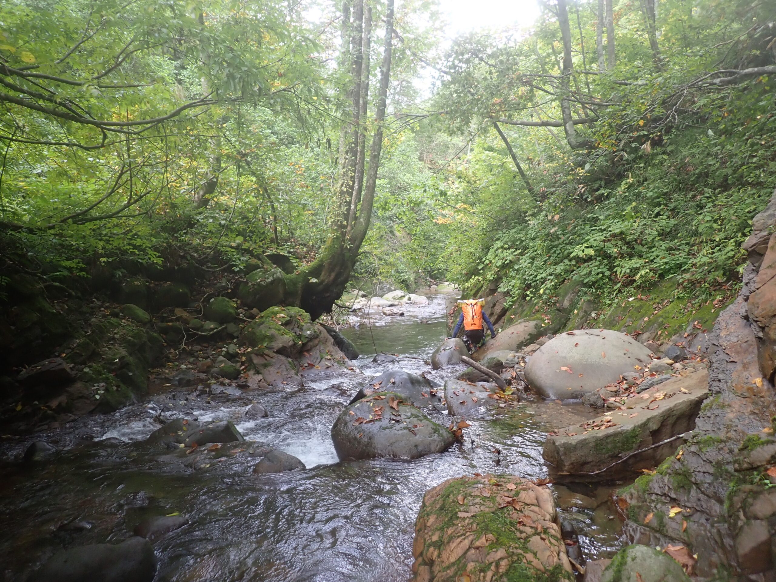 初河谷出合P(8:20)~八反滝下(9:00)~Ca1330二俣(13:40)~尾根取り付き(14:35)~稜線(15:15)~倉谷本流(16:45)~泊地(16:50)