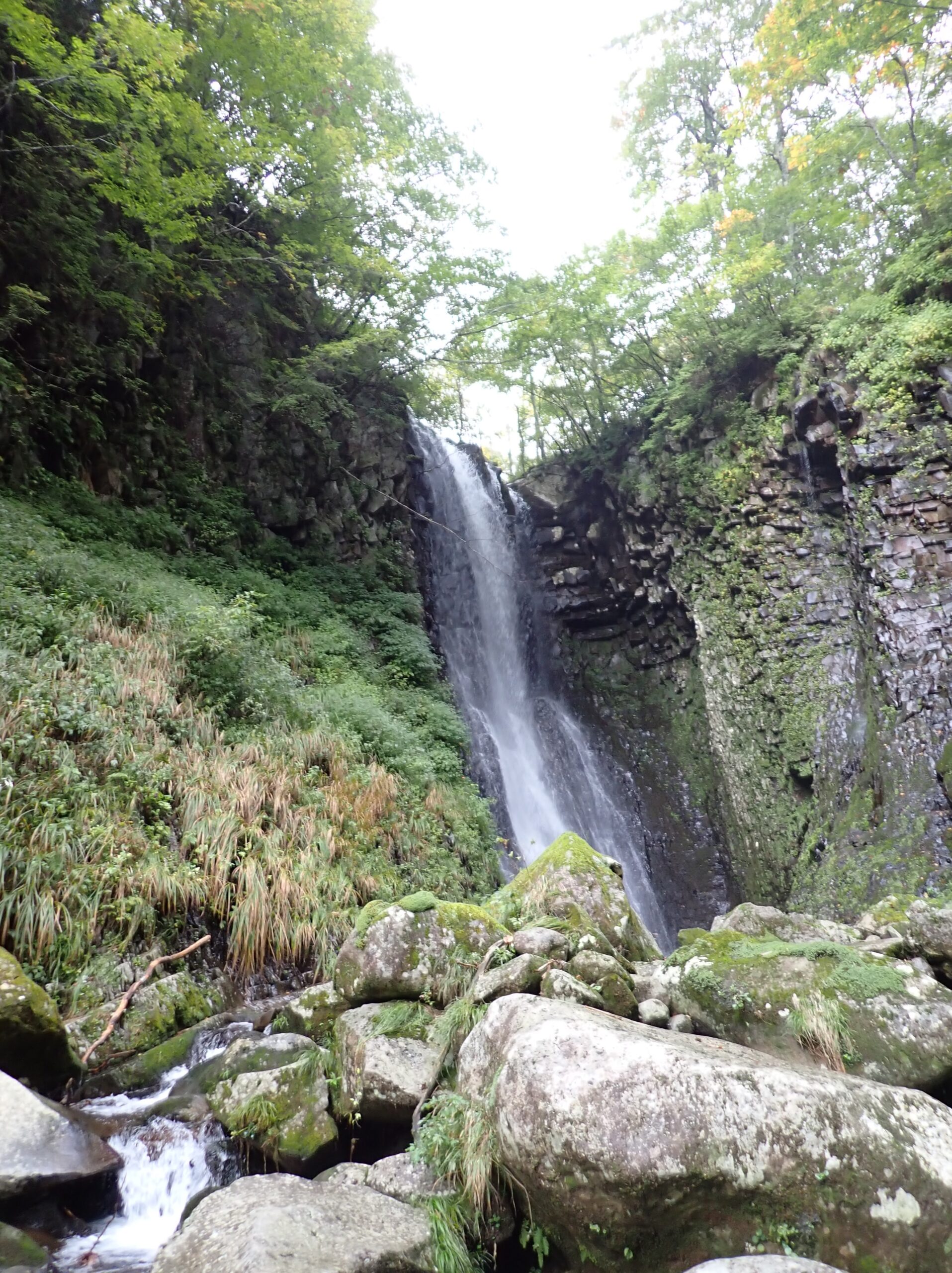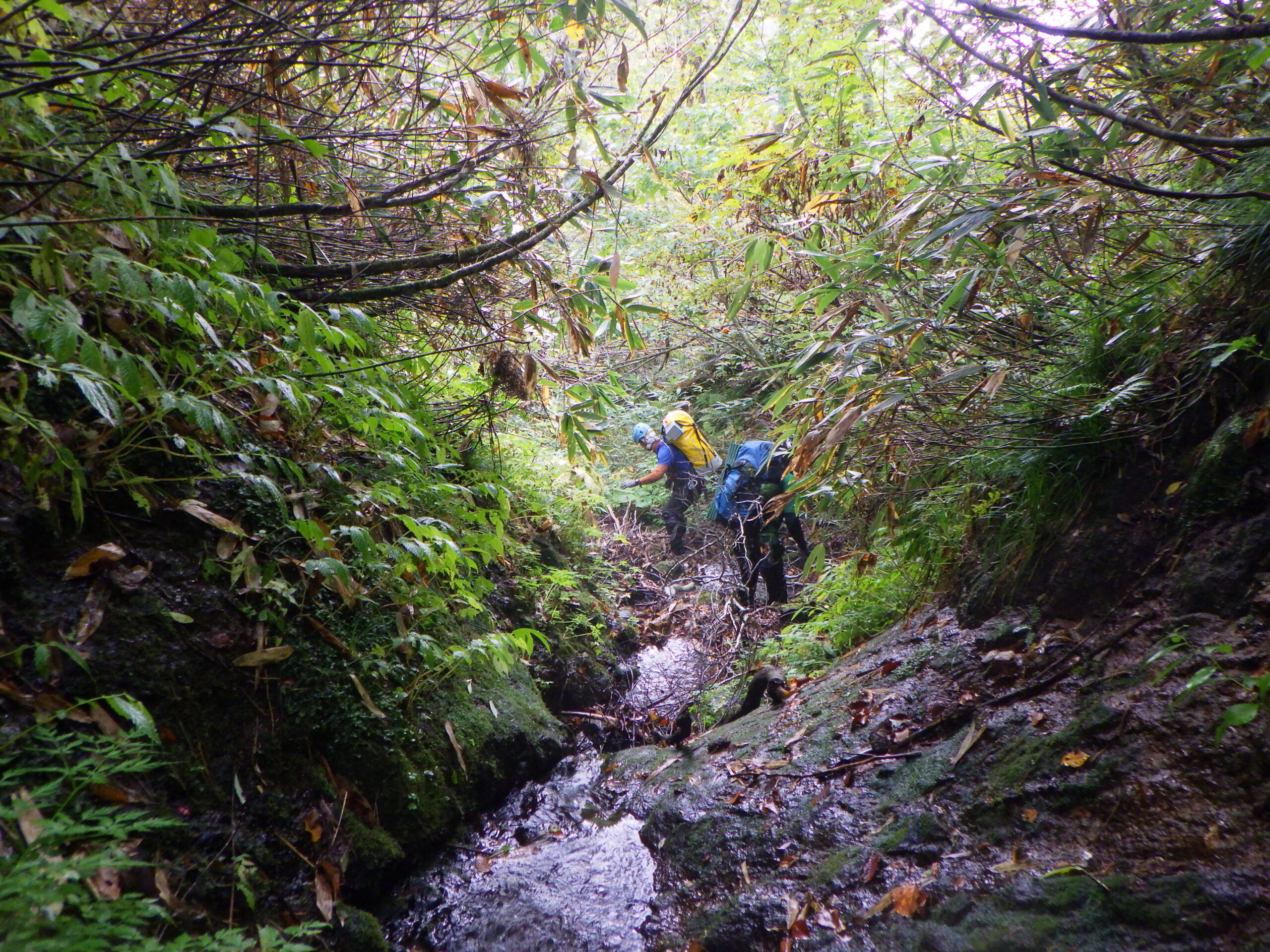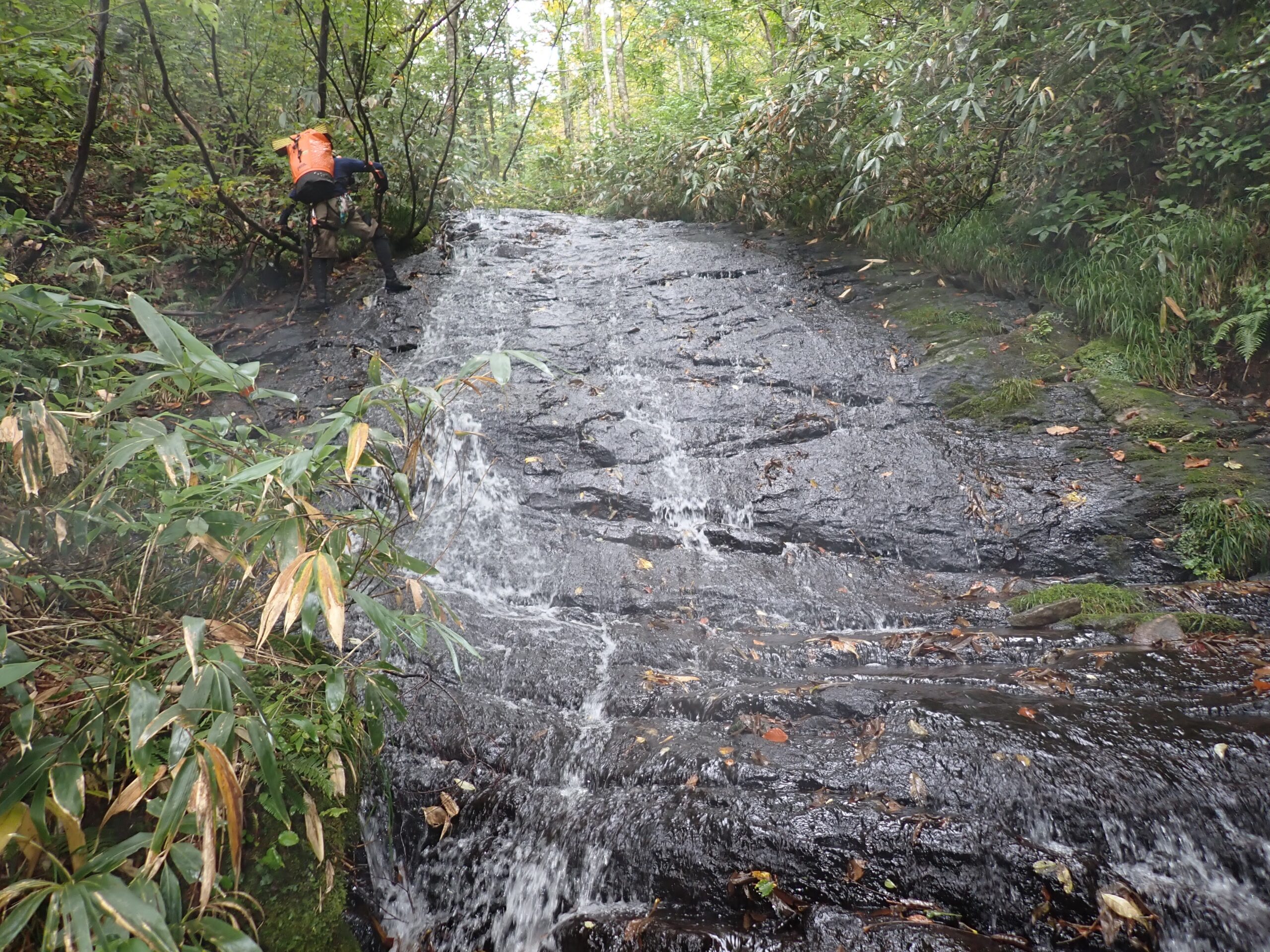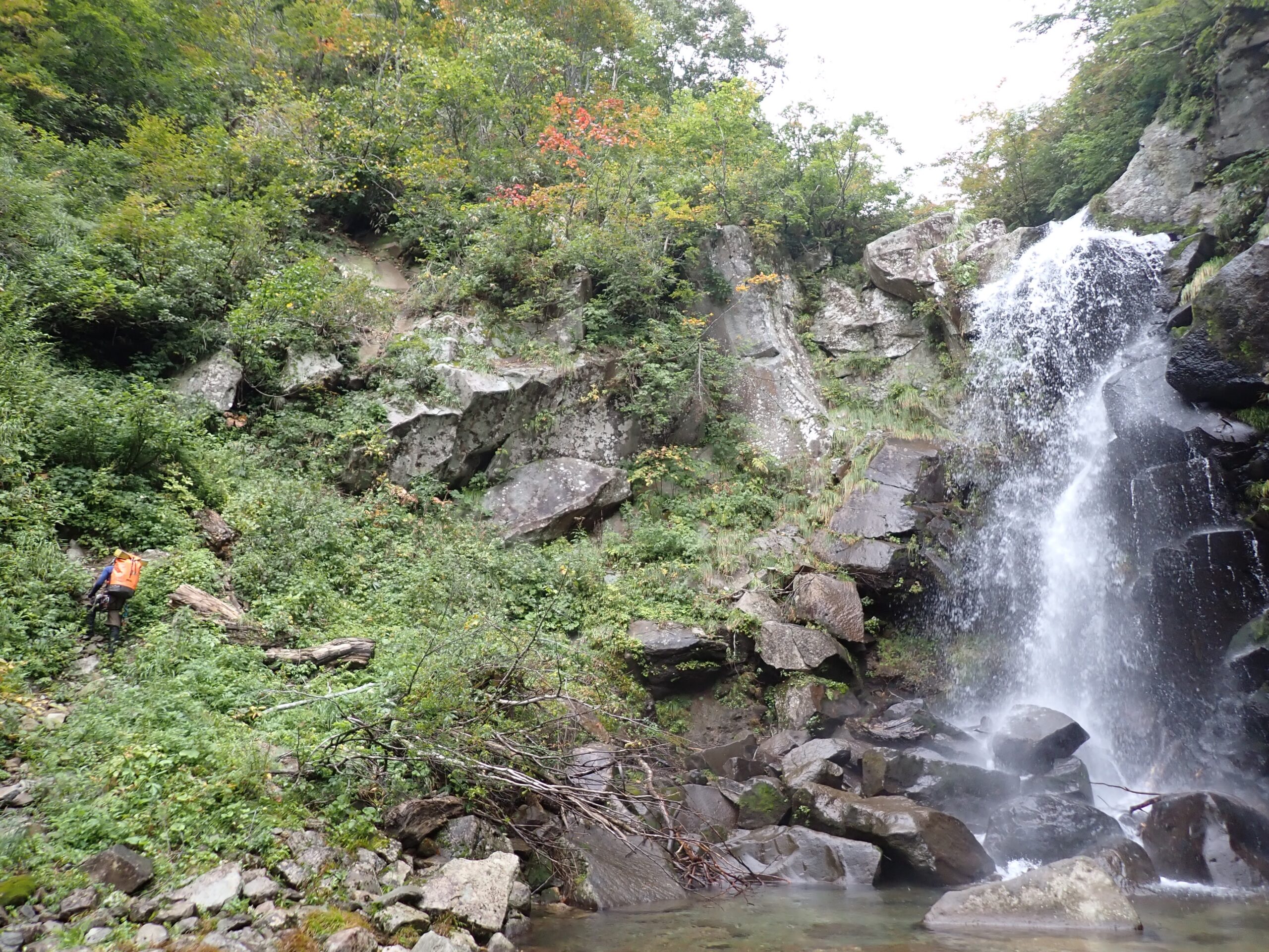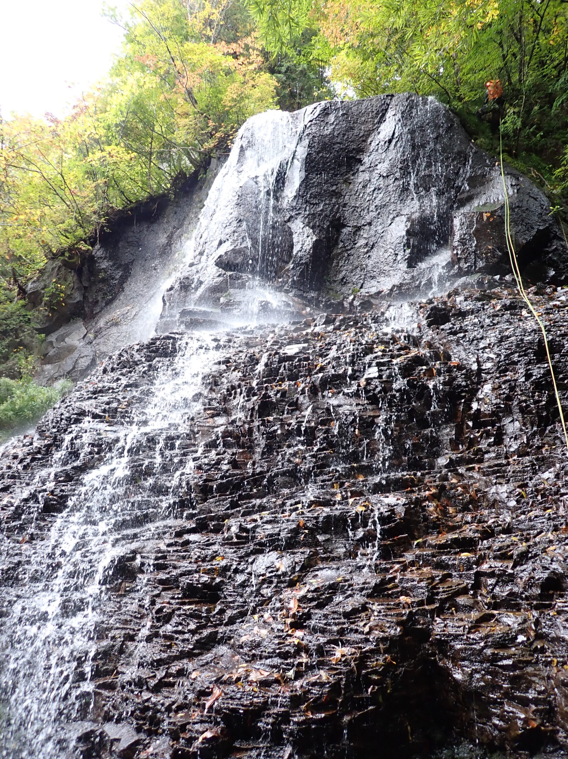 40分ほど歩いて八反滝に到着。30mほどある立派な直瀑だ。両側とも壁になっているので少し戻って埋もれた土管のあるところから右岸に取り付く。藪まではいかないが木々の生い茂った急斜面を150mも登って小尾根を乗り越す。下りた先はナメになっているので慎重に下る。出合いは立派な滝になっているので懸垂で本流に降り立つ。
