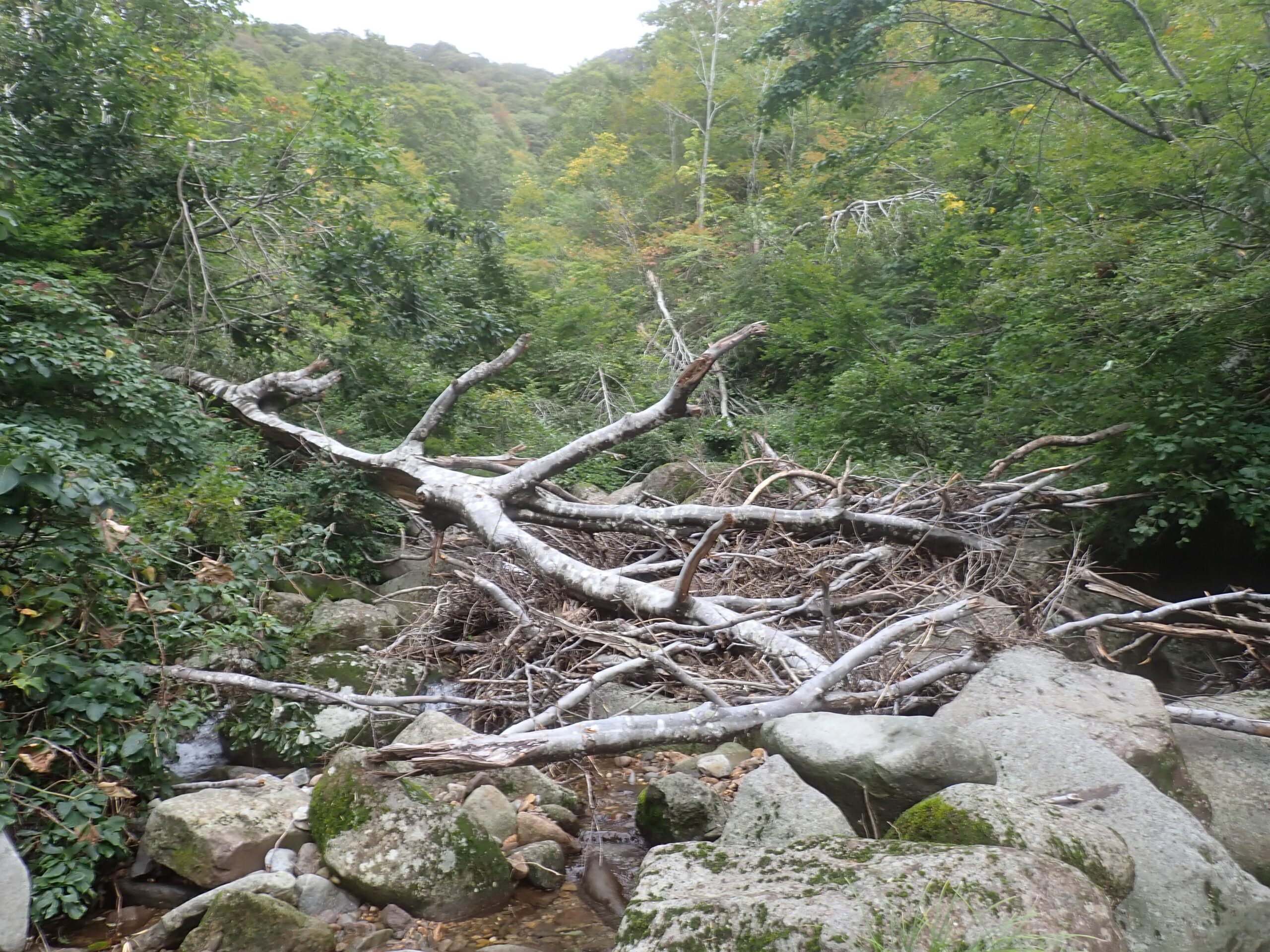 途中、倒木が大量に堆積している場所を通過野に苦労する。今年は雪が多かったので雪崩で木が薙ぎ倒されたのだろうか。
