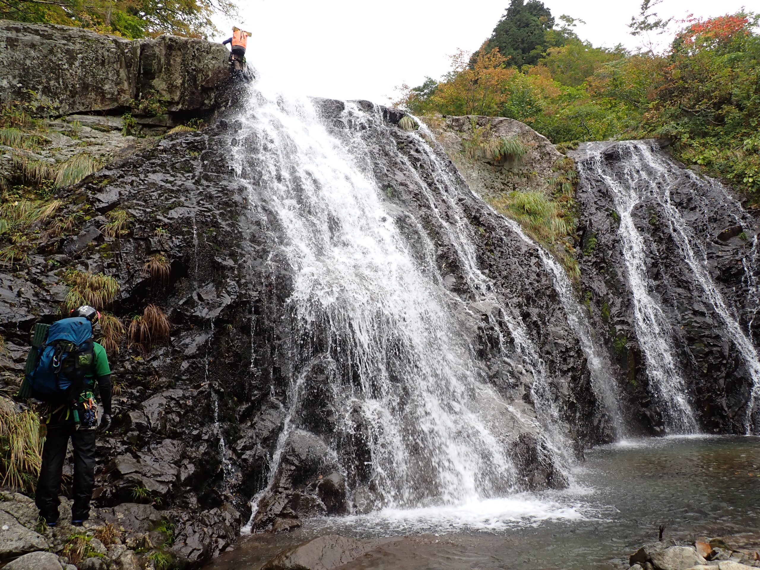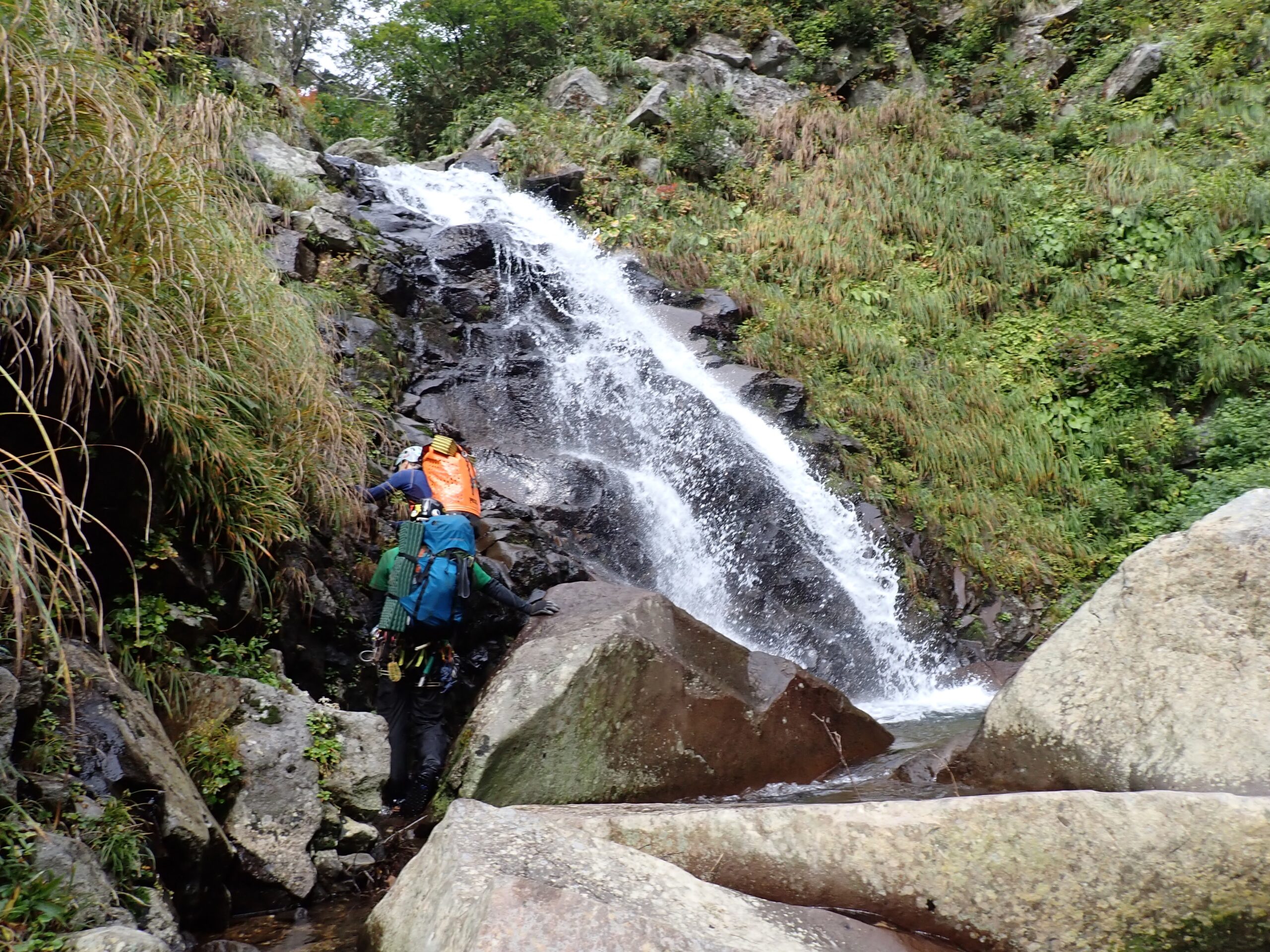 1320m二俣には滝マークは無いものの美しい滝がかかっている。たまちゃんは左側から直登にトライしたが、乗越しがツルツルの岩なので苦戦している。ゆうさんにショルダーしてもらって何とかクリア。土台になったゆうさんは冷たい水を思い切り被っていた。私は見ているだけで寒くなってきたので右側から登った。(こっちの方が簡単)
