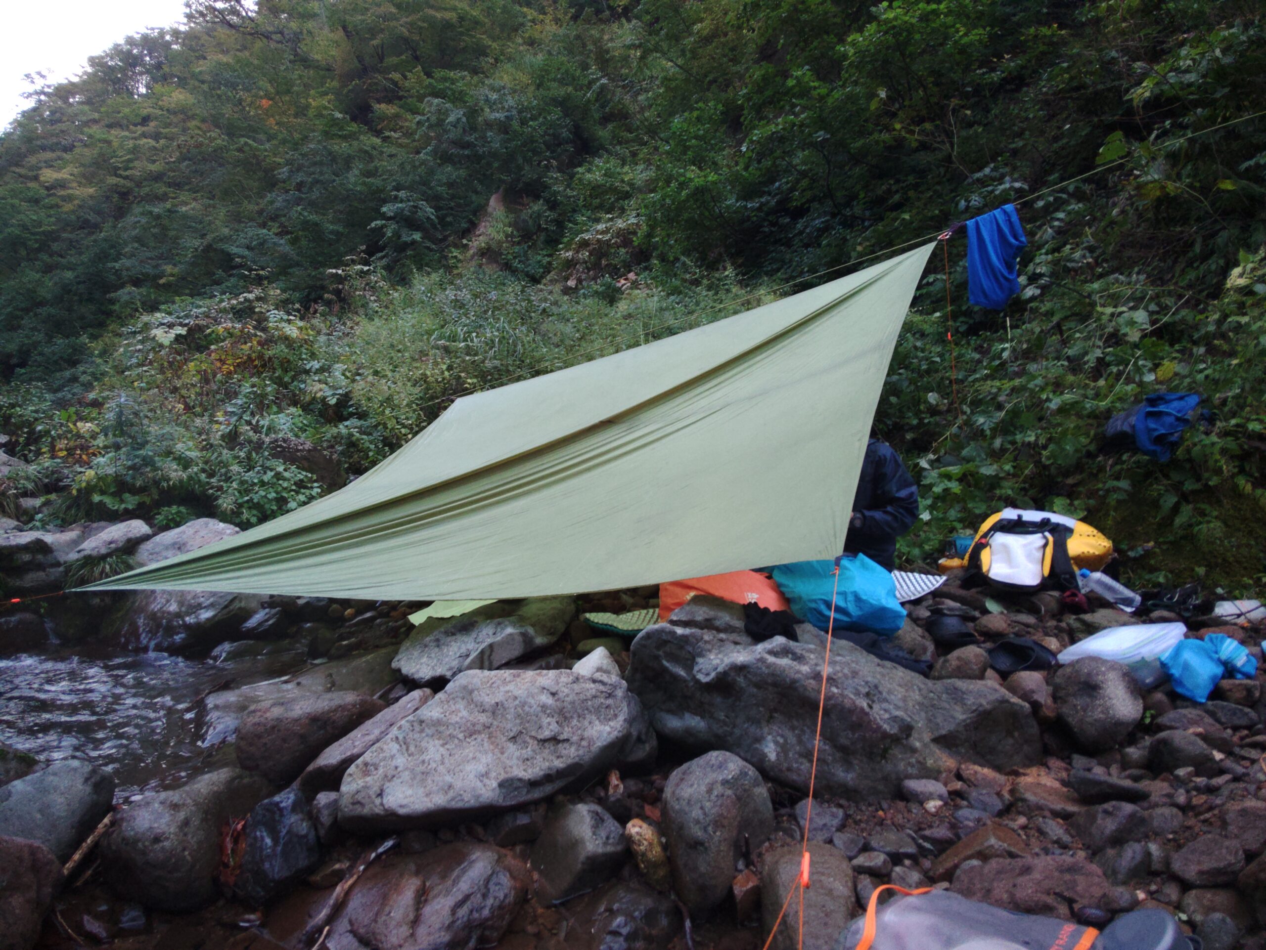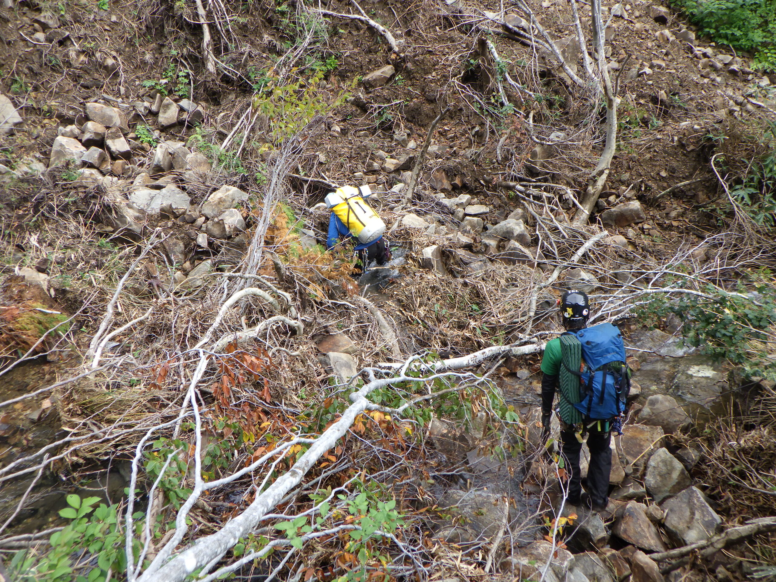 尾根を越えたのが15時15分。倉谷の本流にある泊適地まで明るい内に付けるかドキドキしていたがロープを出すような難所も無く、何とか本流に辿り着けた。上から河原が見えた時にはほっとした。