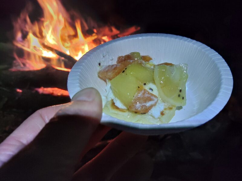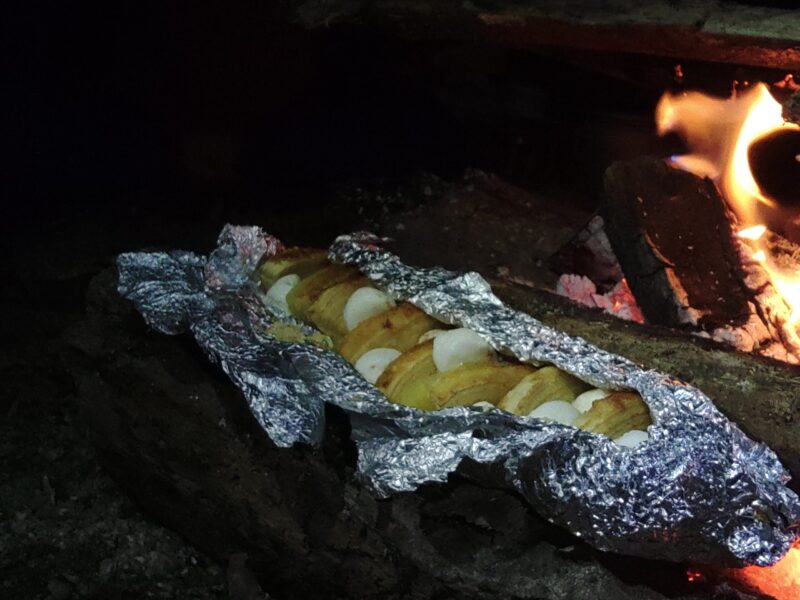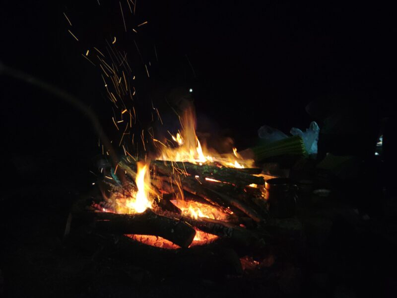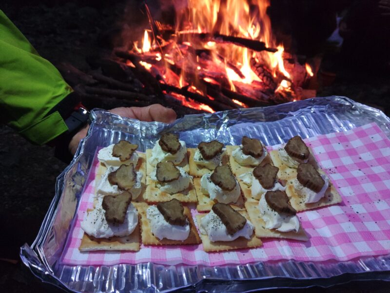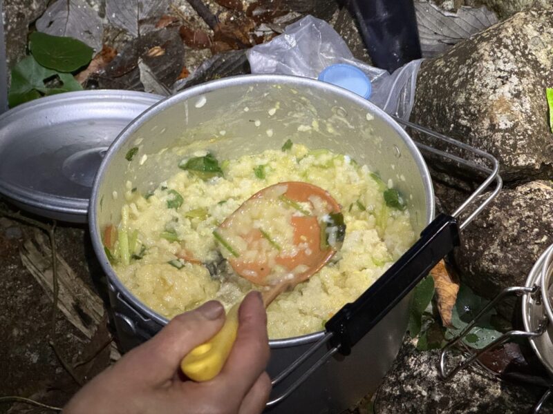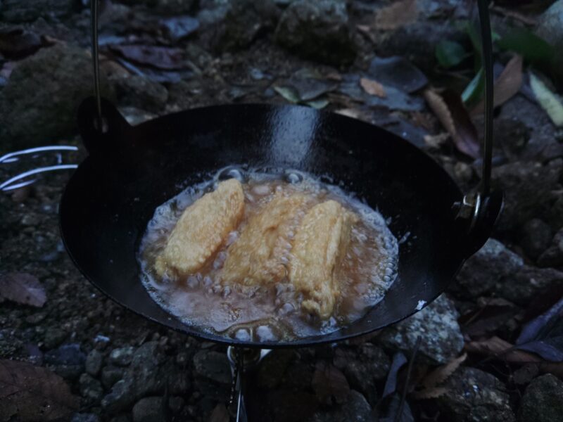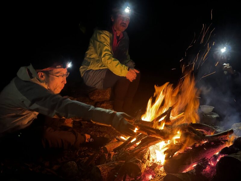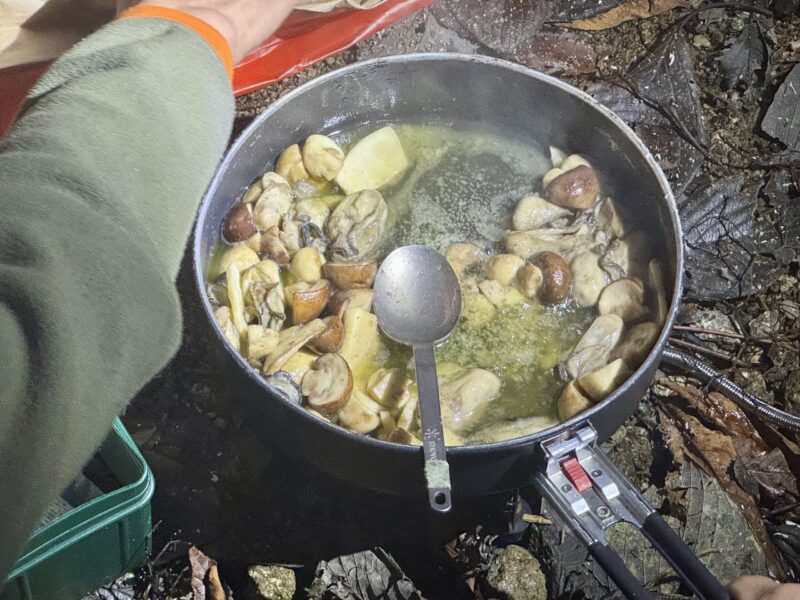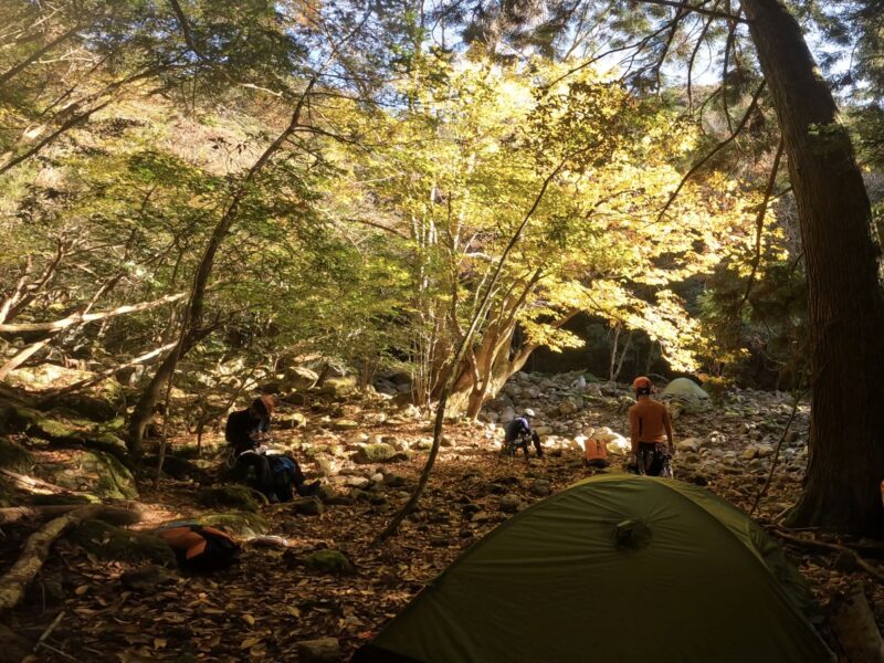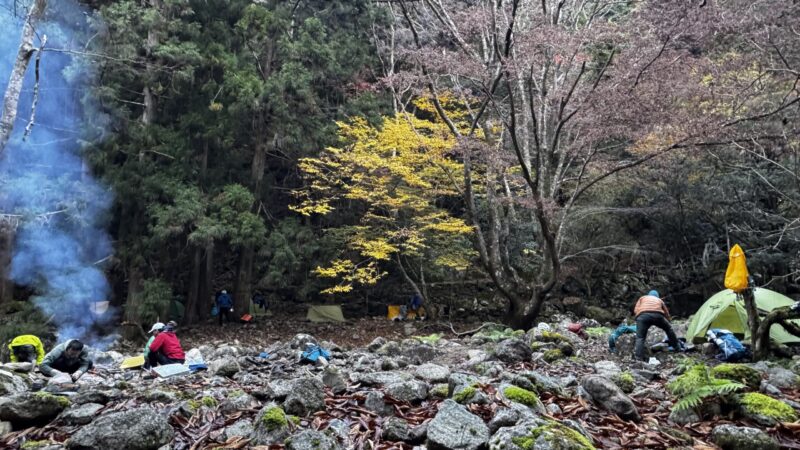 植林小屋まで遡行した所で、時間切れのため引き返します。下山は、登山道をつかって泊地のケヤキ平に15時前に到着。「よっしゃあああ!焚火を起こして宴会や!」ということで“デキる”メンバーの方が美味しいものを沢山用意してくれていました。焚火を囲んで呑んで食べて仲間と語る贅沢な時間です。牡蠣鍋の美味さが染みます。