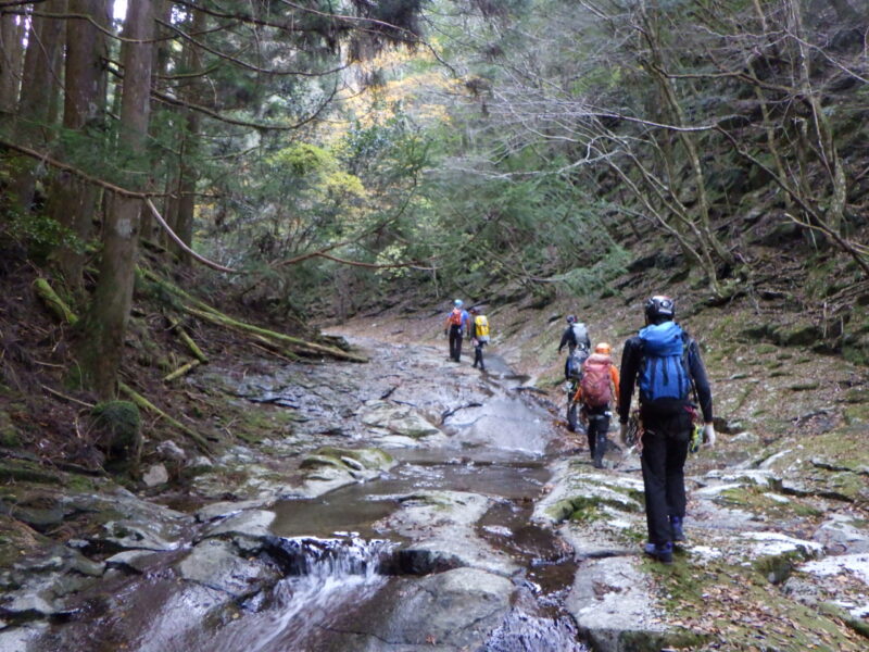 冬の沢は、南紀。というわけで南紀は立間戸谷へと繰り出しました。下和気の登山口から沢沿いの登山道を歩きます。2時間ほどで泊地のケヤキ平に到着です。