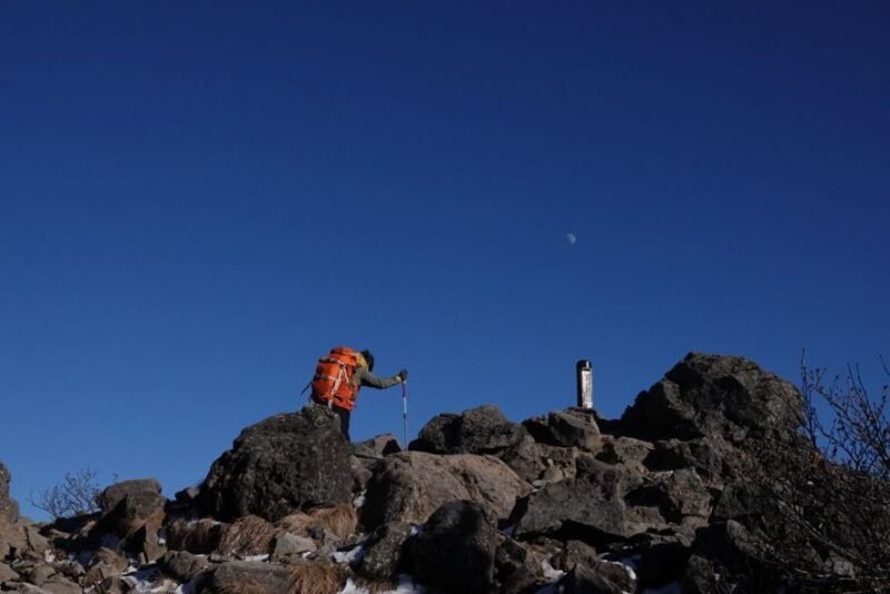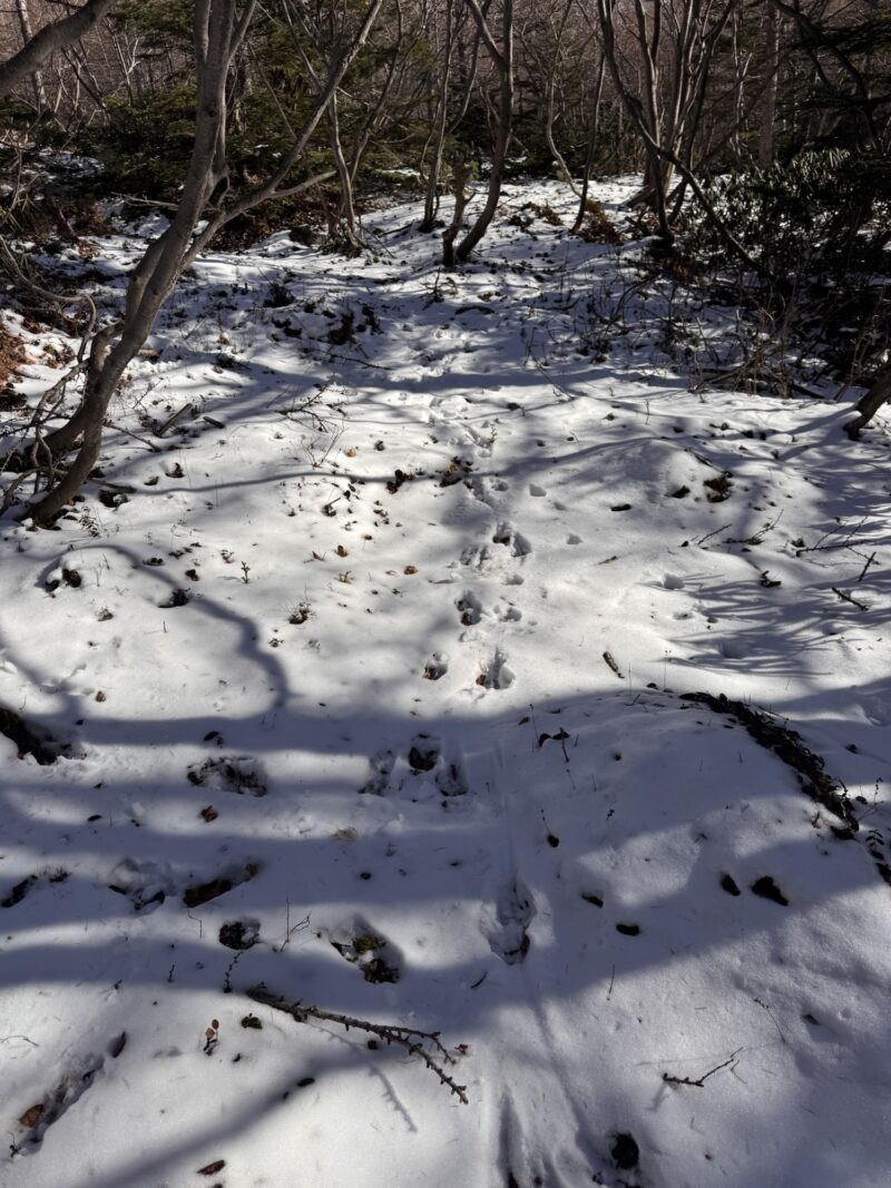 最寄りの道の駅で車泊し、翌朝、高峰高原ビジターセンター(車坂峠登山口)へ向います。道路にはほとんど雪はなし。車坂峠からトーミの頭までの登山道は、所々凍結している箇所もあったので、軽アイゼン装着しました。