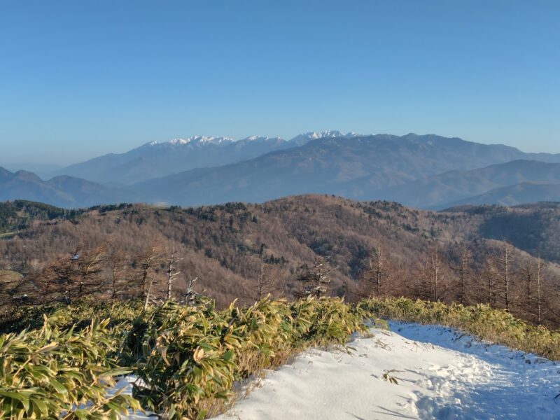 振り返ると真っ白な中央アルプ