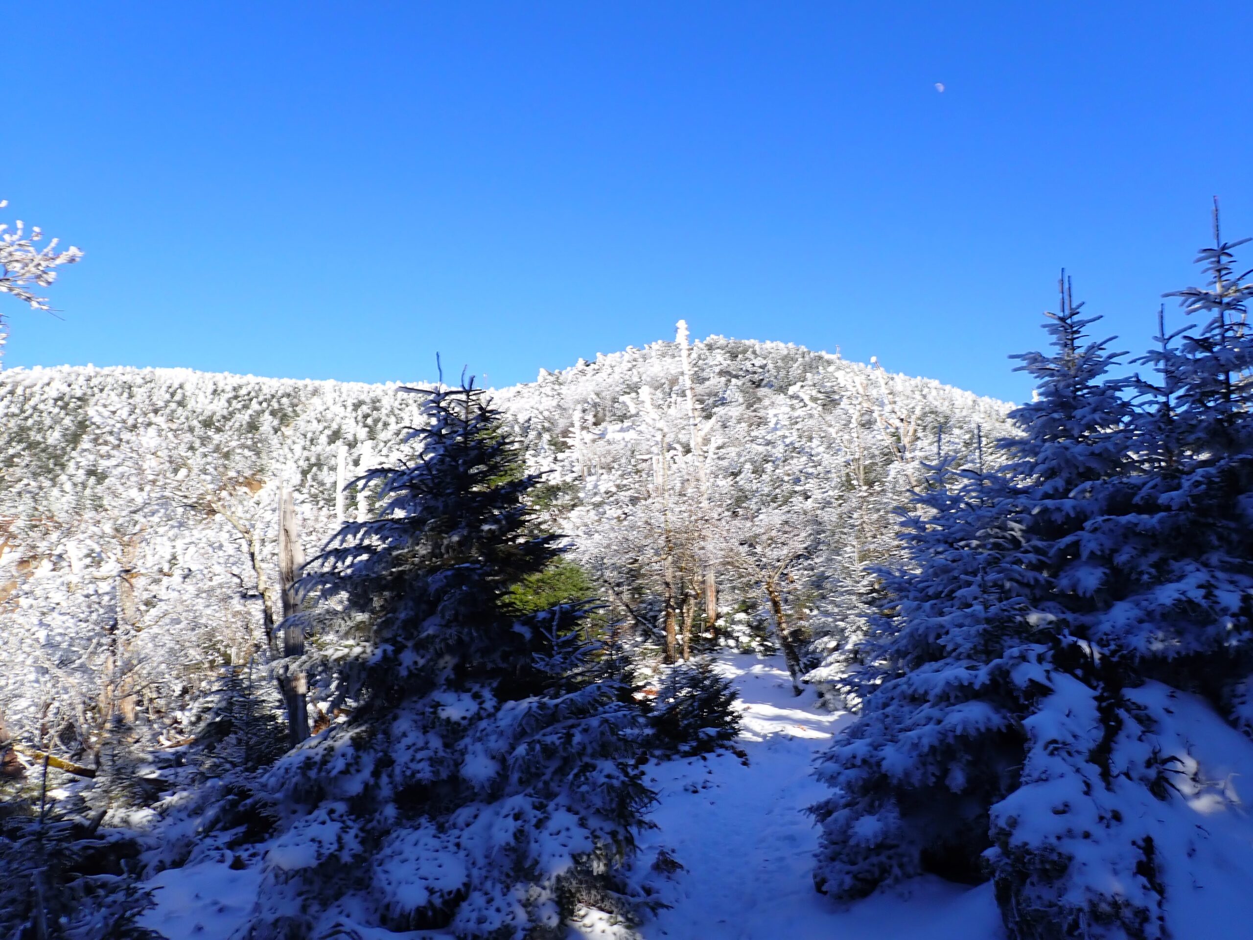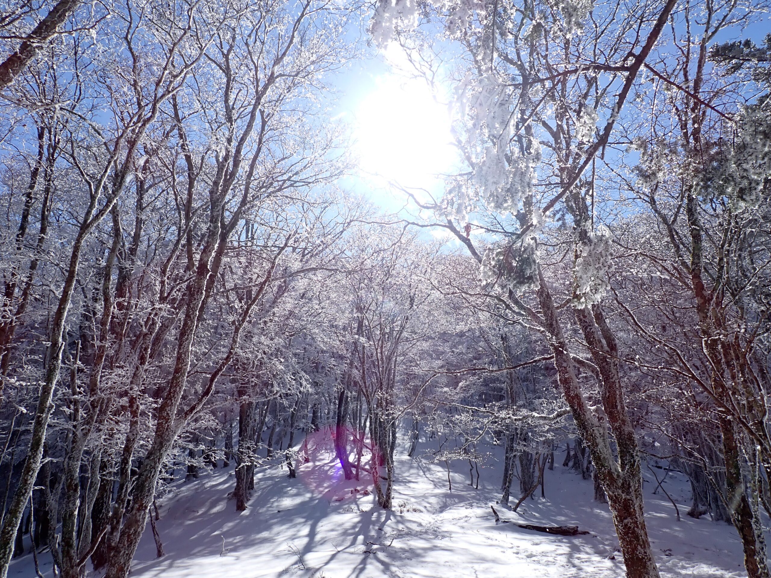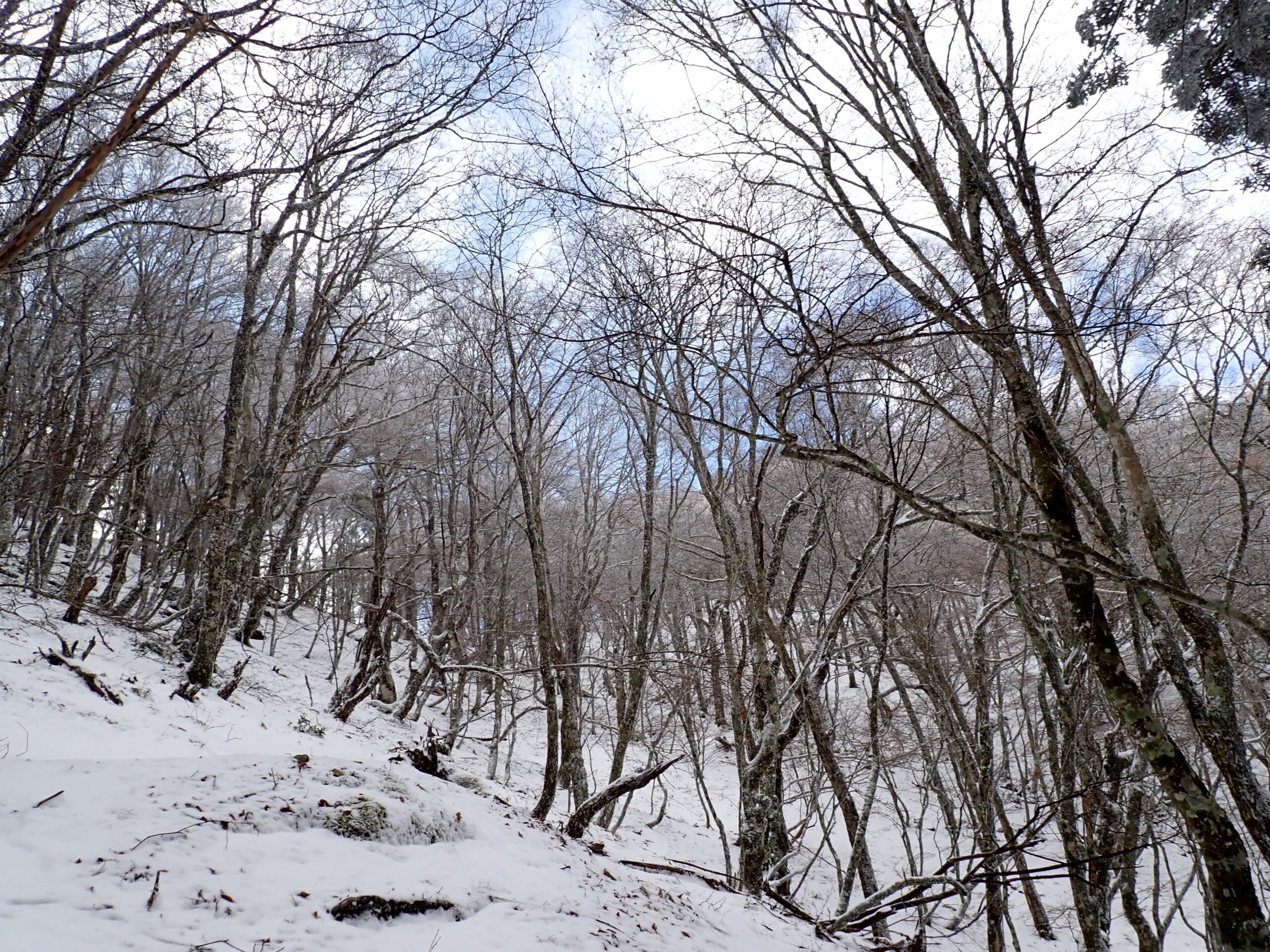 金引尾根分岐からは傾斜も緩やかになり、歩くのも随分と楽になってきた。頭上には青空が広がり、木々は霧氷が輝いている。うーん、いい感じ。思ったよりも早い時間に狼平に到着した。