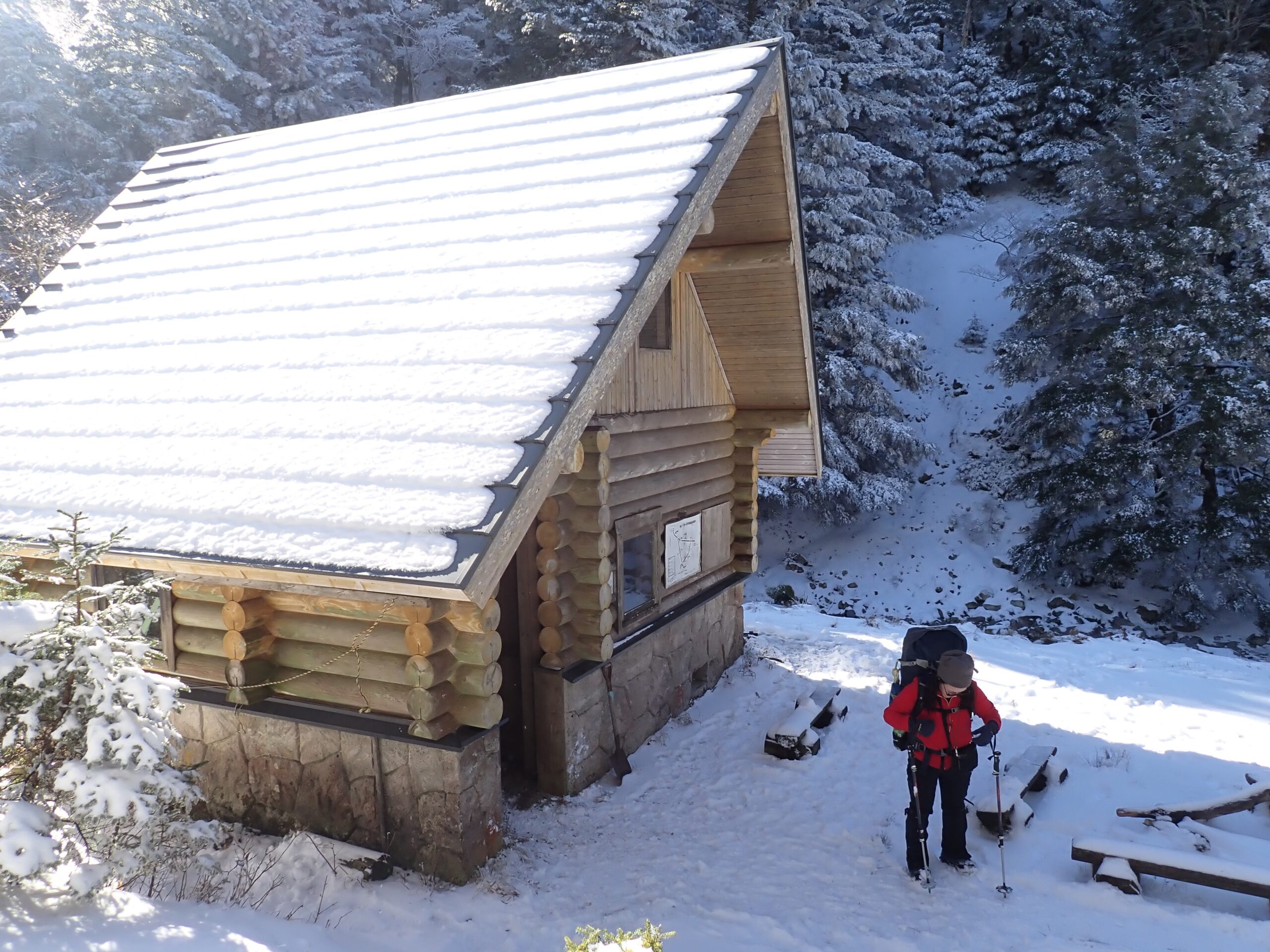 林道終点から金引尾根に取り付く。雪がうっすら積もっているが、アイゼンもチェーンスパイクも無しで登っていけるぐらい。久しぶりの泊装備と急登にひいひい言いながら何とか高度を稼いでいく。古い2軍の冬靴を履いているせいか、踵に靴擦れができ、その処置に手間取ってしまったが、何とかお昼過ぎに金引尾根分岐に到着。この辺りで早朝発の日帰り組数組とすれ違う。情報を収集すると、先行する泊装備は3人とのこと。何とか冬季小屋で泊まれそうだ。